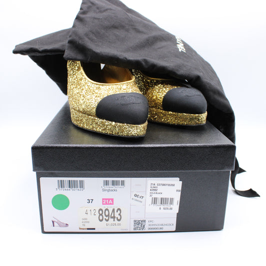 Chanel CoCo Gold Glitter Slingback Pumps Black Toe Caps