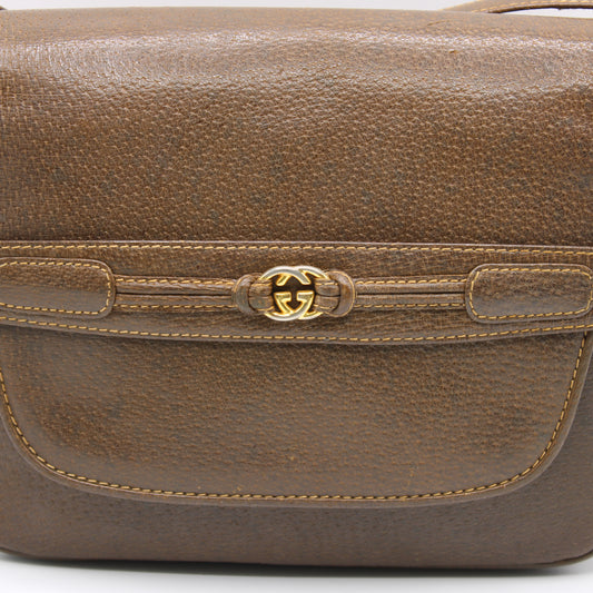 Gucci Brown Leather Shoulder Bag with Metal Logo on Flap