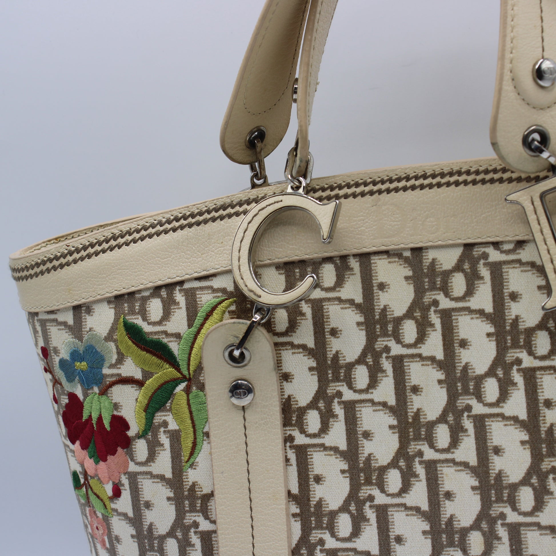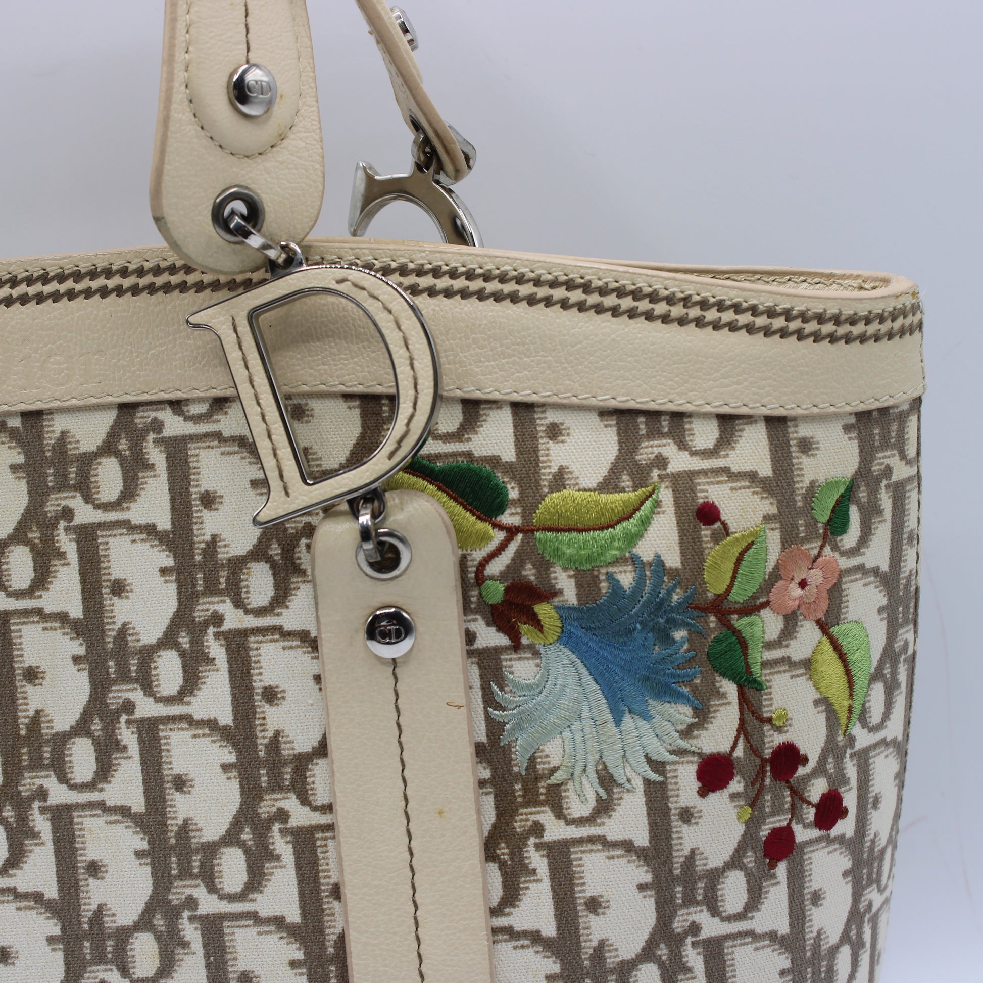 Christian Dior Beige Canvas Embroidered Oblique Floral Tote Bag