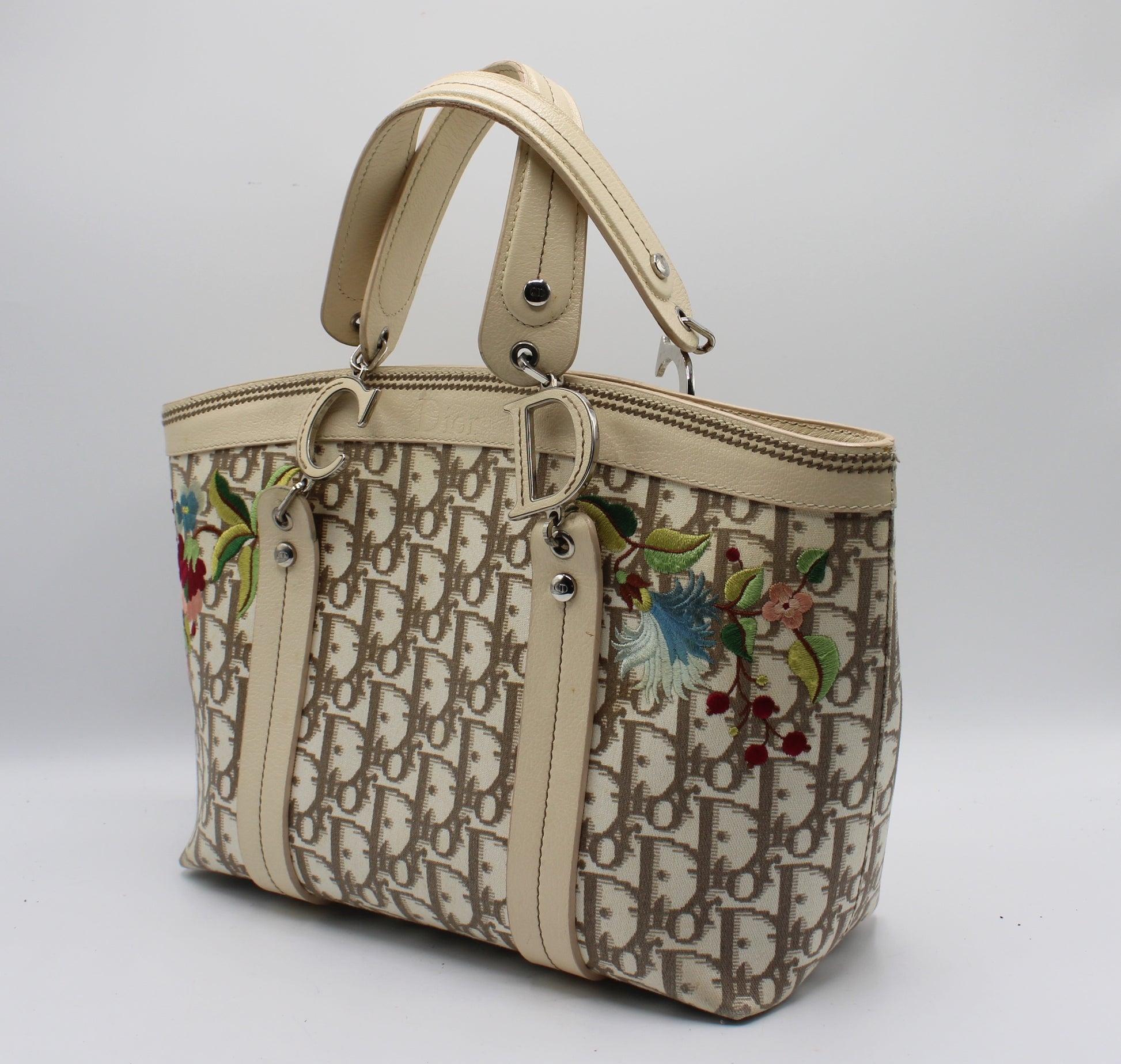 Stefany Bags Shoes and More presents this authentic Christian Dior tote bag, a rare collector’s gem that blends iconic monogram elegance with whimsical artistry. Crafted in Dior’s signature beige and cream oblique canvas, this piece stands apart for its unique multicolor floral embroidery—an uncommon and highly sought-after detail in vintage Dior bags. Vivid threads form red, blue, pink, and green flowers across both front panels, creating a striking contrast that speaks to Dior’s haute couture heritage. Cream leather trims and double handles frame the structure, while the iconic "C" and "D" letter charms accentuate the top with unmistakable branding. The top snap closure opens to a clean, tan fabric-lined interior with a zip pocket, ideal for organizing daily essentials. This 11 x 8 inch size offers a comfortably compact yet practical everyday carry, perfect for elevating any casual or dressy ensemble.