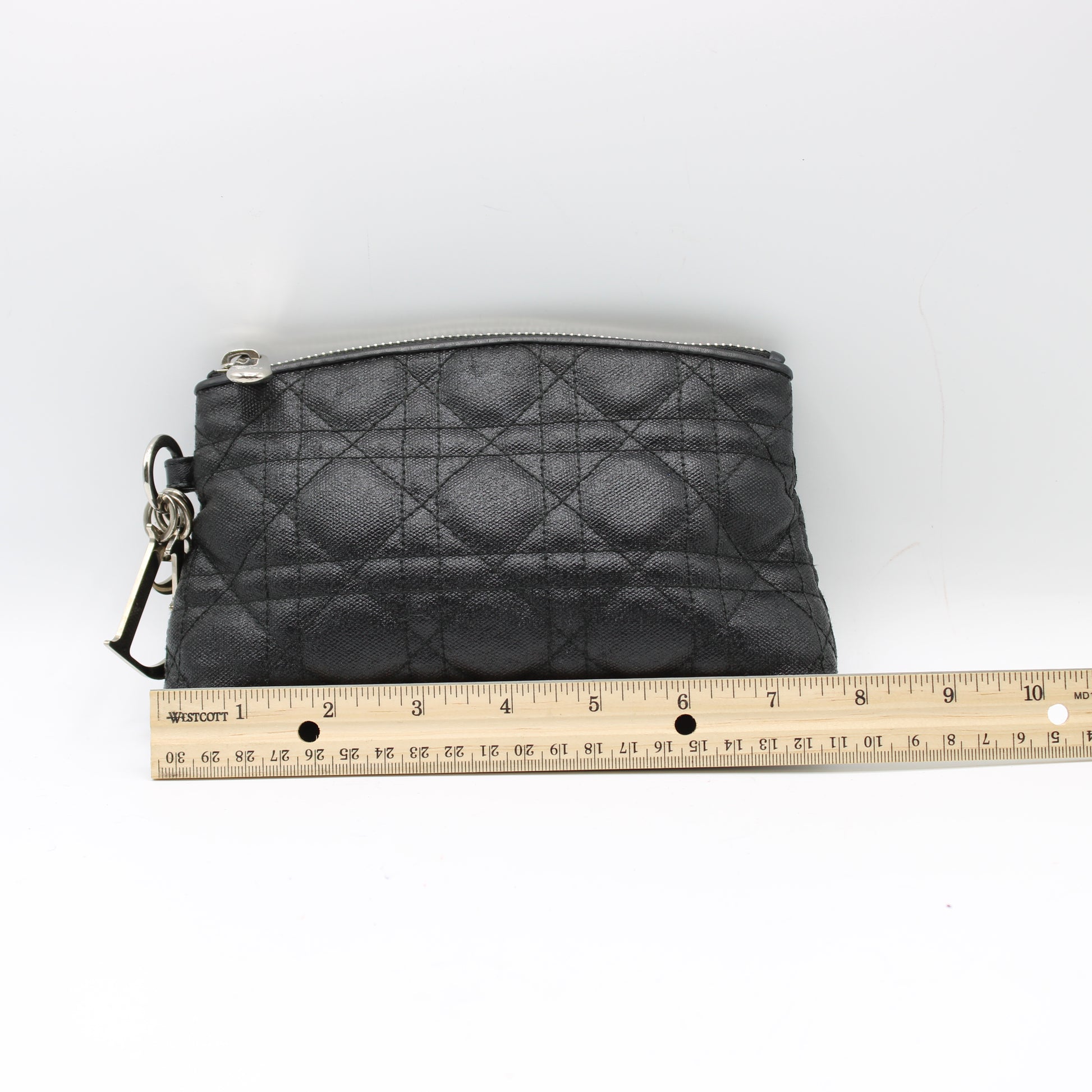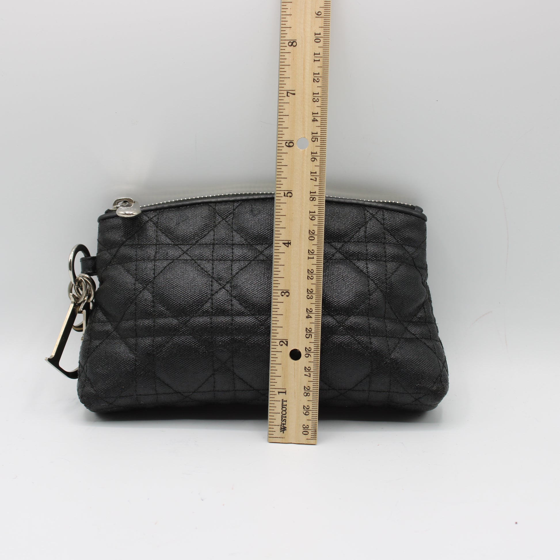 This Lady Dior pouch measures approximately 8 inches in width and 5 inches in height, making it the perfect size to carry your iPhone, keys, wallet, and small essentials. It features a secure zip-top closure and a lightweight, flexible form that works beautifully as a standalone clutch or an organizer within a larger bag. This item is in very good condition, with only minor wear on both the interior and exterior—none of which are noticeable during regular use. Please review all detailed images for a closer look at the item’s actual condition.