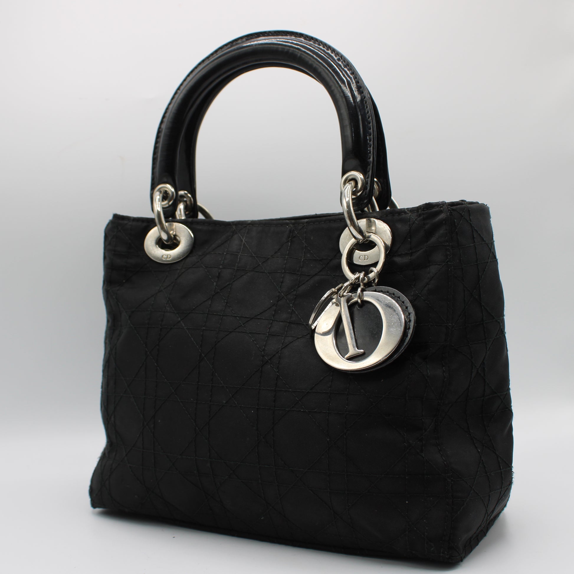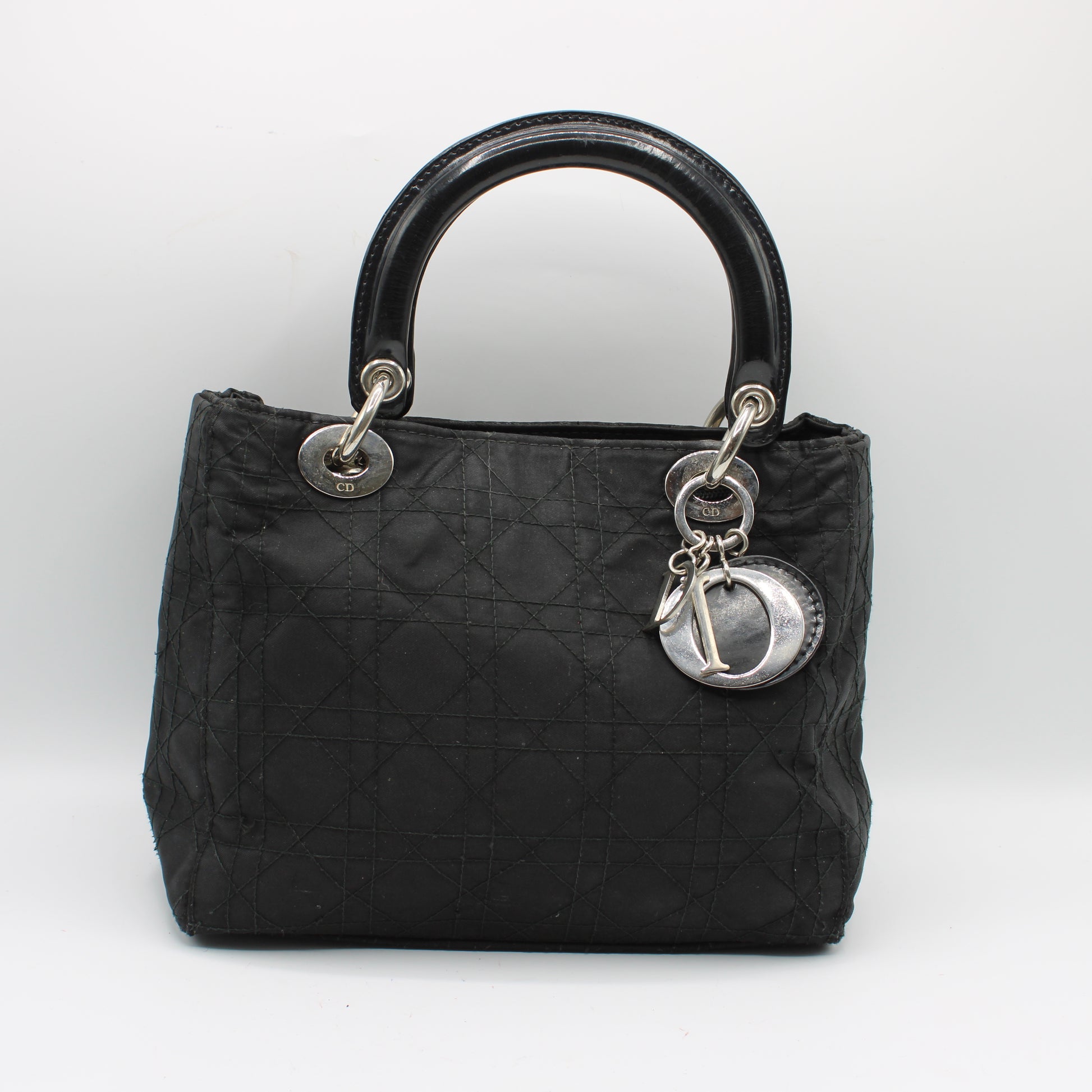 Stefany Bags Shoes and More proudly presents this authentic Christian Dior Lady Dior handbag crafted in classic black quilted canvas with the iconic Cannage pattern. This timeless vintage design features structured dual round handles, polished silver tone hardware, and the signature Dior logo charm gracefully hanging from the handle, instantly recognizable and endlessly elegant. Made in Italy, this Lady Dior showcases the house’s refined craftsmanship and remains a highly sought after silhouette among collectors searching for authentic vintage Dior bags available in Boston. Its lightweight canvas construction makes it practical for everyday wear while maintaining a luxurious presence suitable for both casual and elevated styling.