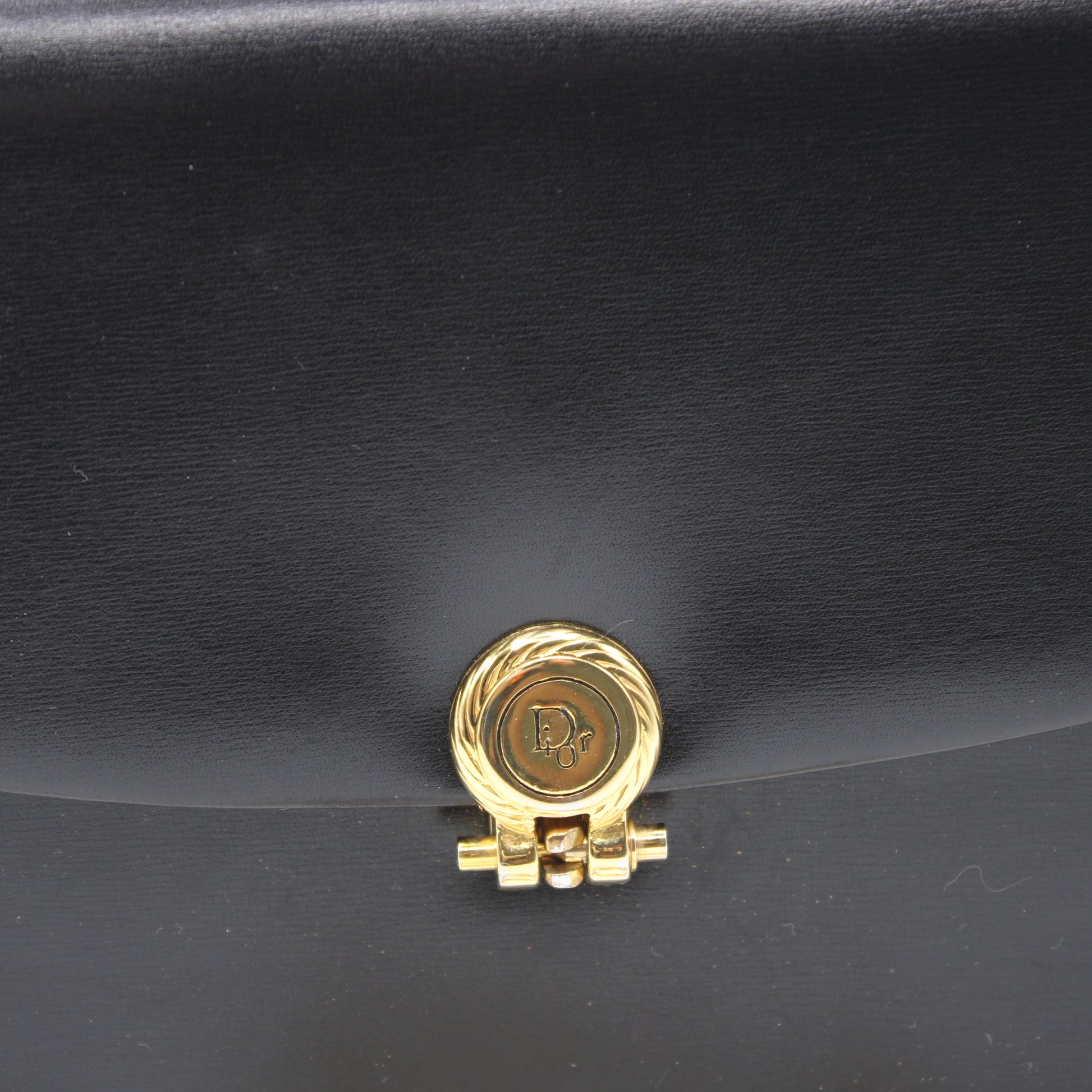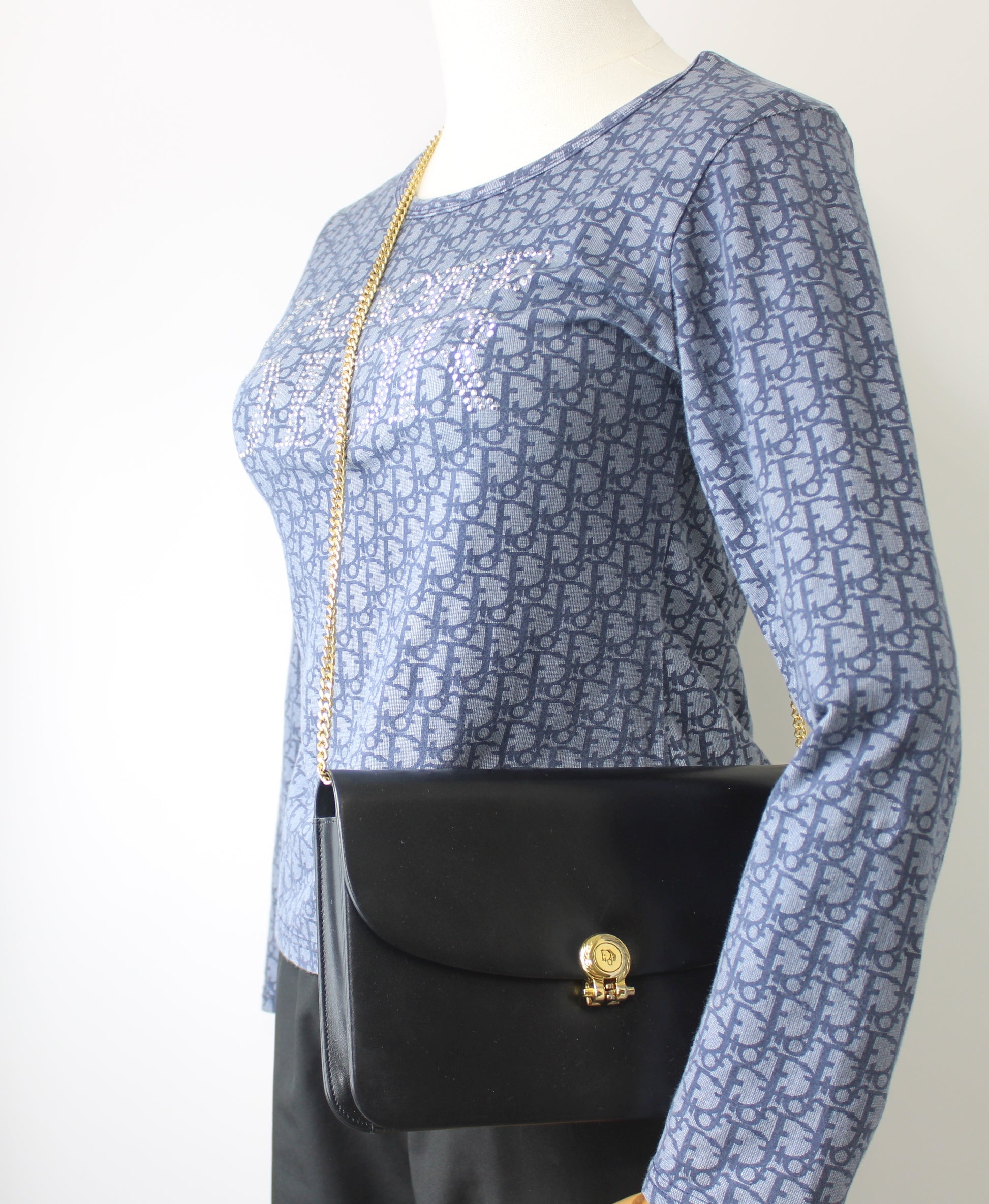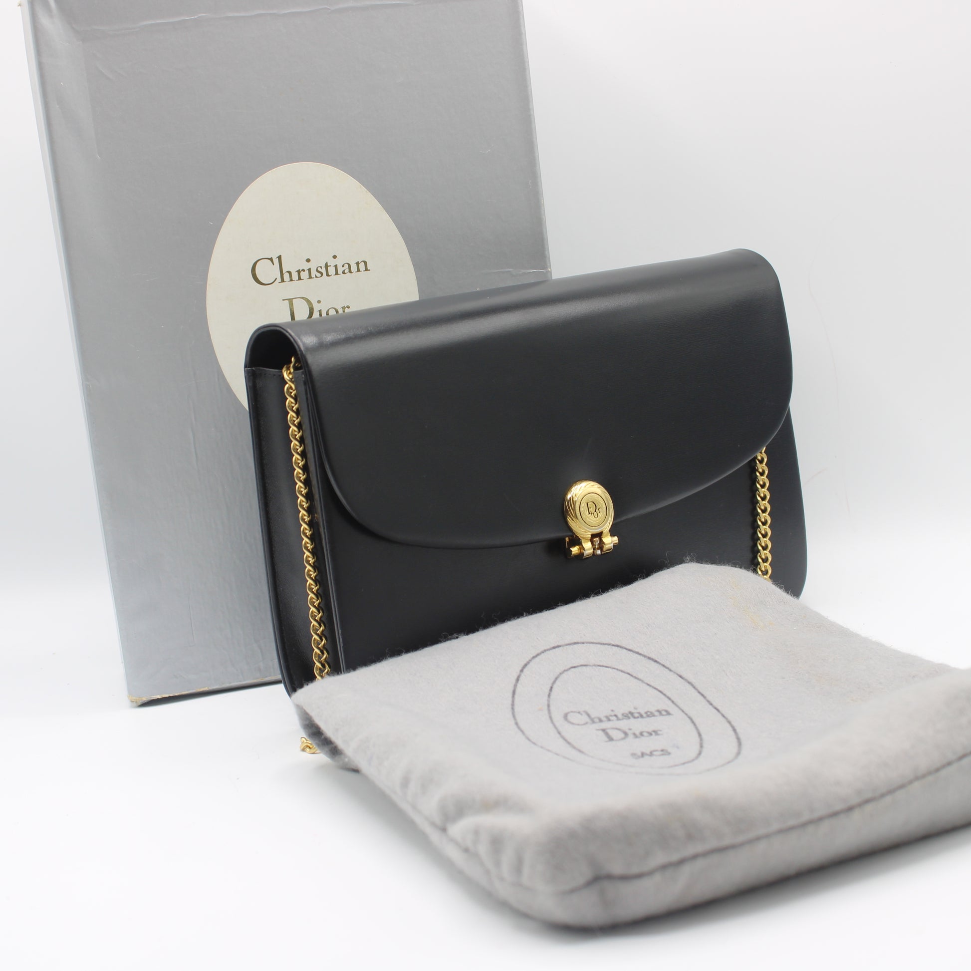 Stefany Bags Shoes and More presents this stunning vintage Christian Dior black leather flap bag, a refined piece crafted in France and finished with gold-tone hardware and a classic Dior twist-lock clasp. This structured silhouette showcases a smooth, elegant leather exterior that exudes sophistication. It features a luxurious gold chain strap that allows for versatile wear as a chic shoulder or crossbody bag, making it the perfect complement for both day-to-night transitions and timeless wardrobe styling.
