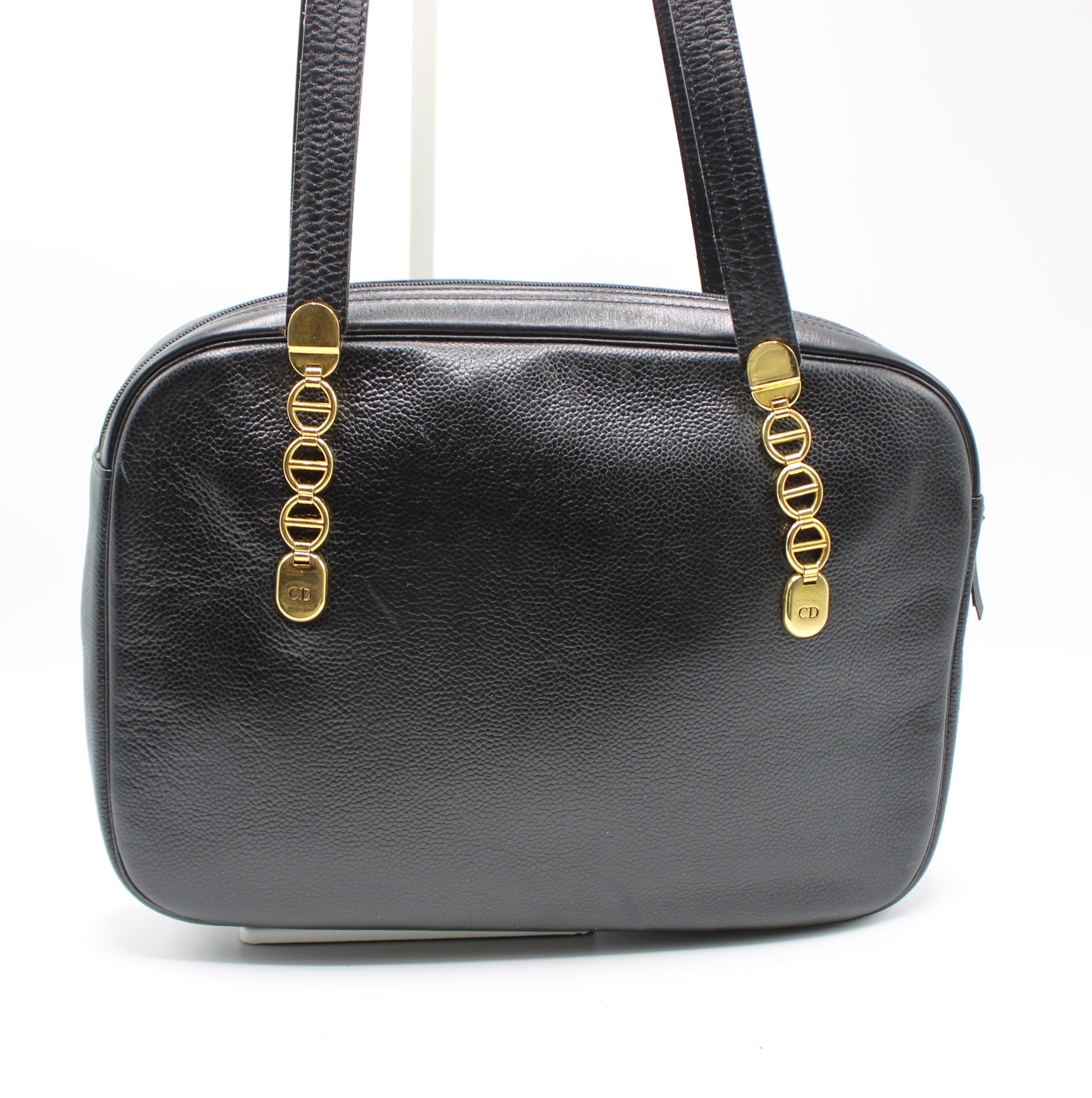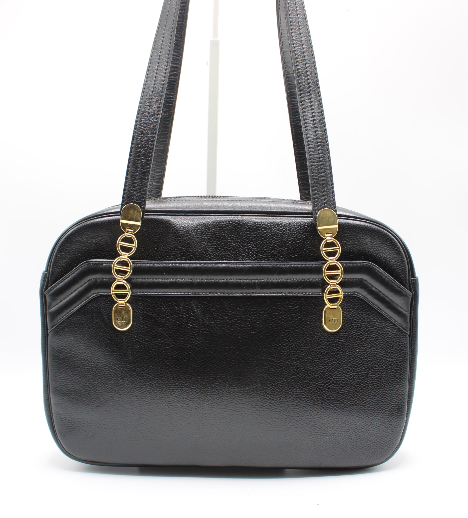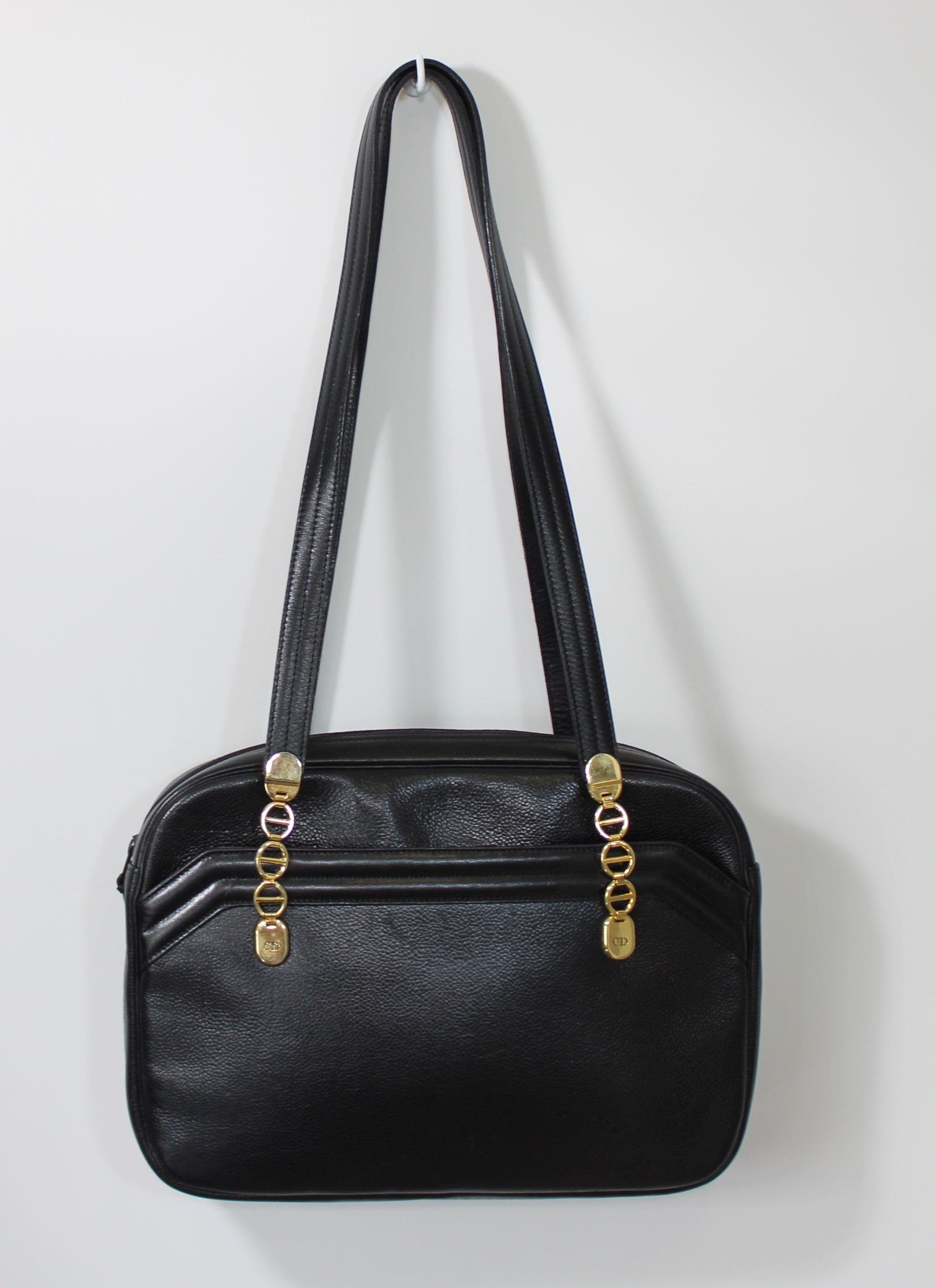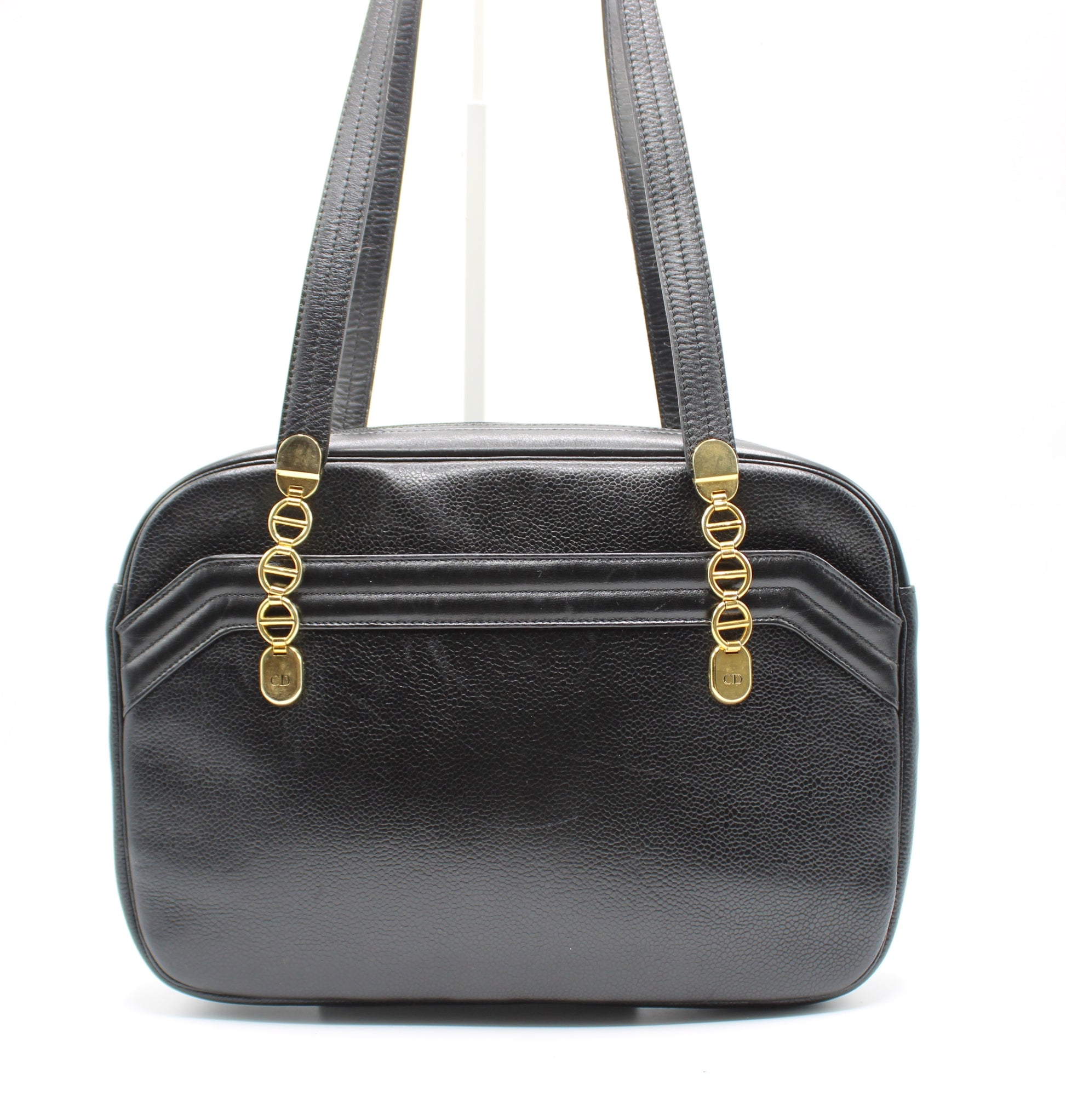 Stefany Bags Shoes and More proudly presents this authentic vintage Christian Dior black leather tote, a timeless luxury piece crafted in France and designed with understated elegance. Made from supple, all-leather construction, this tote features dual shoulder handles and refined gold-tone logo chain detailing on both the front and back, finished with subtle CD accents. Its structured yet versatile silhouette makes it an excellent everyday designer bag, easily transitioning from work to travel or city wear. This classic Dior tote reflects enduring Parisian style and remains highly sought after among collectors of authentic vintage Dior bags available in Boston.