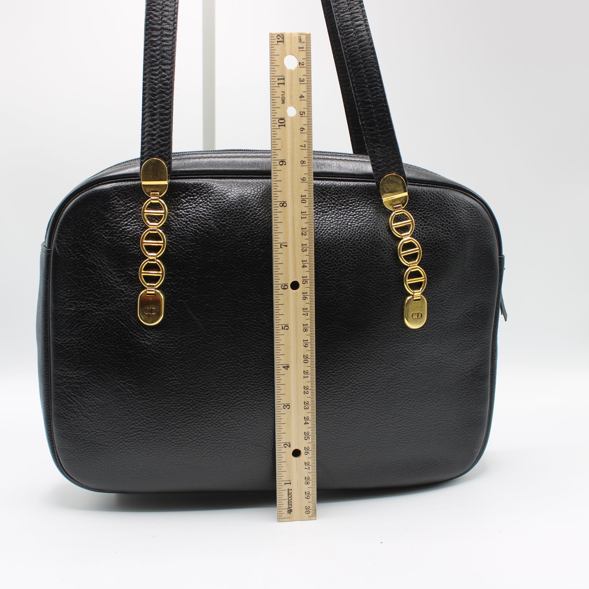 This Dior leather tote measures approximately 11 inches wide by 8 inches high and can comfortably fit essentials, with space that may accommodate a MacBook Air depending on configuration. It is an excellent option for those searching for authentic vintage Christian Dior bags, luxury vintage totes, or designer handbags available in Boston.