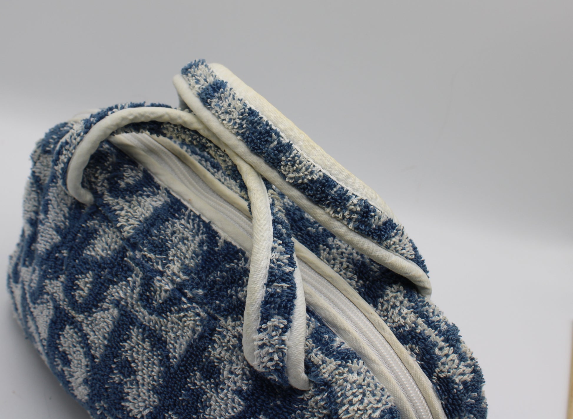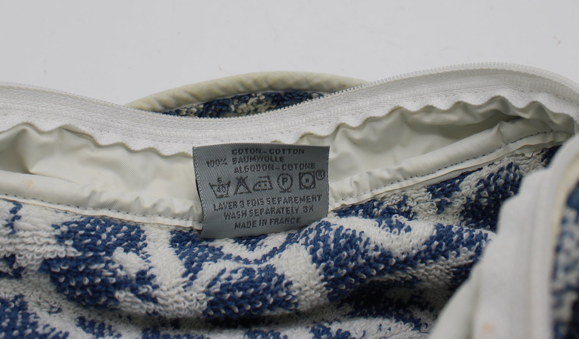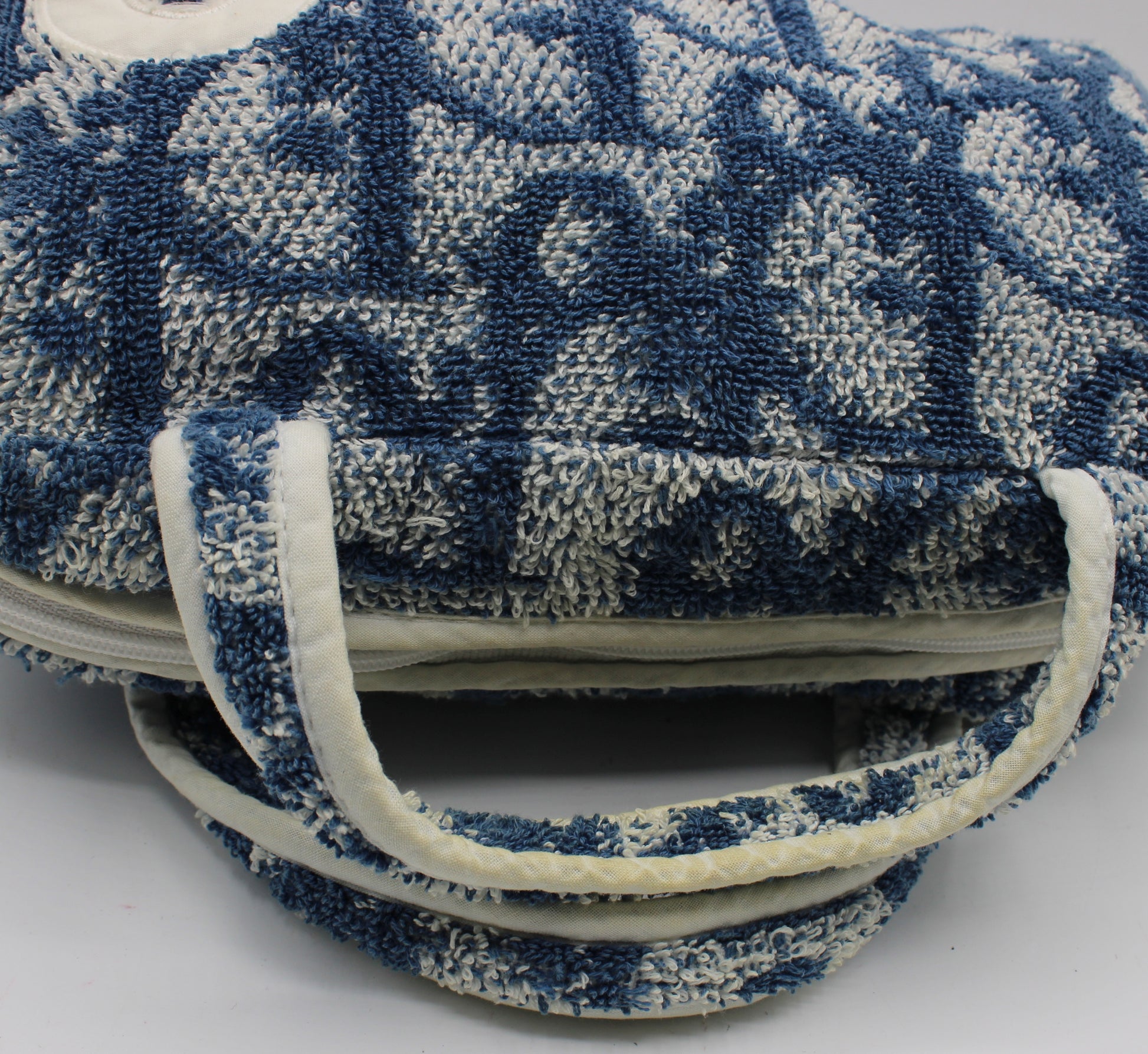 This piece is in very good condition with minimal wear inside and out, consistent with gentle vintage use and not noticeable during daily wear. The white piping and handles show only slight age-related softness, while the terry cloth remains vibrant and plush. The interior is clean with light signs of past use. As always, please refer to all detailed photos to assess the condition and texture variations typical of this material.