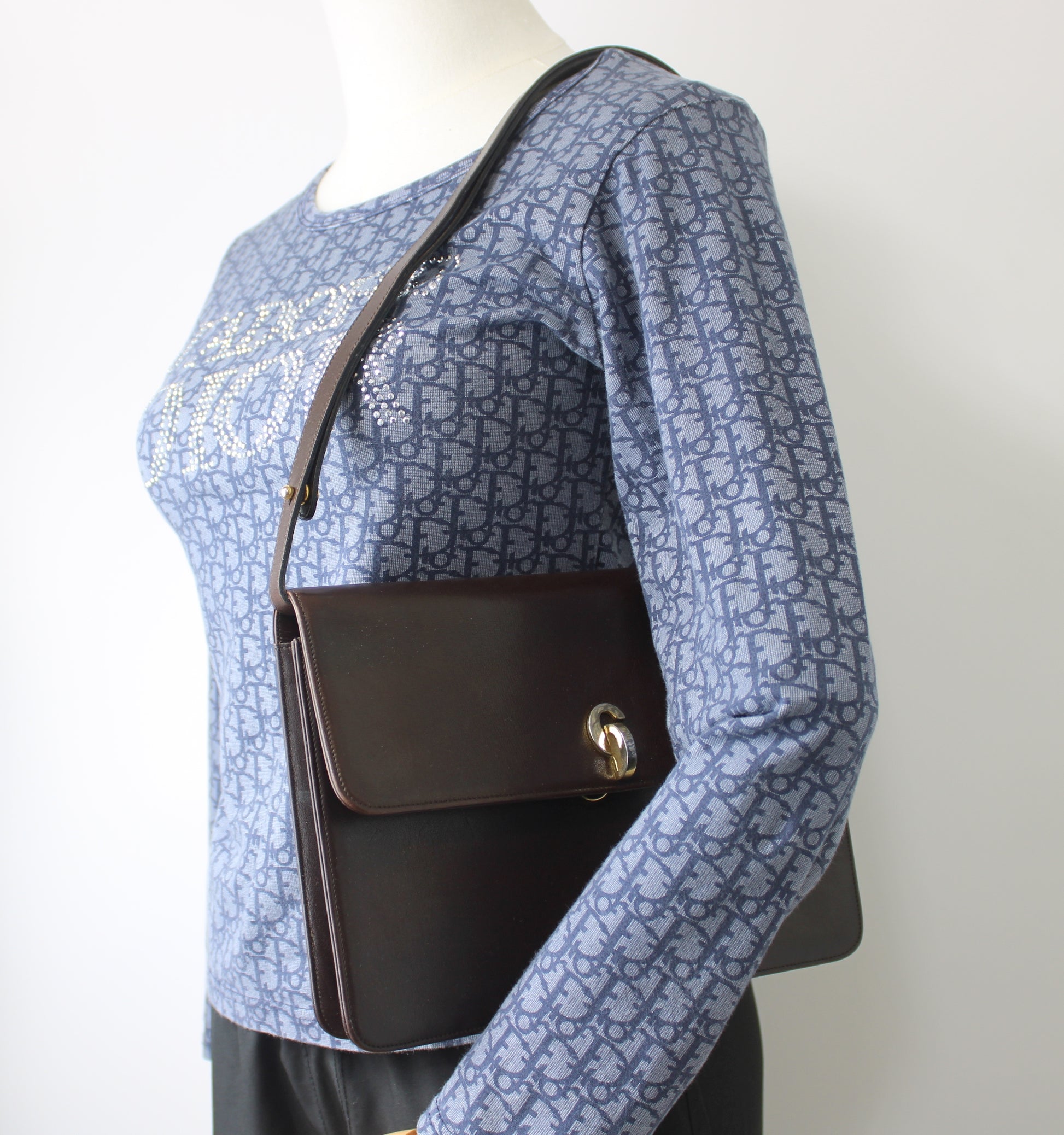 Stefany Bags Shoes and More presents this authentic Christian Dior brown leather shoulder bag, a timeless addition to any vintage luxury collection. Expertly crafted in France, this structured shoulder bag features smooth, rich brown leather and a sharp rectangular silhouette. The focal point is its elegant 3D gold-tone “CD” clasp on the flap closure, offering both security and refined style. A rare find among authentic vintage Christian Dior bags, this piece boasts a minimal, sophisticated look that transitions effortlessly from daywear to evening elegance.