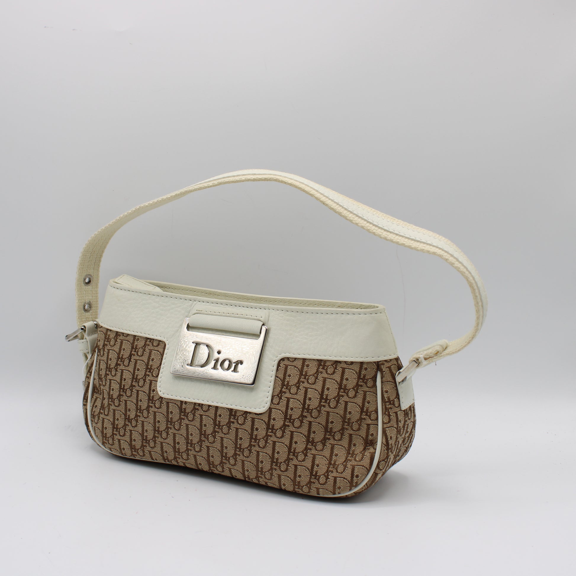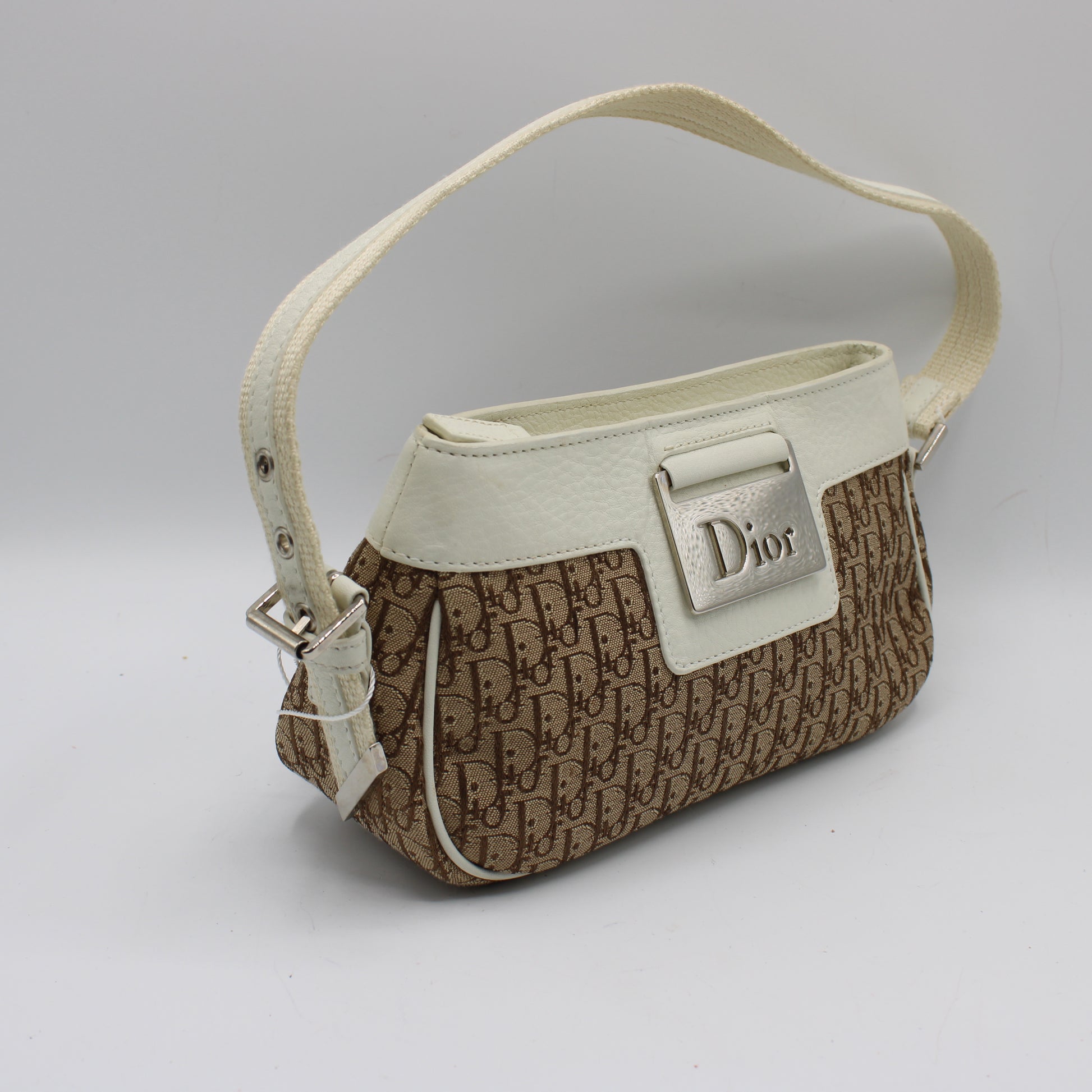 Stefany Bags Shoes and More proudly presents this authentic vintage Christian Dior mini shoulder bag, a timeless early-2000s design crafted in iconic brown Dior monogram canvas with elegant white leather trim. This compact yet statement-making piece features the signature Dior logo plaque on the front, a structured silhouette, and refined leather detailing that highlights the house’s unmistakable Parisian heritage. The removable and adjustable strap allows for versatile styling as a shoulder bag or underarm bag, making it a perfect companion for both casual daytime wear and elevated evening looks. This piece is ideal for collectors searching for authentic vintage Dior bags available in Boston and beyond.