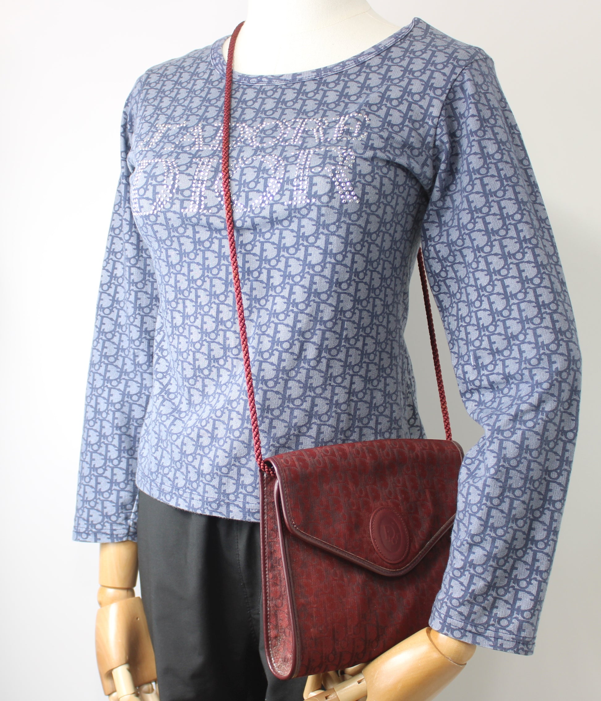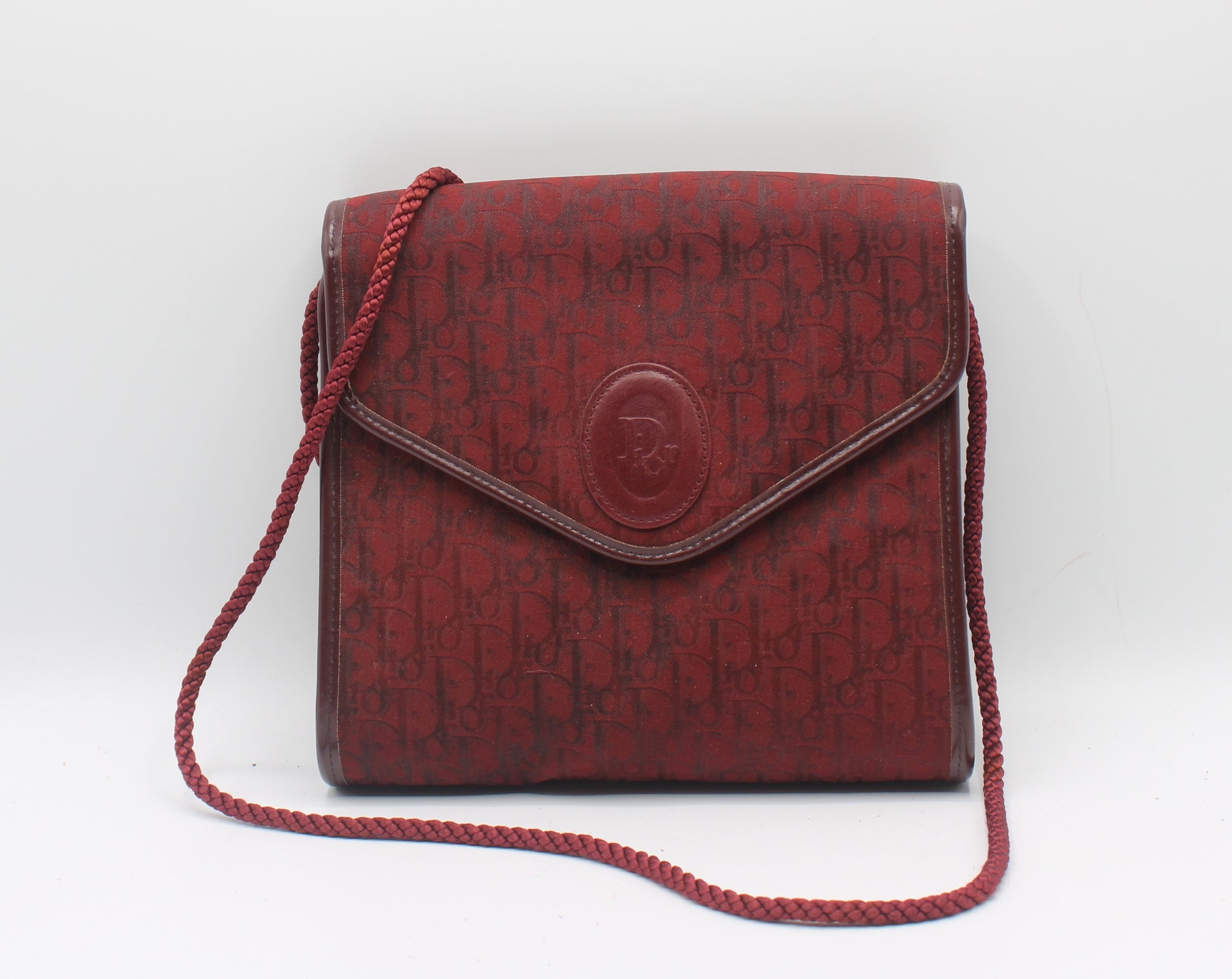 The bag is graded in very good vintage condition, with only minor wear inside and out that is not noticeable during regular use. The interior remains clean, maintaining its original Dior stamping that reads "Christian Dior Made in France Modèle Exclusif," which authenticates its origin and quality. The exterior canvas has held its rich burgundy color beautifully over time, and the leather-trimmed flap keeps its structure intact. Buyers are encouraged to review all detailed pictures provided to assess its vintage charm and current state.