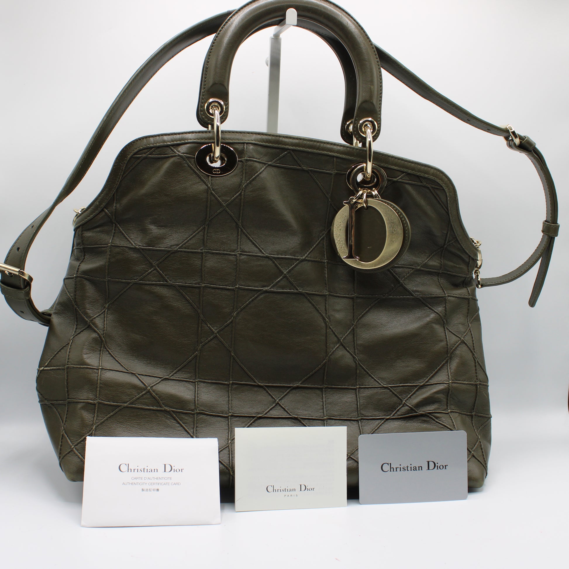Stefany Bags Shoes And More presents this authentic Christian Dior Granville Large Tote, crafted in rich khaki leather with the signature overstitch Cannage pattern and elegant gold tone hardware. This vintage model, dating from the late 2000s to early 2010s, features dual round top handles, a removable crossbody strap for versatile two way wear, and a spacious interior with multiple compartments ideal for daily use. Made in Italy, it highlights Dior’s refined craftsmanship and remains a highly sought after style among collectors searching for authentic vintage Christian Dior bags, especially those looking for premium vintage bags in Boston. This bag has been professionally authenticated, and a certificate of authenticity is attached. Original Christian Dior authentication cards are also included, as shown in the images.