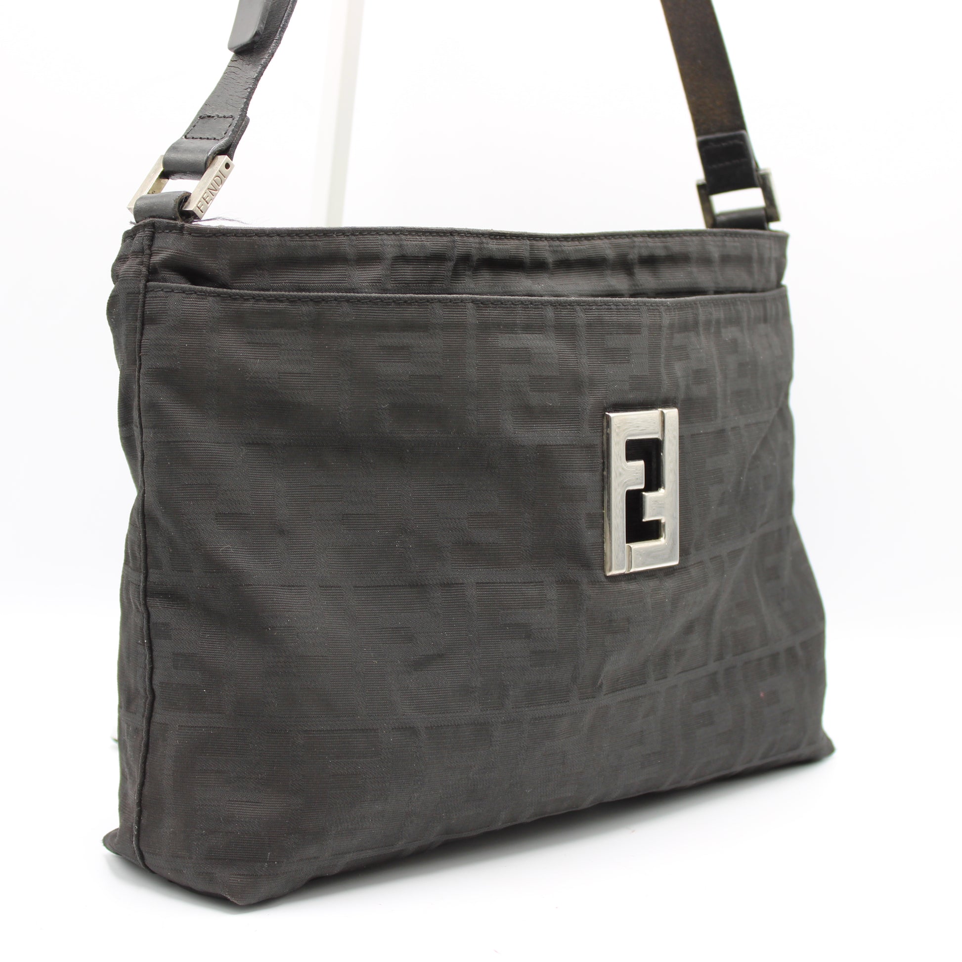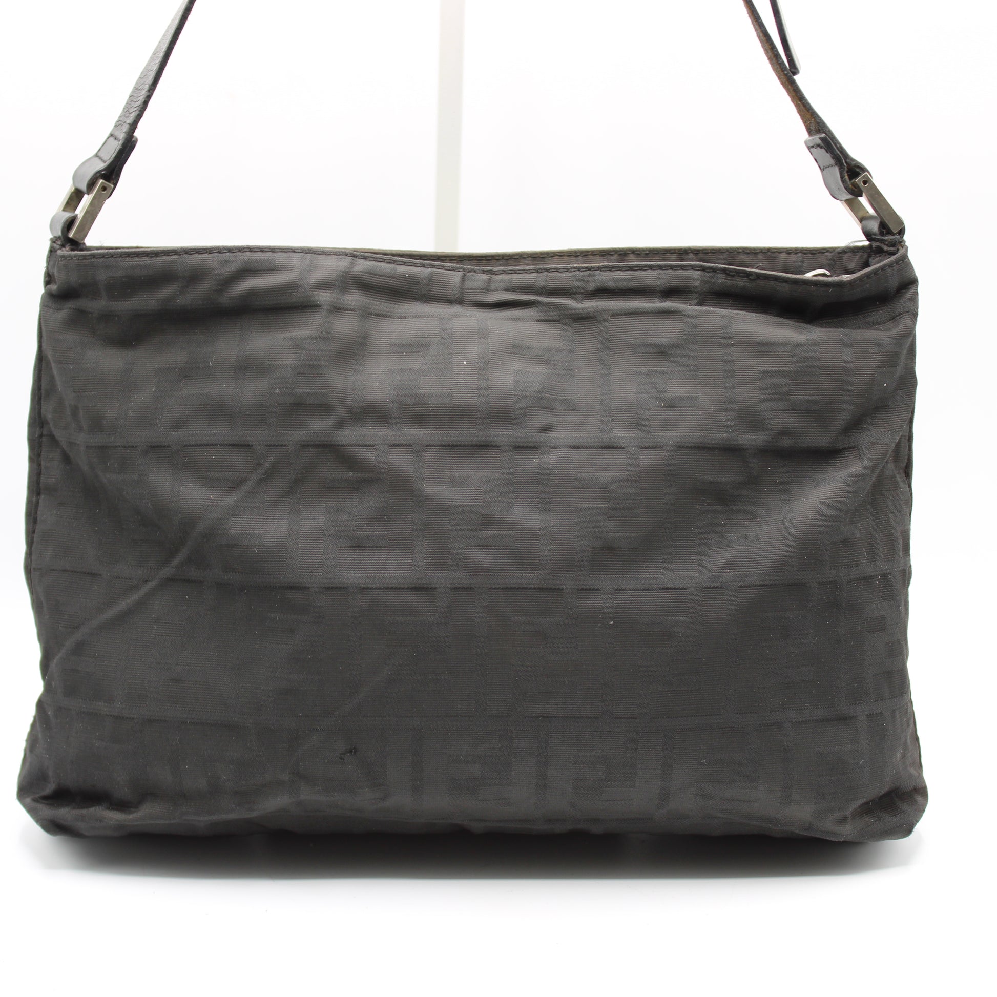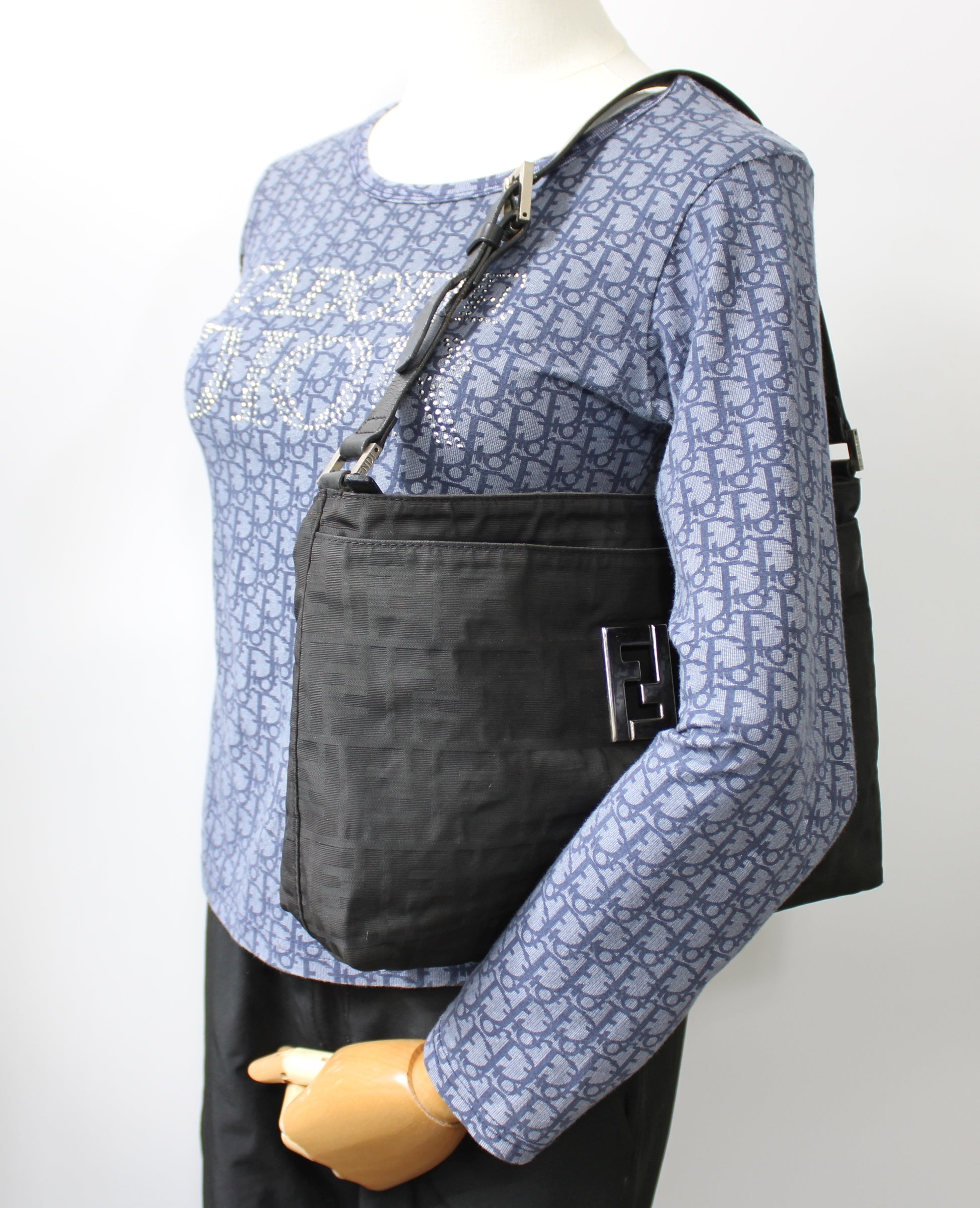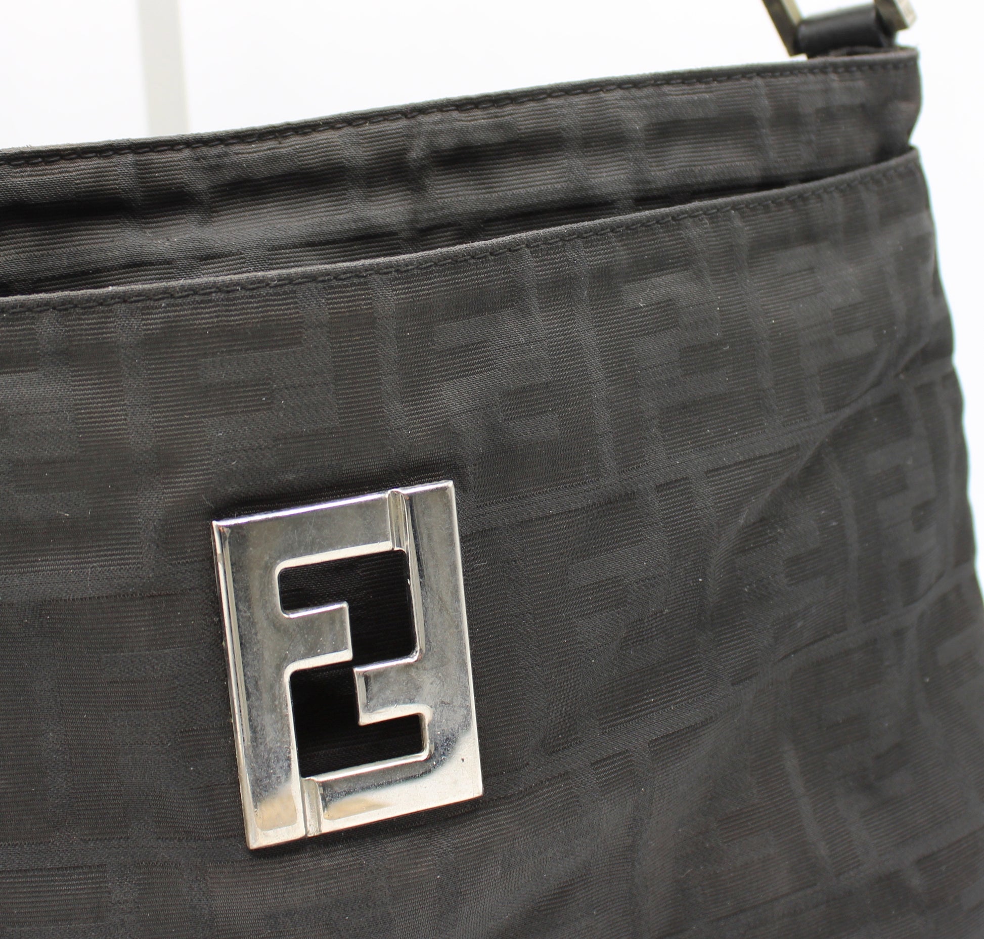 Stefany Bags Shoes and More proudly presents this authentic vintage Fendi Black Zucca Print Shoulder Bag, a timeless icon from the Italian fashion house. Crafted in classic black Zucca monogram canvas with black leather trim, this shoulder bag features a sleek, structured silhouette designed for everyday elegance. The adjustable single leather shoulder strap allows comfortable wear, while the polished metal Fendi logo plaque on the front adds a refined designer statement. With multiple interior compartments and a secure zip-top closure, this bag offers both style and practical organization, making it ideal for daily use, work, or travel. This piece reflects the enduring appeal of authentic vintage Fendi bags sought after by collectors and fashion enthusiasts alike, especially those searching for luxury vintage bags available in Boston.