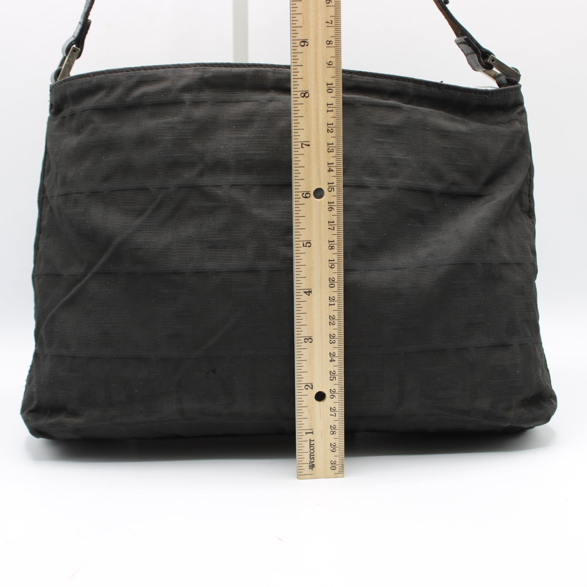 This authentic vintage Fendi shoulder bag measures approximately 12 inches wide by 9 inches high, offering ample space for daily essentials without feeling bulky.