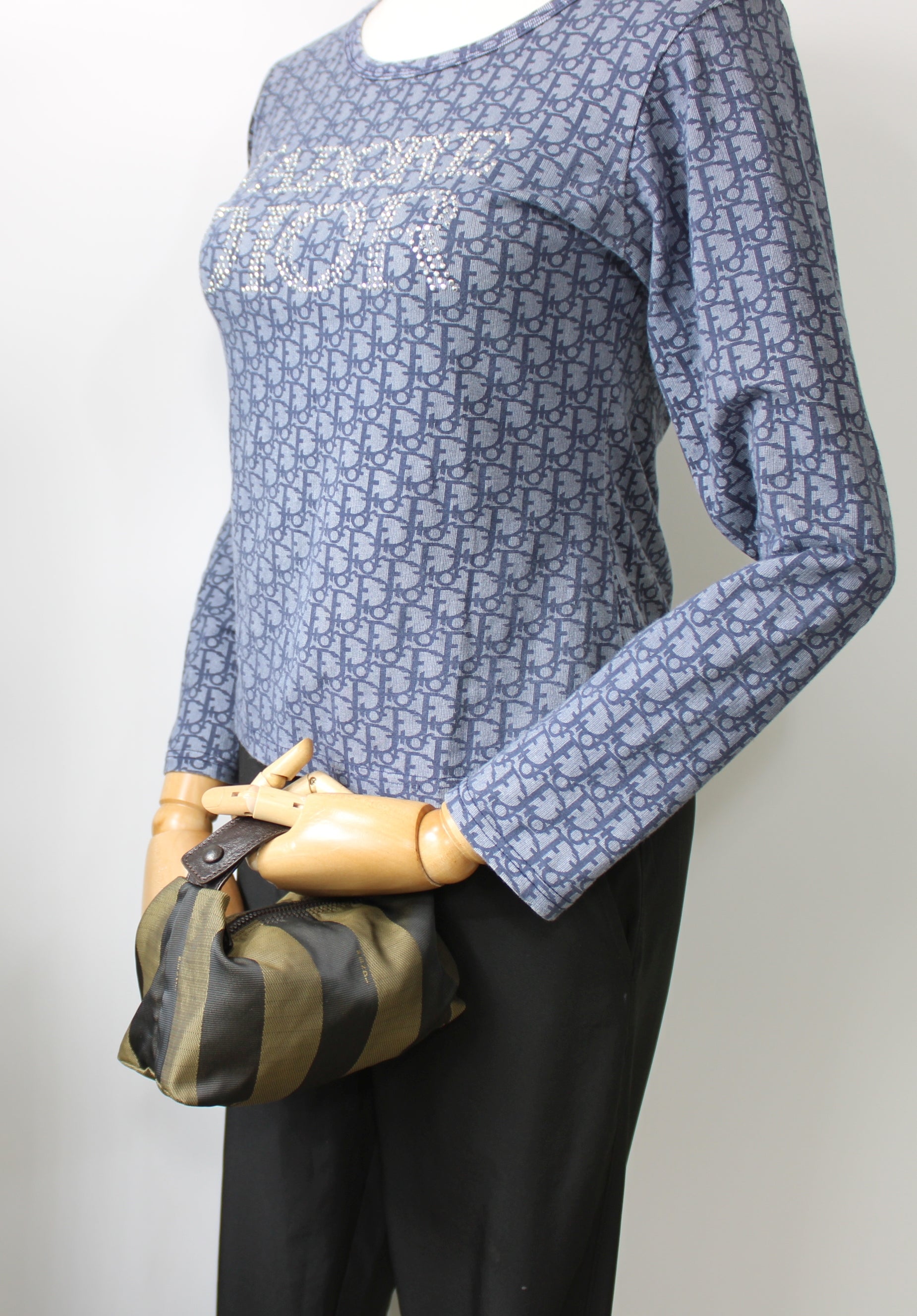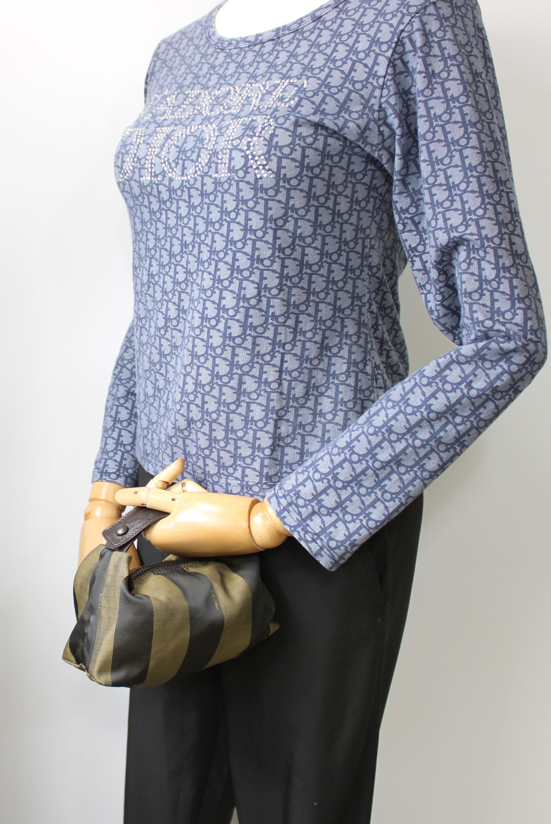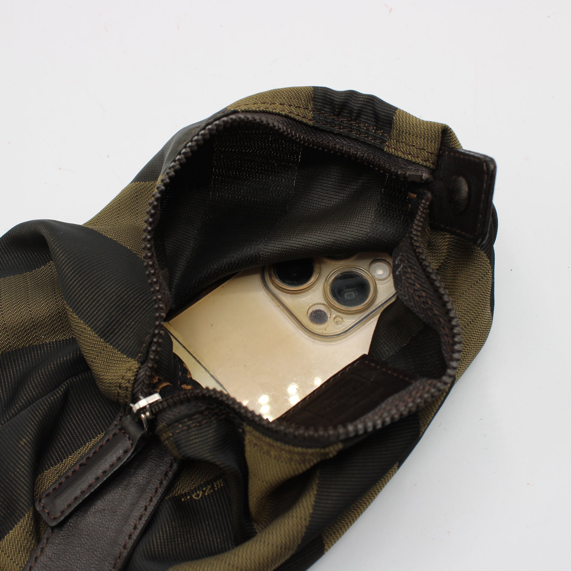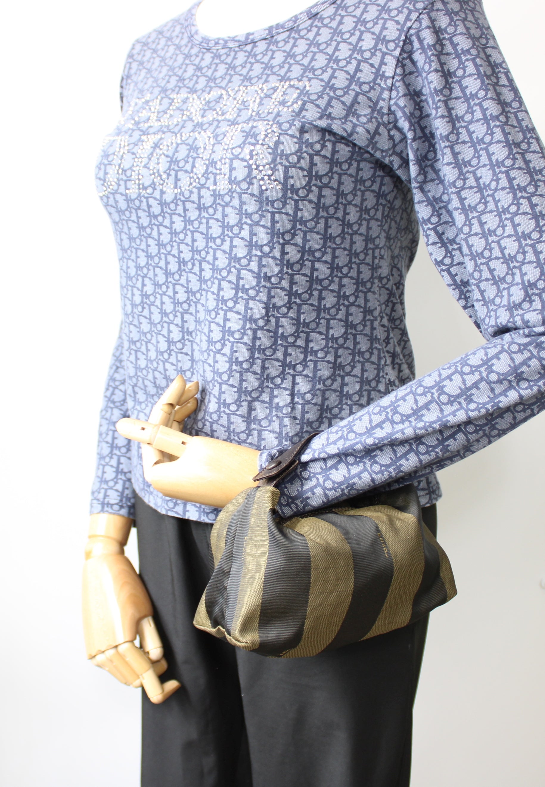 Stefany Bags Shoes and More proudly presents this authentic vintage Fendi handbag pouch crafted in the iconic Pequin striped canvas pattern. Featuring classic brown and olive tones with a structured silhouette, this timeless piece is accented by a rich brown leather top handle and leather-trimmed zip closure. Compact yet functional, it comfortably fits an iPhone and daily essentials, making it an ideal choice for casual outings, travel, or as a chic grab-and-go pouch. This design reflects Fendi’s enduring heritage and is highly sought after among collectors searching for authentic vintage Fendi bags available in Boston.