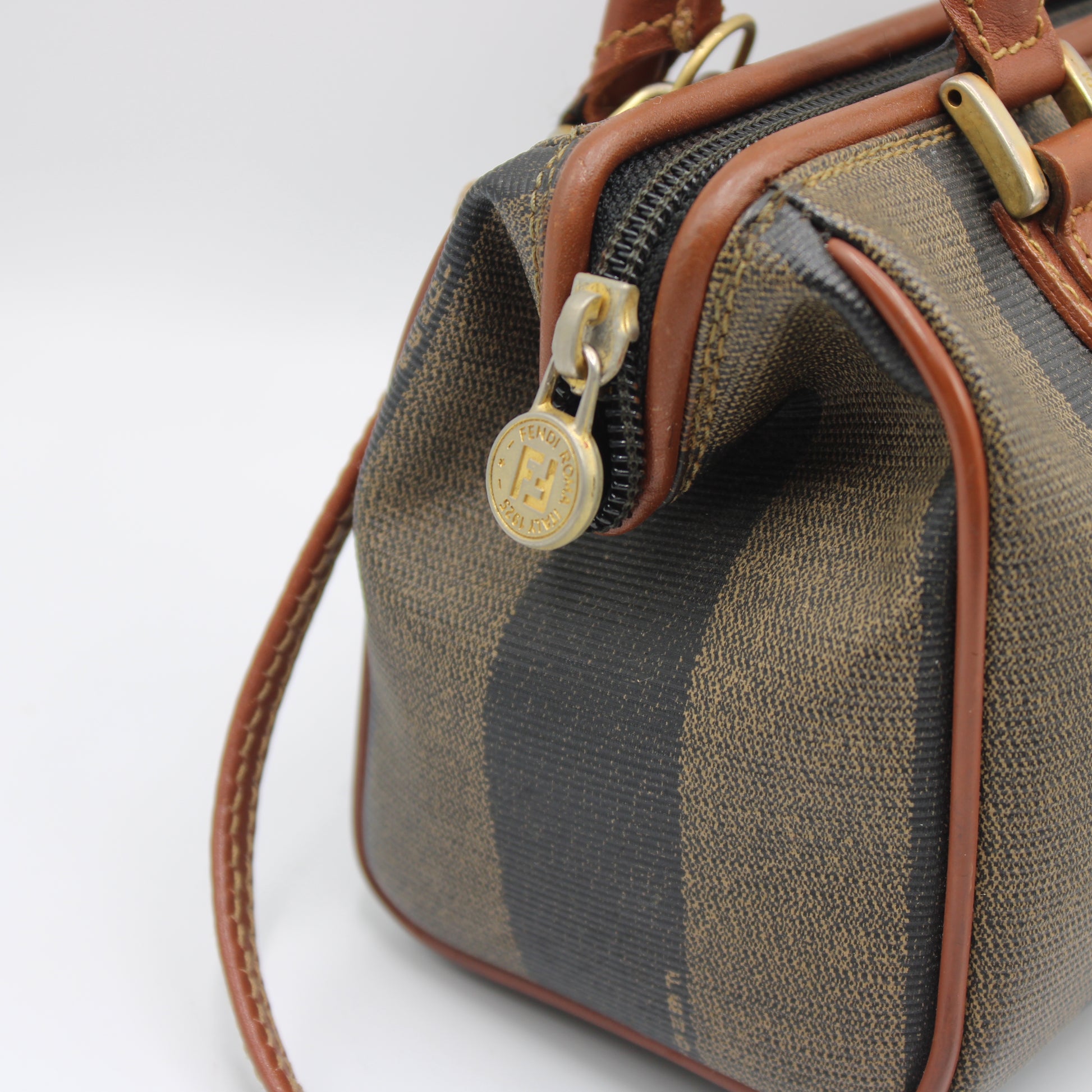 Stefany Bags Shoes and More presents this authentic vintage Fendi mini Boston bag in the classic Pequin stripe canvas, a design that first debuted in the 1980s. Crafted in Italy during the Fendi S.A.S. era, this structured mini Boston silhouette features the brand's iconic vertical brown and black stripes, smooth leather trim, and gold-tone hardware. The round Fendi logo medallion centered on the front panel confirms its timeless heritage. It comes with dual rolled leather top handles and a detachable crossbody strap, allowing for two-way wear — handheld or hands-free on the go.