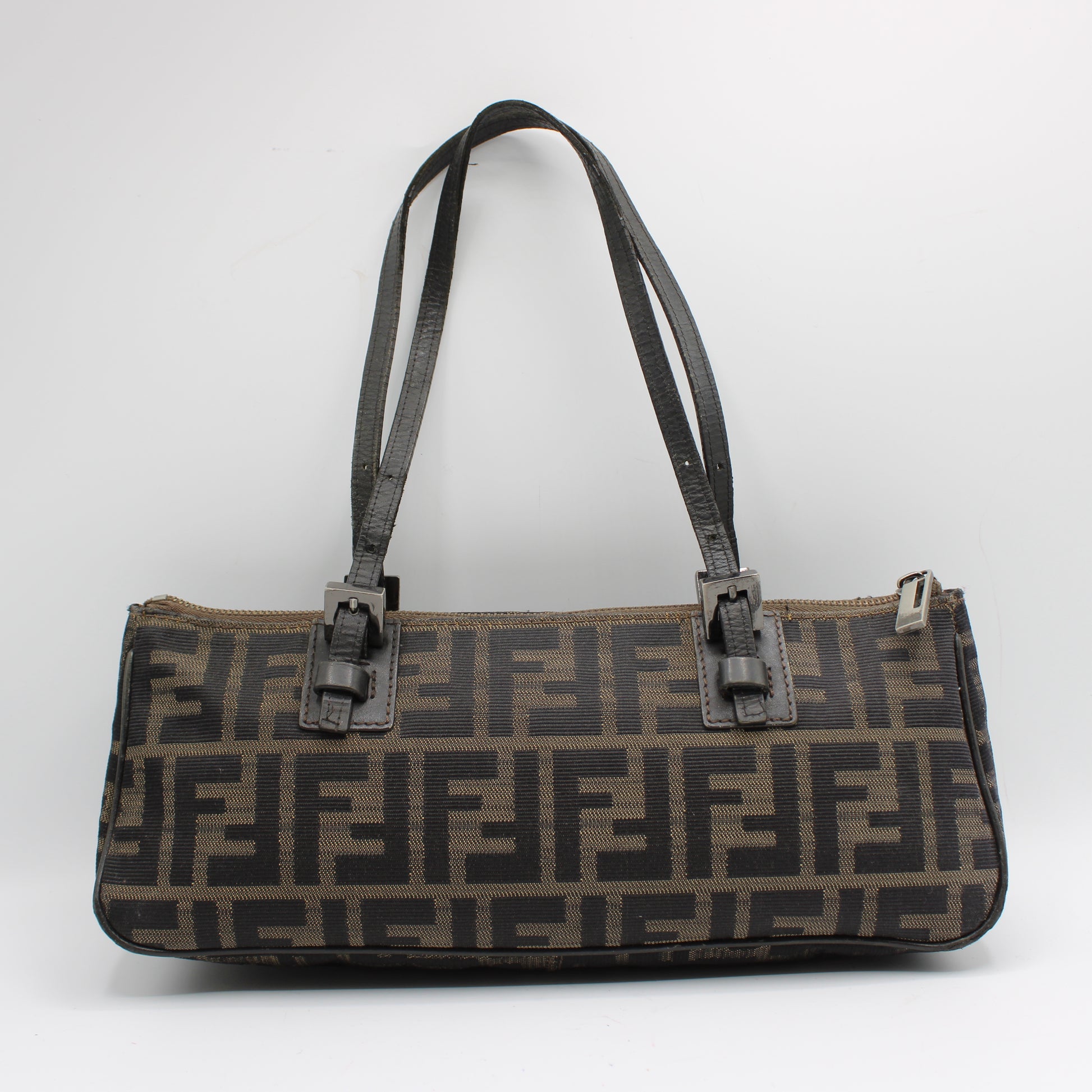 Stefany Bags Shoes and More proudly presents this authentic vintage Fendi rectangular mini tote, crafted in the iconic brown Zucca monogram canvas with dark leather trim and adjustable leather shoulder straps. This timeless Fendi silhouette features a sleek rectangular shape, a secure top zipper closure, and silver-tone hardware, making it both practical and effortlessly stylish. A classic early-2000s design, this piece reflects the enduring popularity of logo-driven luxury, aligning perfectly with current 2025 trends favoring compact vintage statement bags. Ideal for everyday use or as a chic shoulder bag, it is a standout choice for collectors seeking authentic vintage Fendi bags available in Boston.