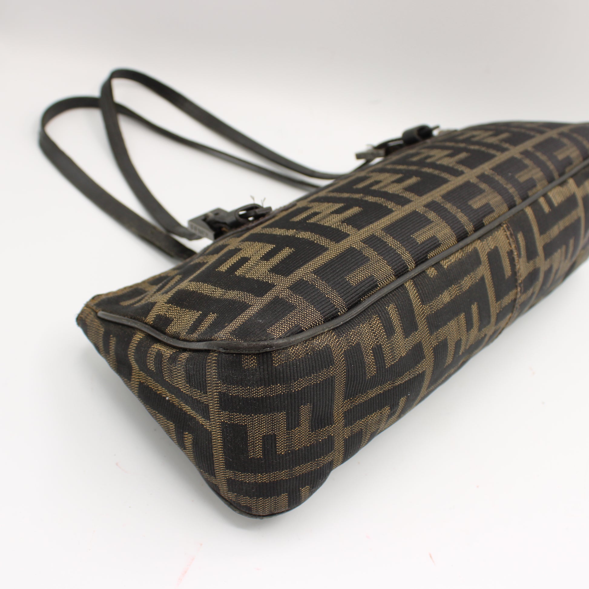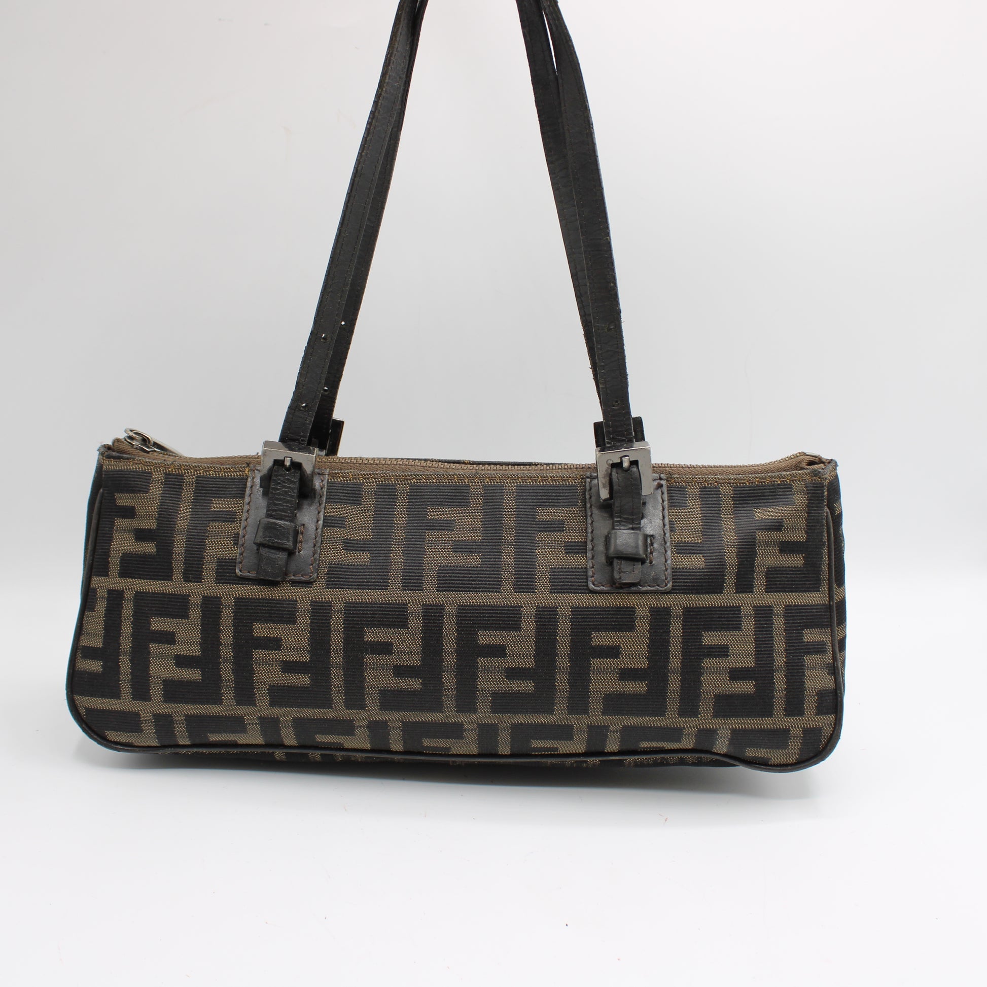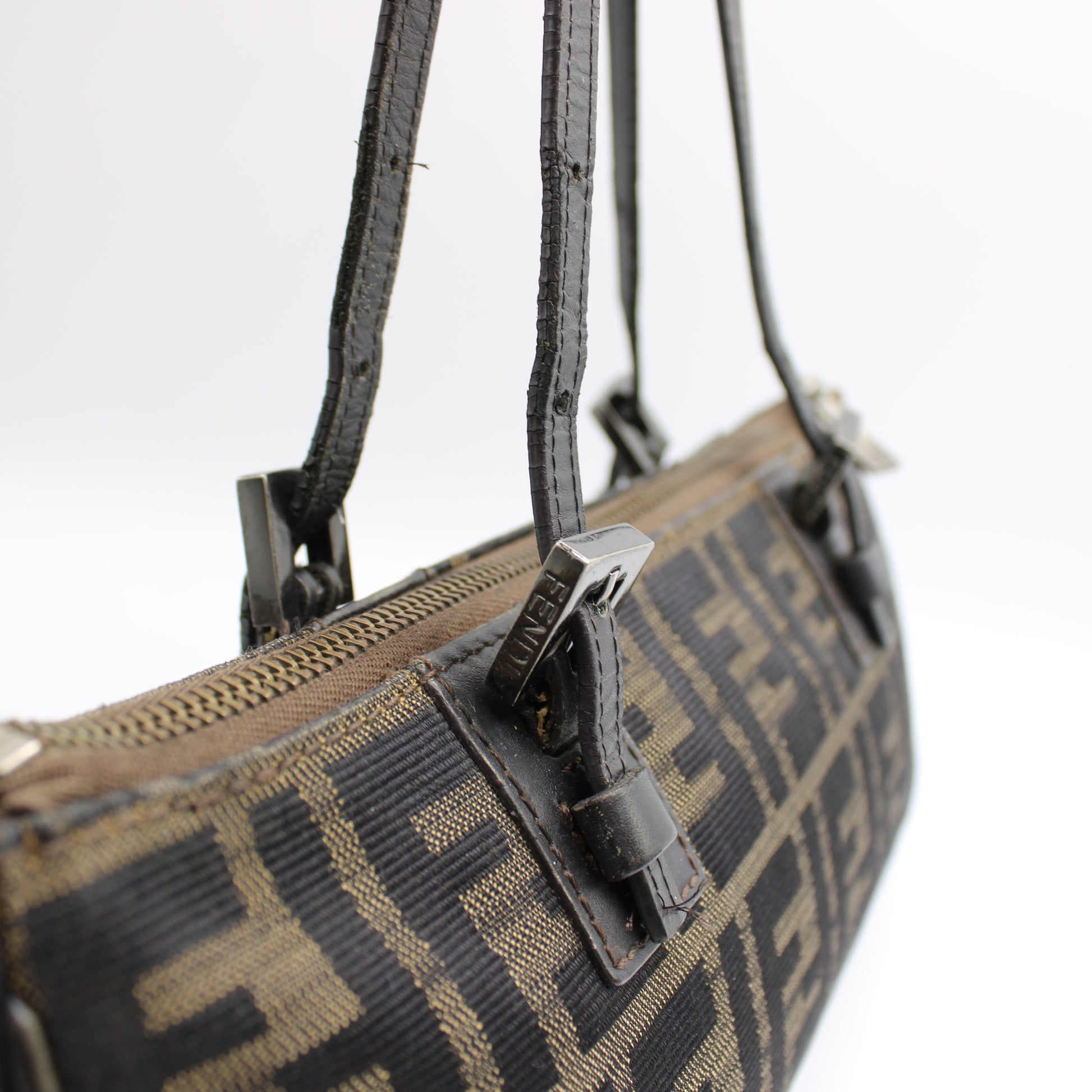 This bag is in Very Good vintage condition. The canvas remains strong and well-preserved with clear Zucca print throughout. There is visible wear on the leather trim and straps, including surface creasing and edge wear, consistent with age and gentle use. Minor wear is present inside and out but is not noticeable during daily wear. The interior lining is clean overall, featuring a zip pocket and Fendi leather logo tag. Please refer closely to the detailed photos for the most accurate representation of condition.