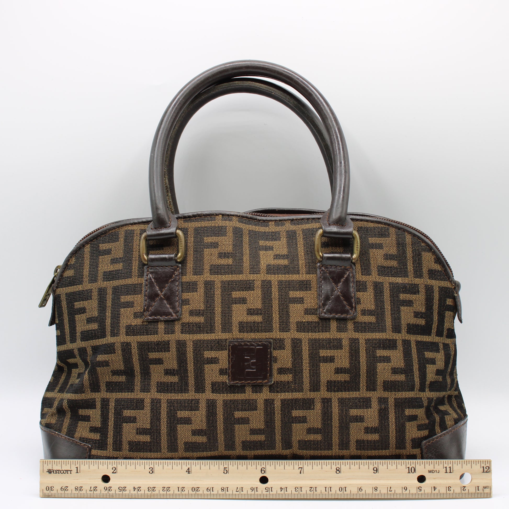 Stefany Bags Shoes and More presents this authentic Fendi Brown Zucca FF Print Mini Boston Bag, a timeless and iconic vintage piece. Crafted from Fendi's signature Zucca monogram canvas, this bag is enhanced with luxurious brown leather details, including sturdy handles and reinforced bottom edges. A leather logo patch embellishes the front, adding a touch of elegance to the already sophisticated design. The bag features a secure zip closure with branded Fendi hardware and opens to a spacious brown leather-lined interior, offering a convenient zip pocket for easy organization. With dimensions of 12 inches in width and 8 inches in height, this compact yet practical piece is perfect for daily use or weekend outings.