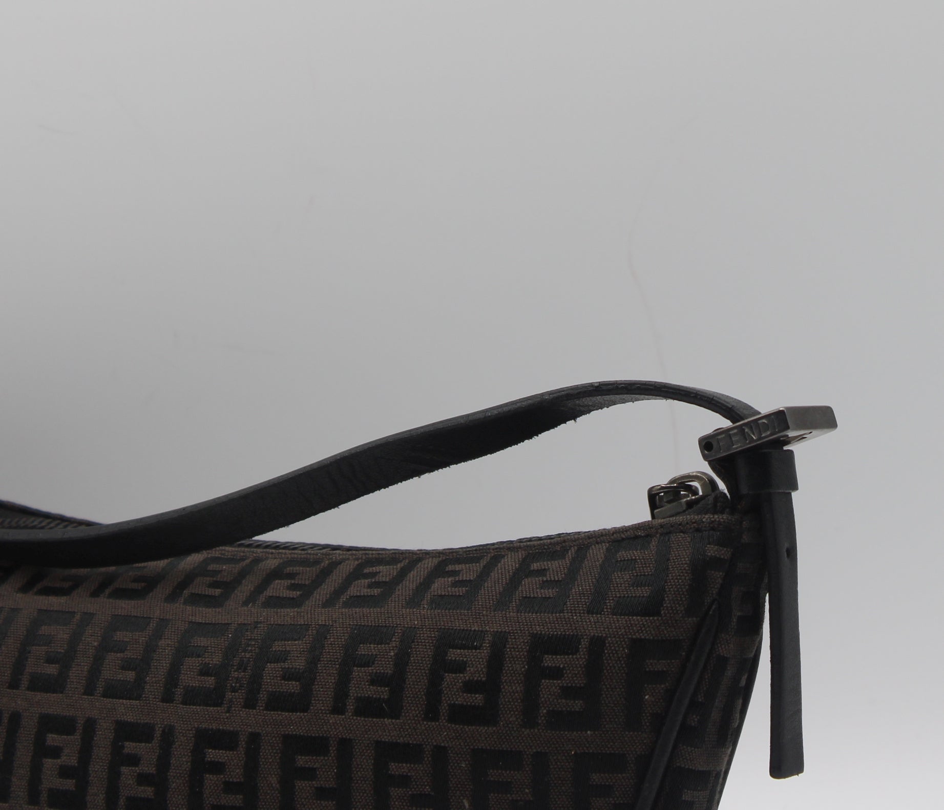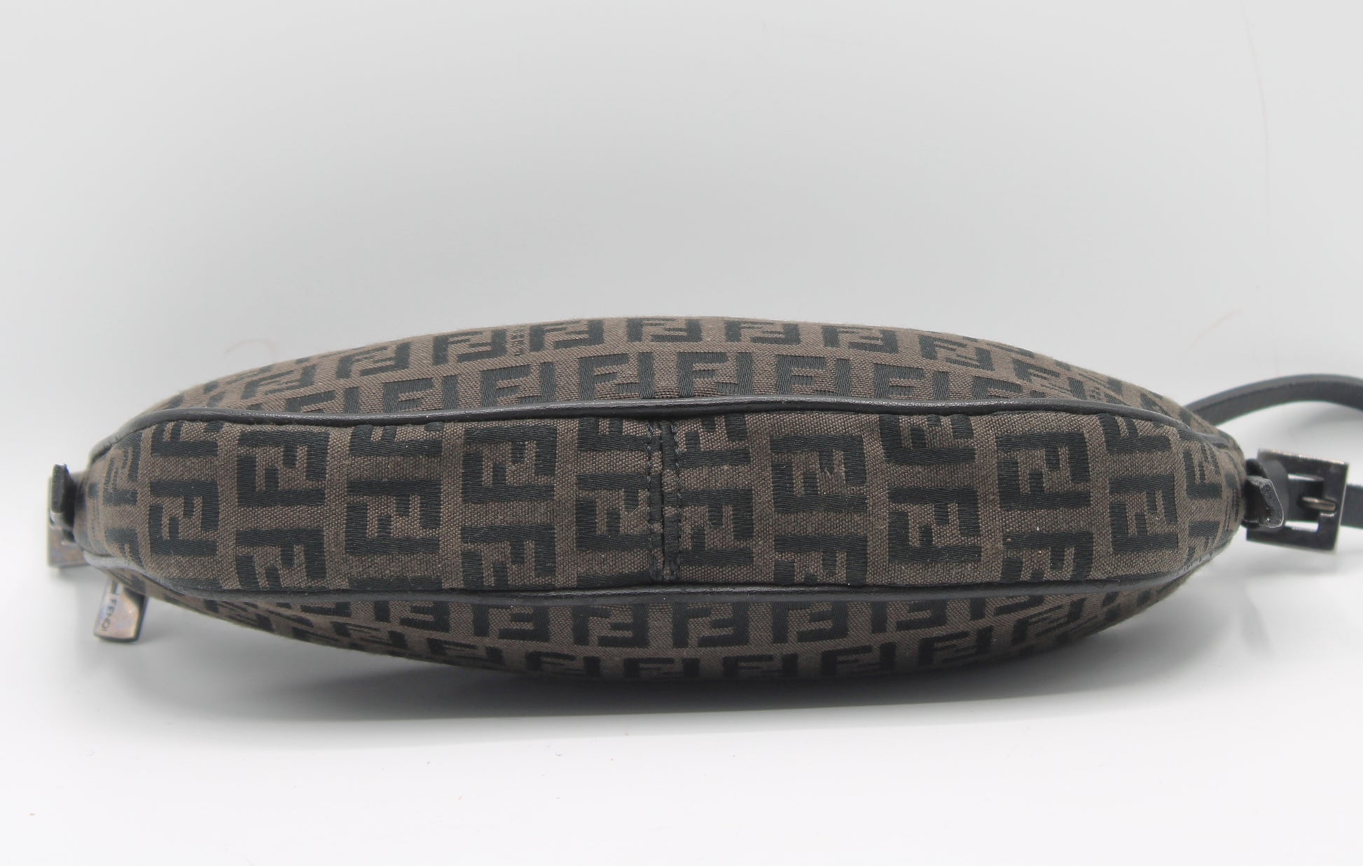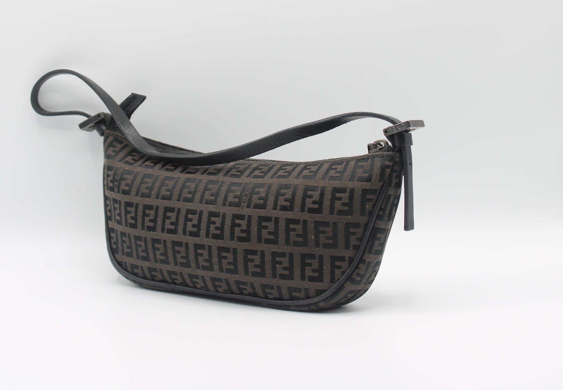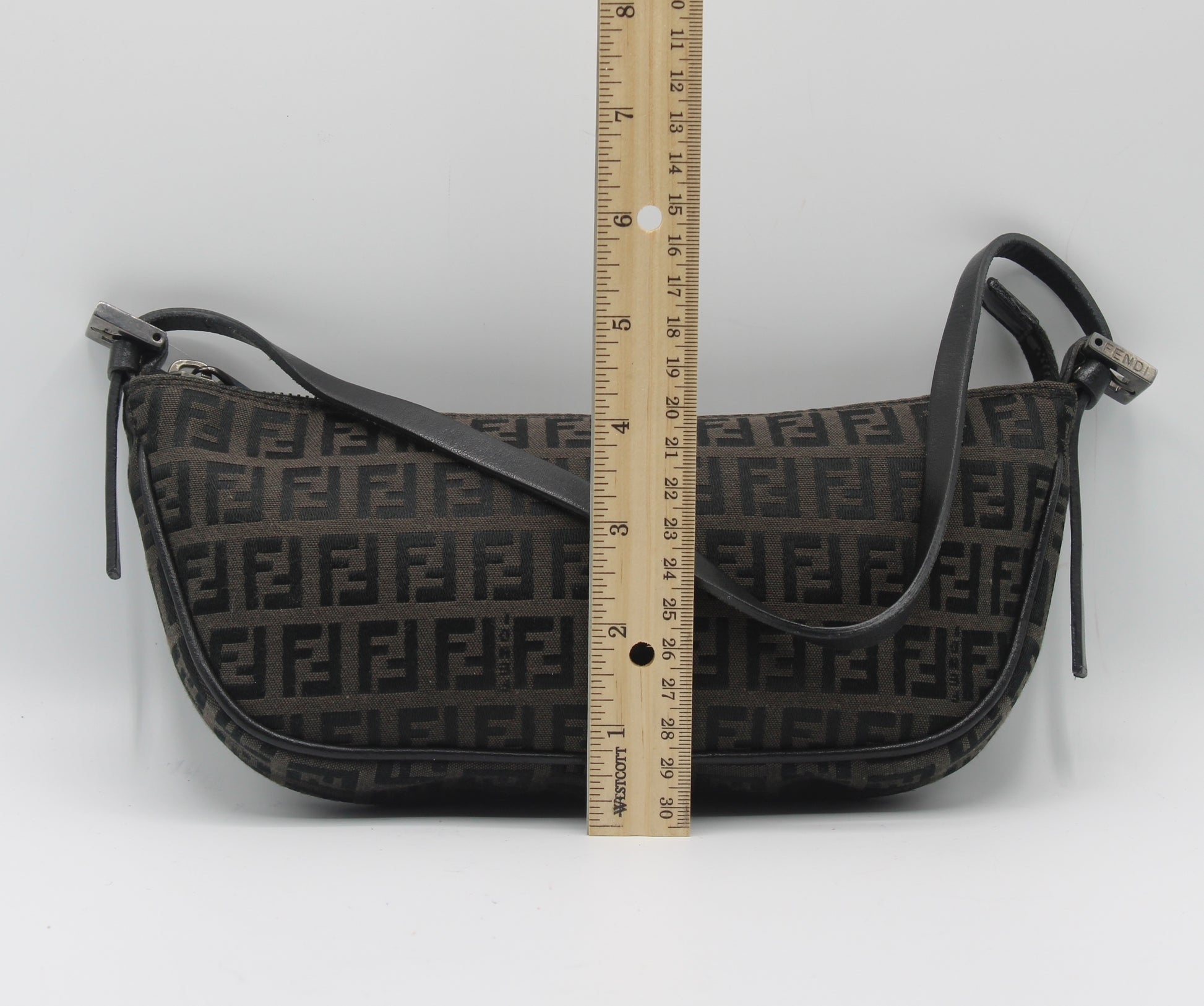 Stefany Bags Shoes and More presents this authentic Fendi Zucca Zucchino shoulder bag, a timeless piece crafted in classic brown canvas with the iconic FF monogram pattern. The bag features a boat-like silhouette, paired with a sleek single adjustable black leather strap, making it versatile to carry by hand or comfortably on the shoulder. Its minimalist yet bold design ensures it remains a staple in any luxury vintage collection. The bag comes complete with its original Fendi dust bag, adding further value and protection for storage. Measuring approximately 9 inches in width and 4 inches in height, it is the perfect size for daily use, balancing elegance with practicality.
