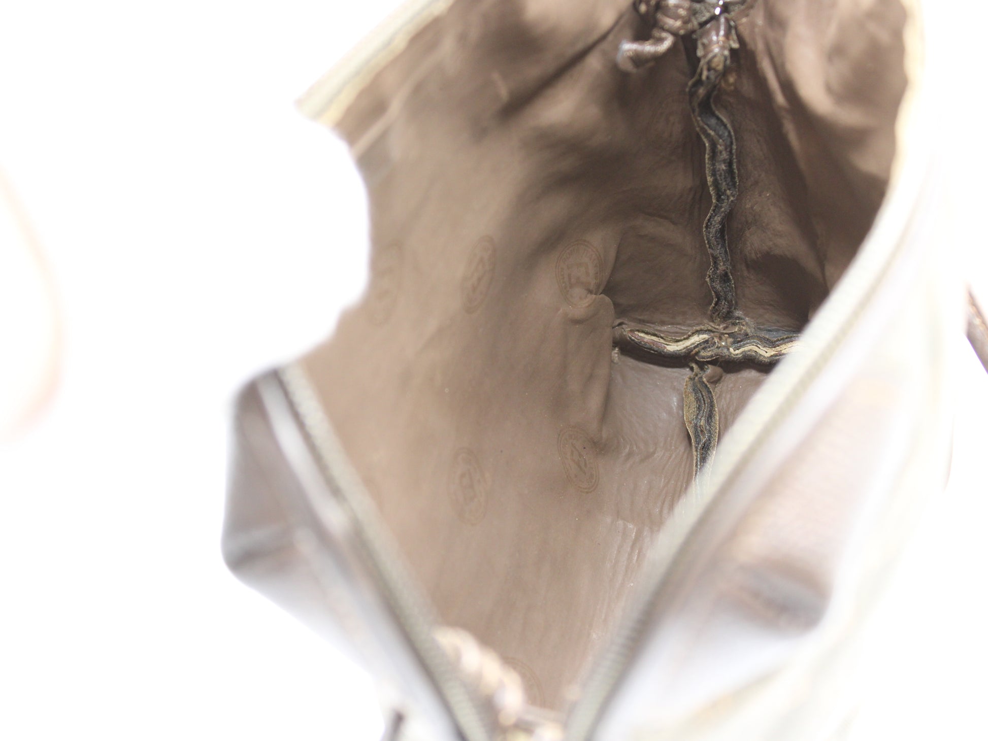 The interior is as luxurious as the exterior, with a fine leather lining that enhances the bag's opulent feel. Its front is graced with the iconic Fendi logo, a subtle yet powerful symbol of the bag's esteemed lineage. Though it shows signs of wear and slight discoloration, these attributes only serve to enhance its vintage charm, narrating a story of its illustrious past.