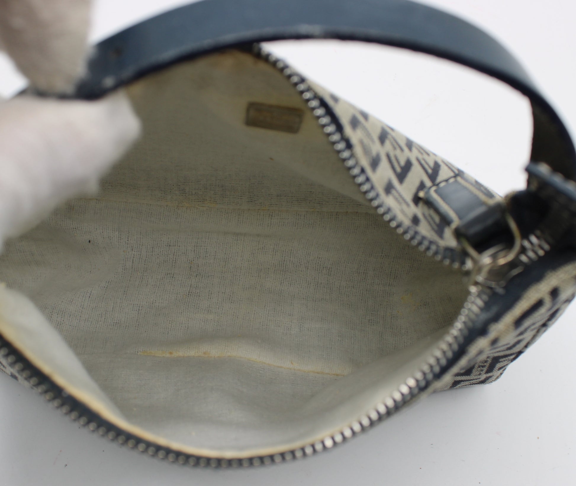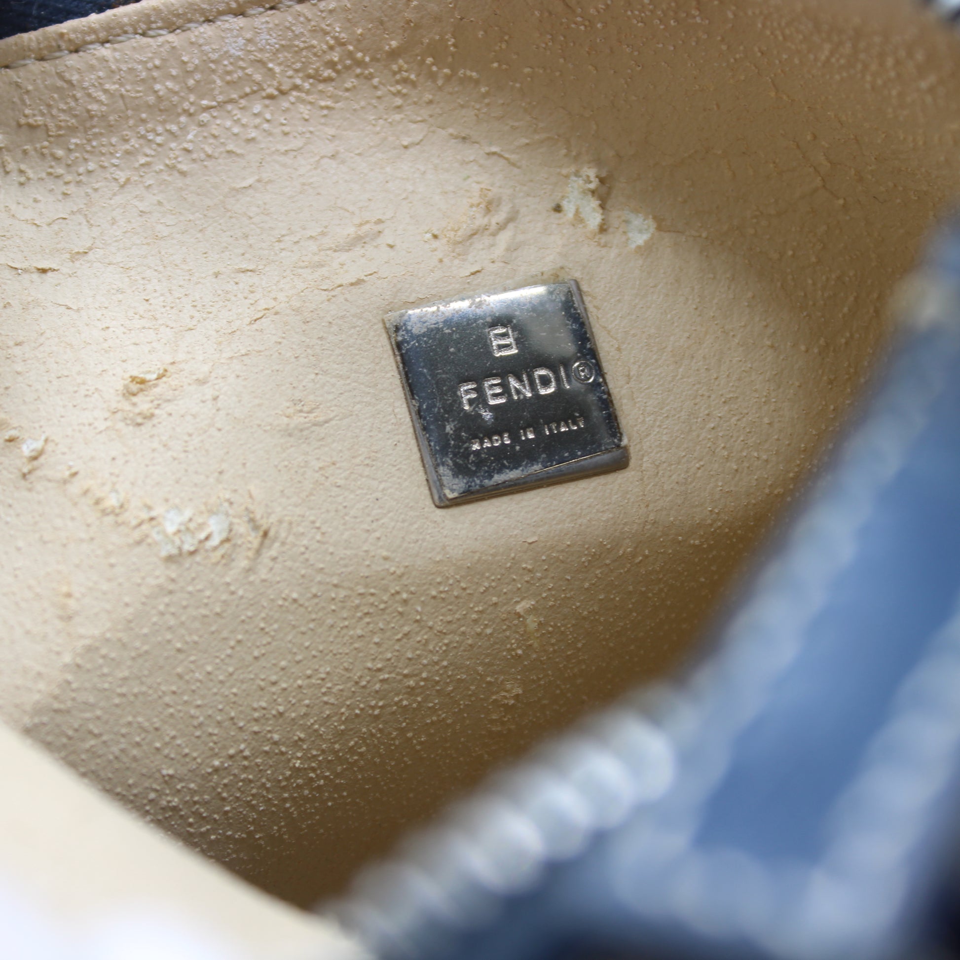 The interior features a cream lining consistent with vintage Fendi pouches, showing expected wear and flaking from age, typical of bags from this era. The exterior remains in very good condition with minor signs of gentle use. The structure of the bag is intact, and the strap remains sturdy for regular use. Please review detailed photos for a closer look at the bag’s authentic condition.