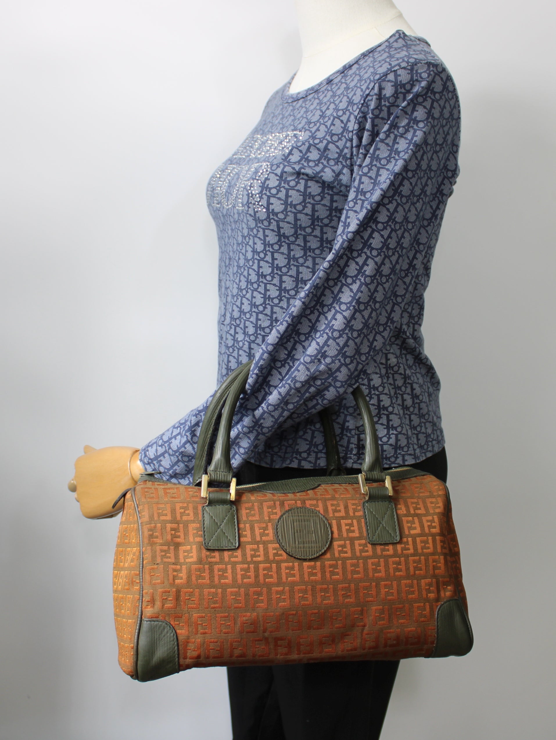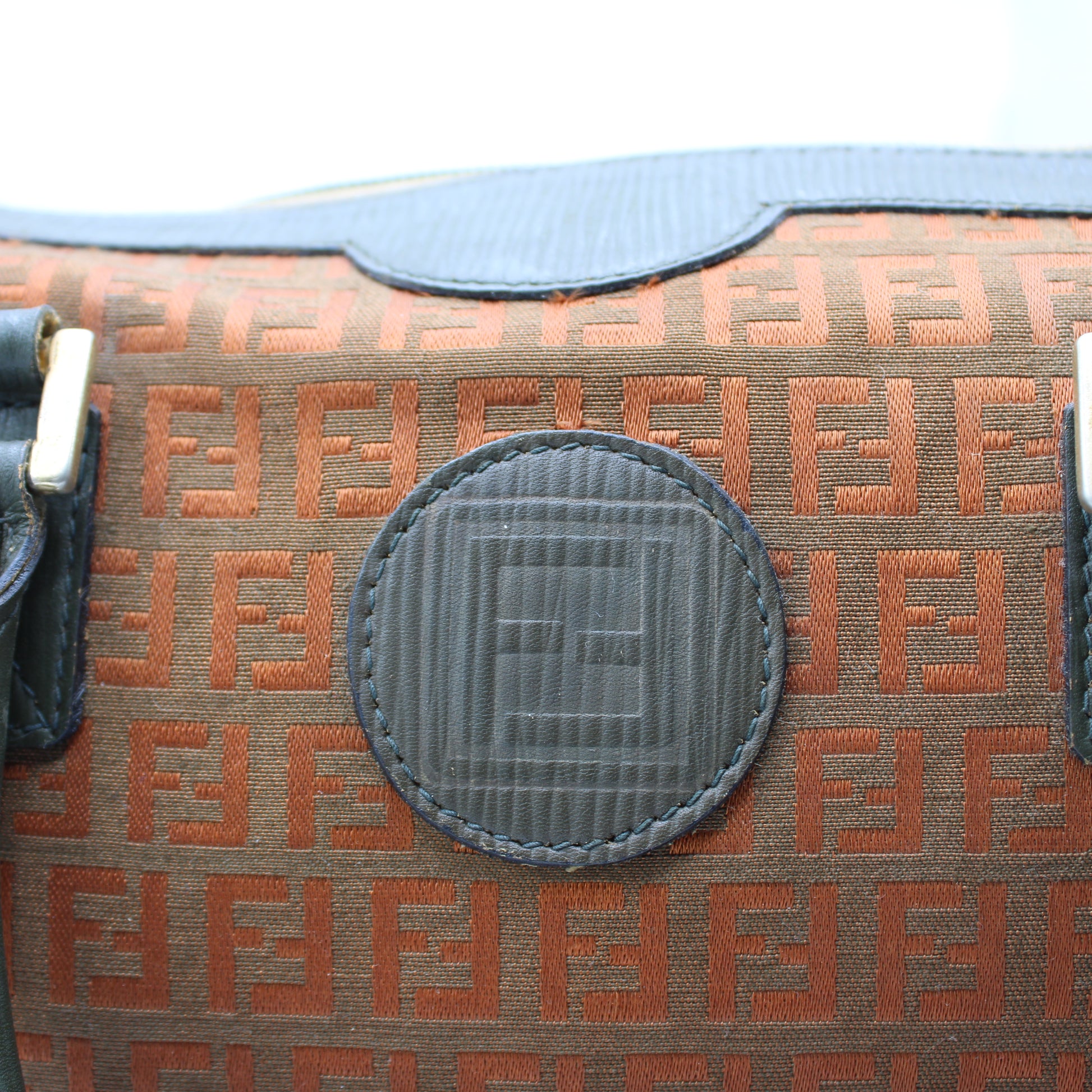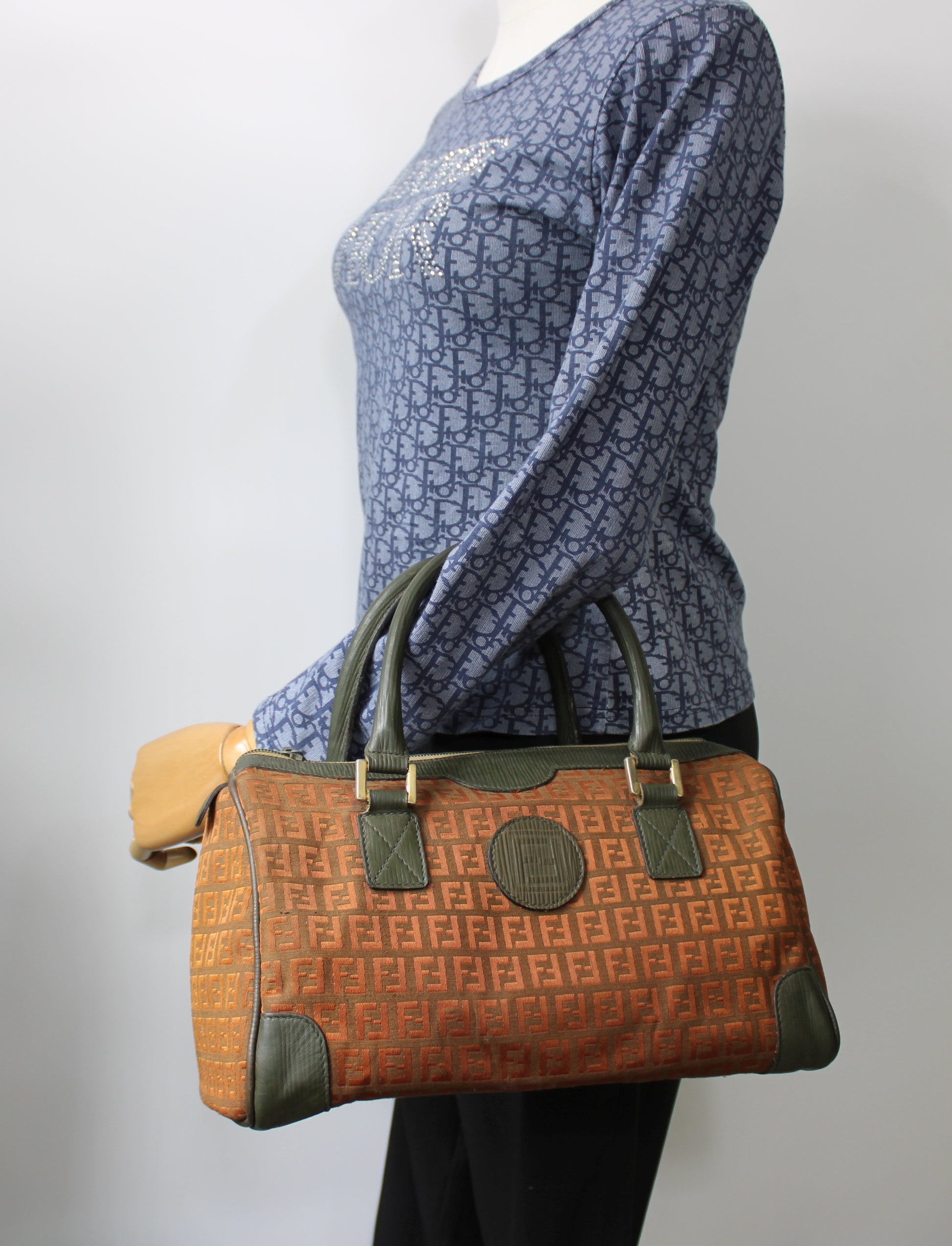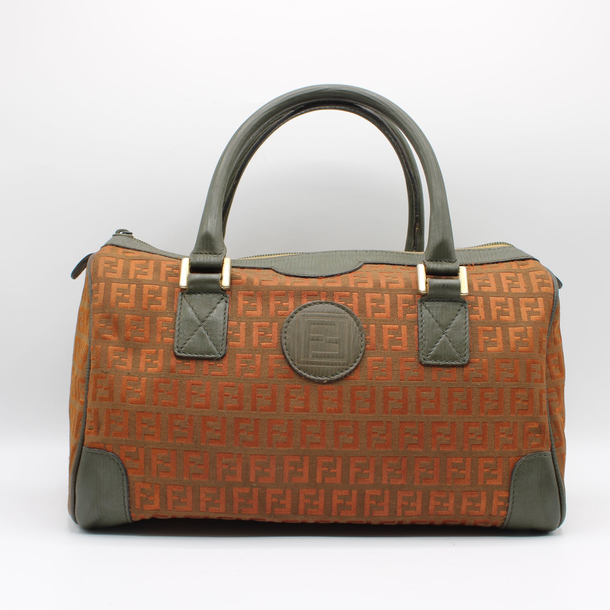 Stefany Bags Shoes and More proudly presents this authentic vintage Fendi Boston bag crafted in iconic orange Zucca canvas with refined gray green leather handles and structured leather side details. This timeless Fendi design showcases the house’s signature repeating Zucca pattern, accented with gold tone hardware and a classic Boston silhouette that remains highly sought after by collectors of authentic vintage Fendi bags. The rich color combination and structured form make this piece perfect for everyday wear while still offering elevated designer appeal. A standout option for anyone searching for authentic vintage Fendi bags available in Boston and beyond.