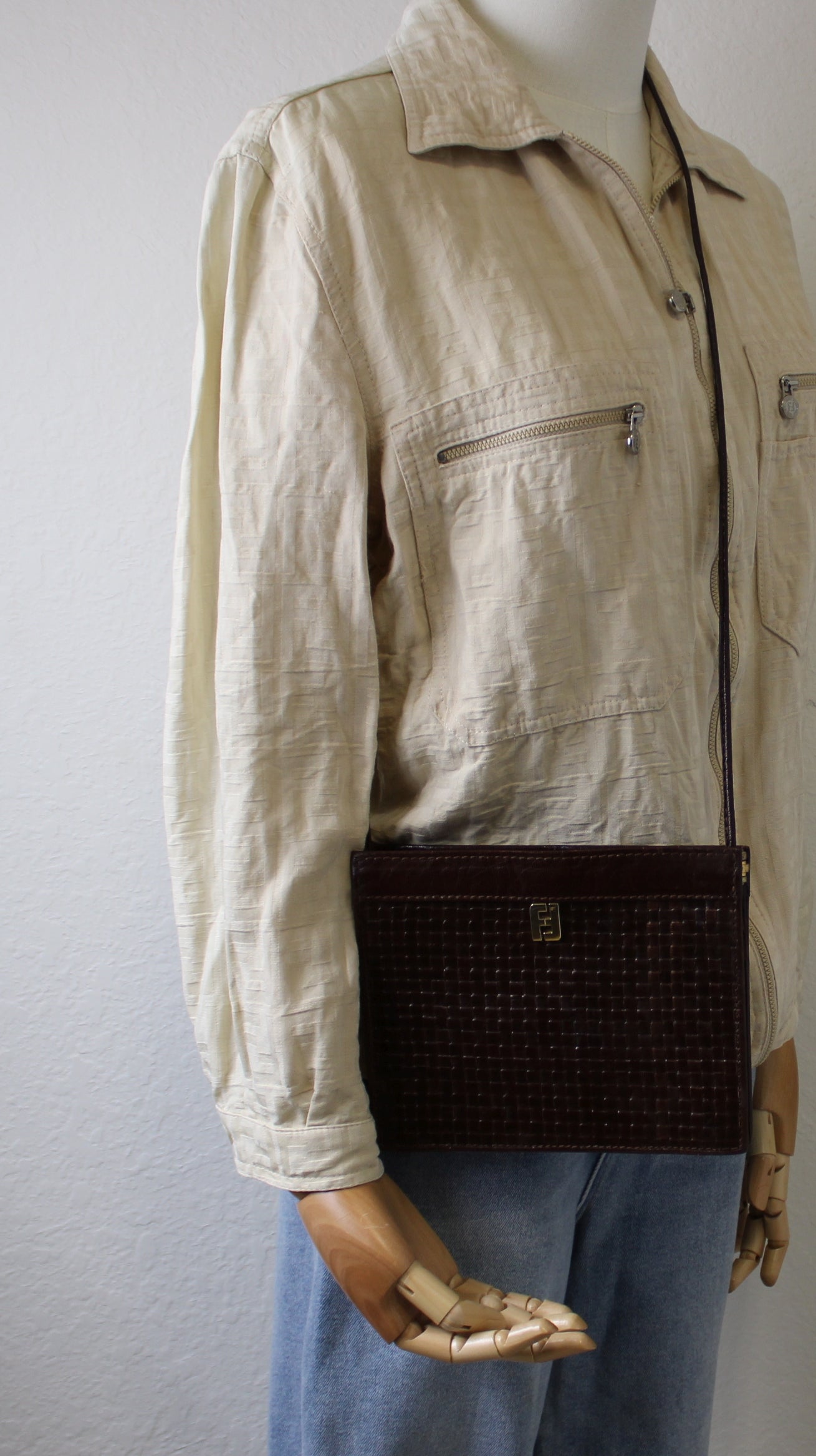 Embrace the timeless elegance of Stefany Bags Shoes and More's vintage treasure: the Fendi Woven Brown Leather Bag. This authentic gem from the coveted Italian brand Fendi radiates luxurious charm with its intricately woven leather, ensuring you stand out with a piece of fashion history. The bag's exquisite design features three well-organized compartments, including a central section, making it a perfect blend of style and practicality.