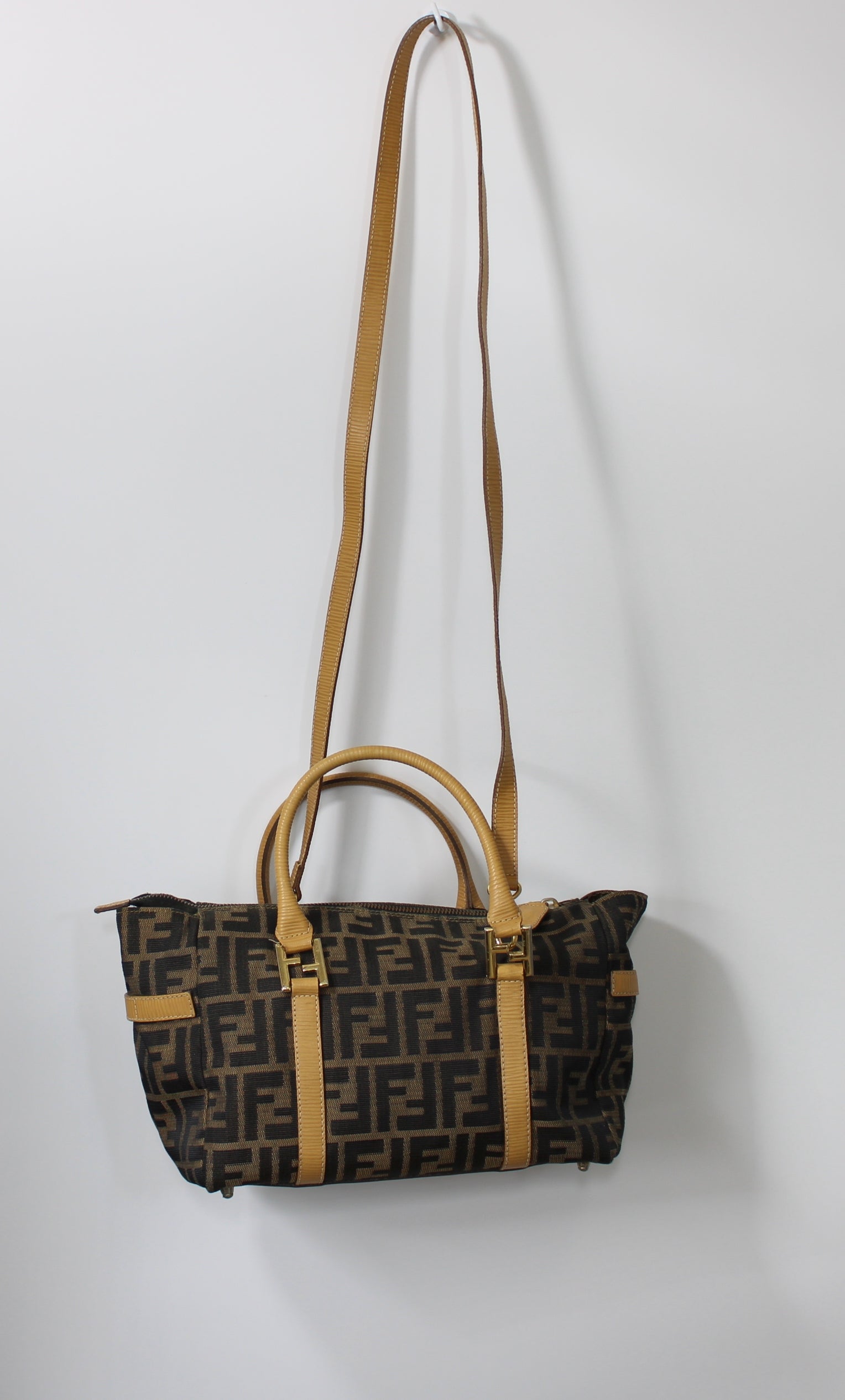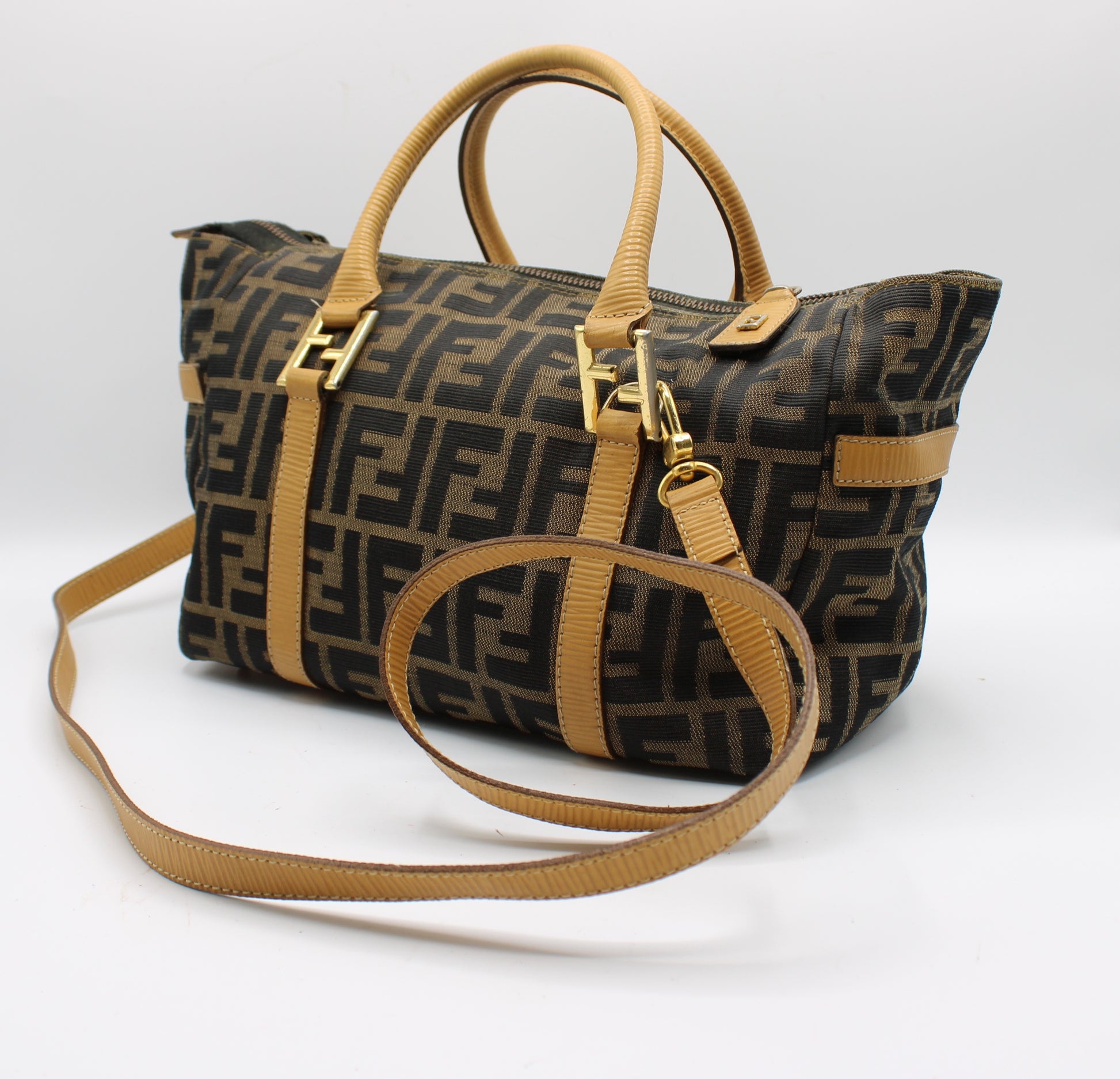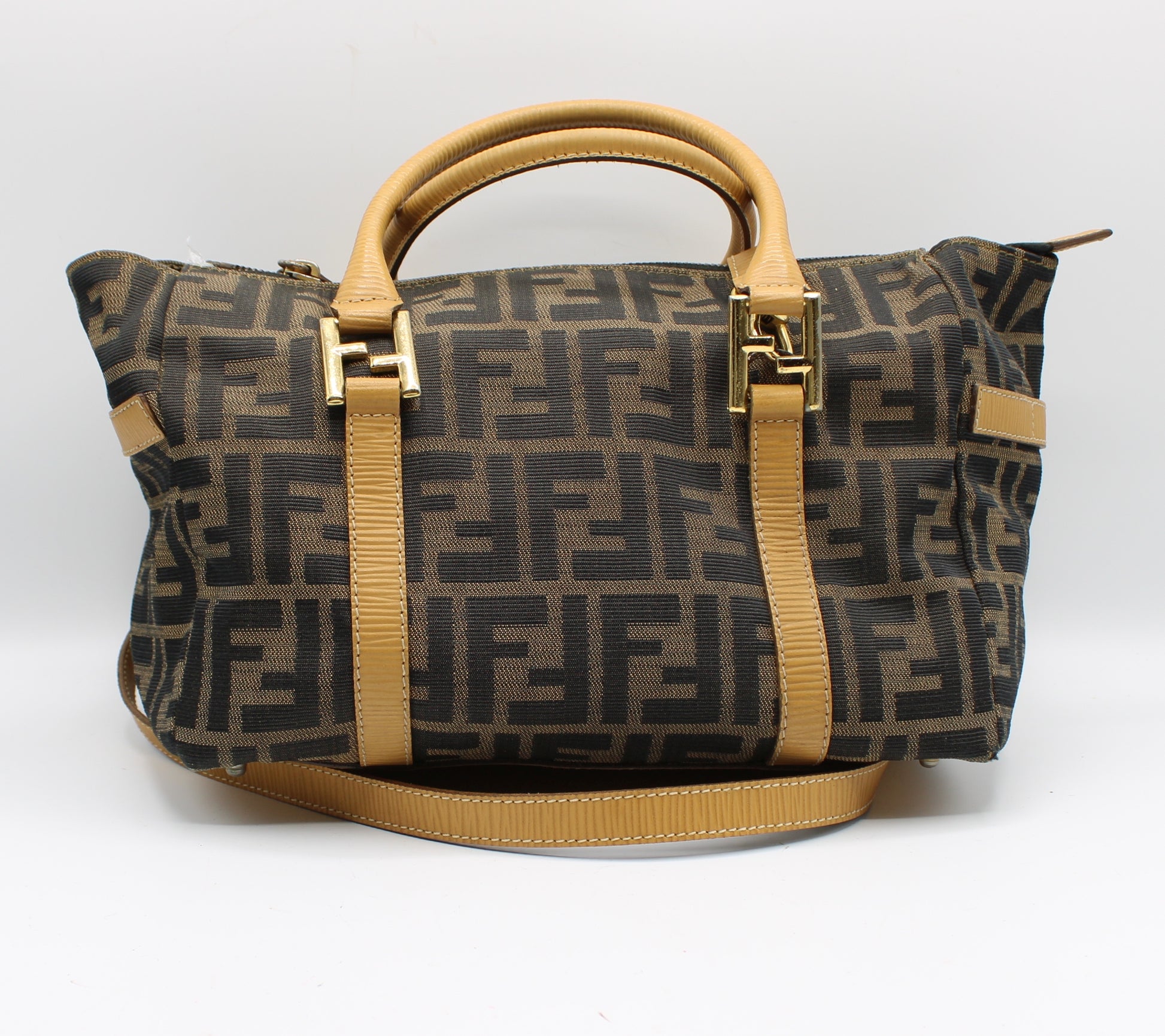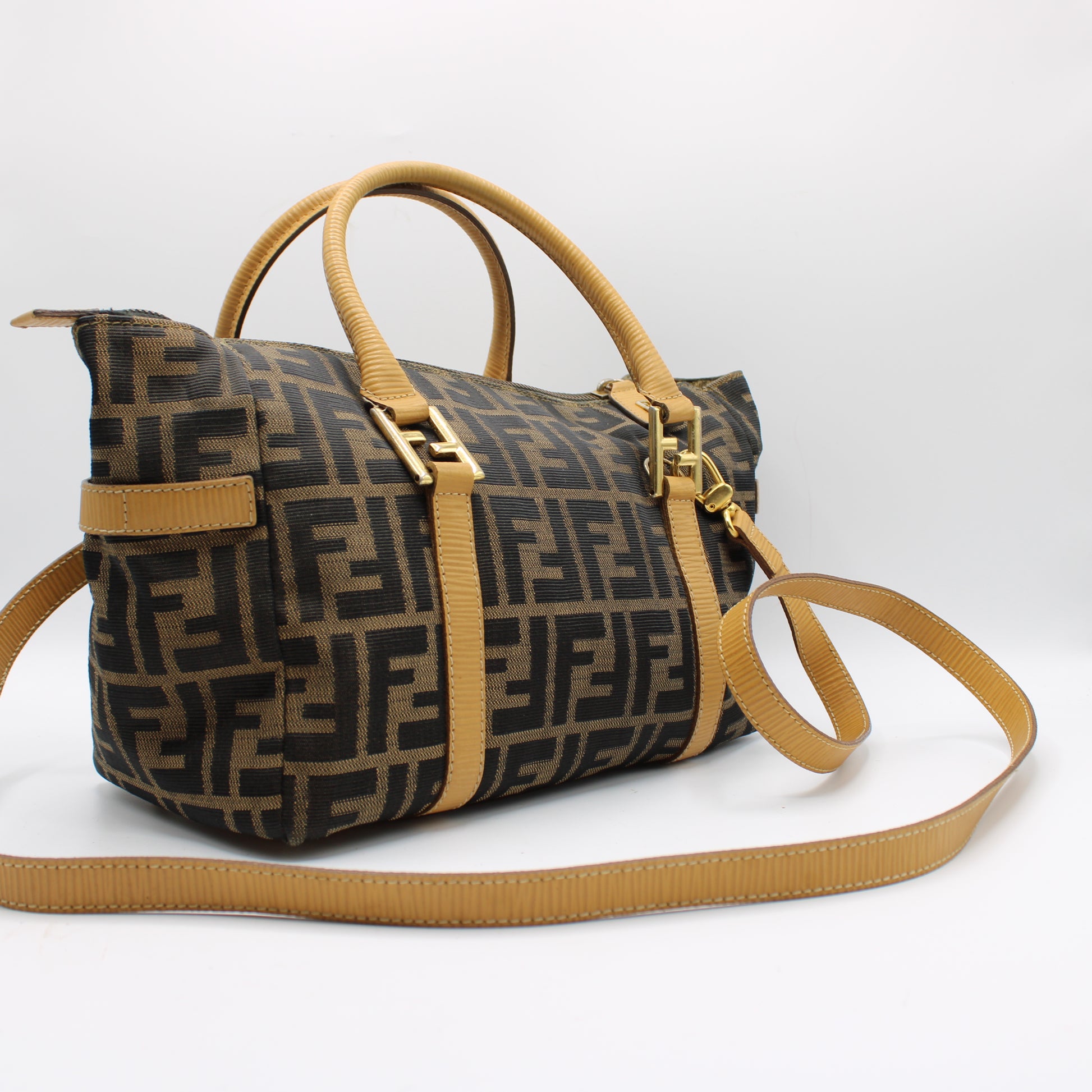 Stefany Bags Shoes and More proudly presents this authentic vintage Fendi Zucca Boston bag, a timeless luxury icon crafted in classic brown Zucca canvas with beige yellow leather trim and detailing. This versatile piece features the signature FF monogram pattern throughout, structured Boston silhouette, rolled leather top handles, and a removable leather crossbody strap that allows it to be worn as a handbag or comfortably crossbody. Gold tone hardware accents, including the metal Fendi logo at the base of the handles, complete the sophisticated design that continues to be highly sought after among collectors of authentic vintage Fendi bags. This style reflects the enduring popularity of early 2000s Fendi Zucca designs, making it a perfect statement piece for everyday wear or travel. Ideal for those searching for authentic vintage Fendi bags available in Boston and beyond.