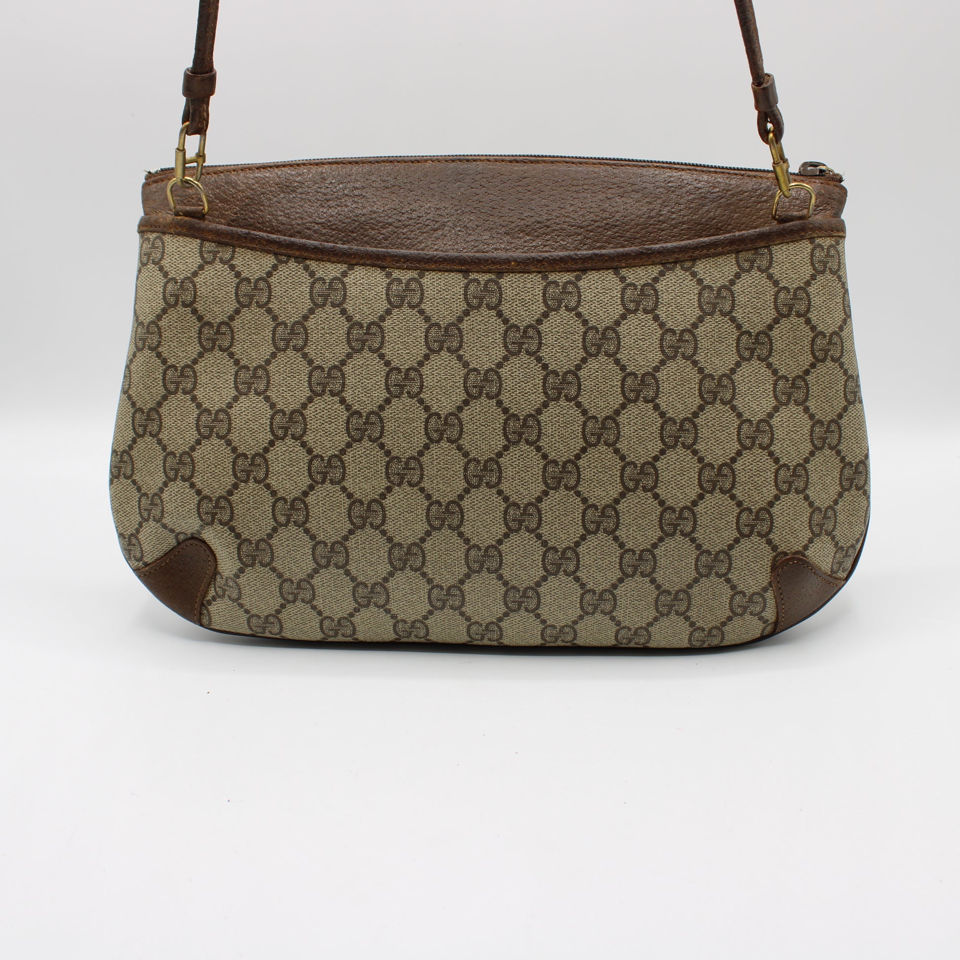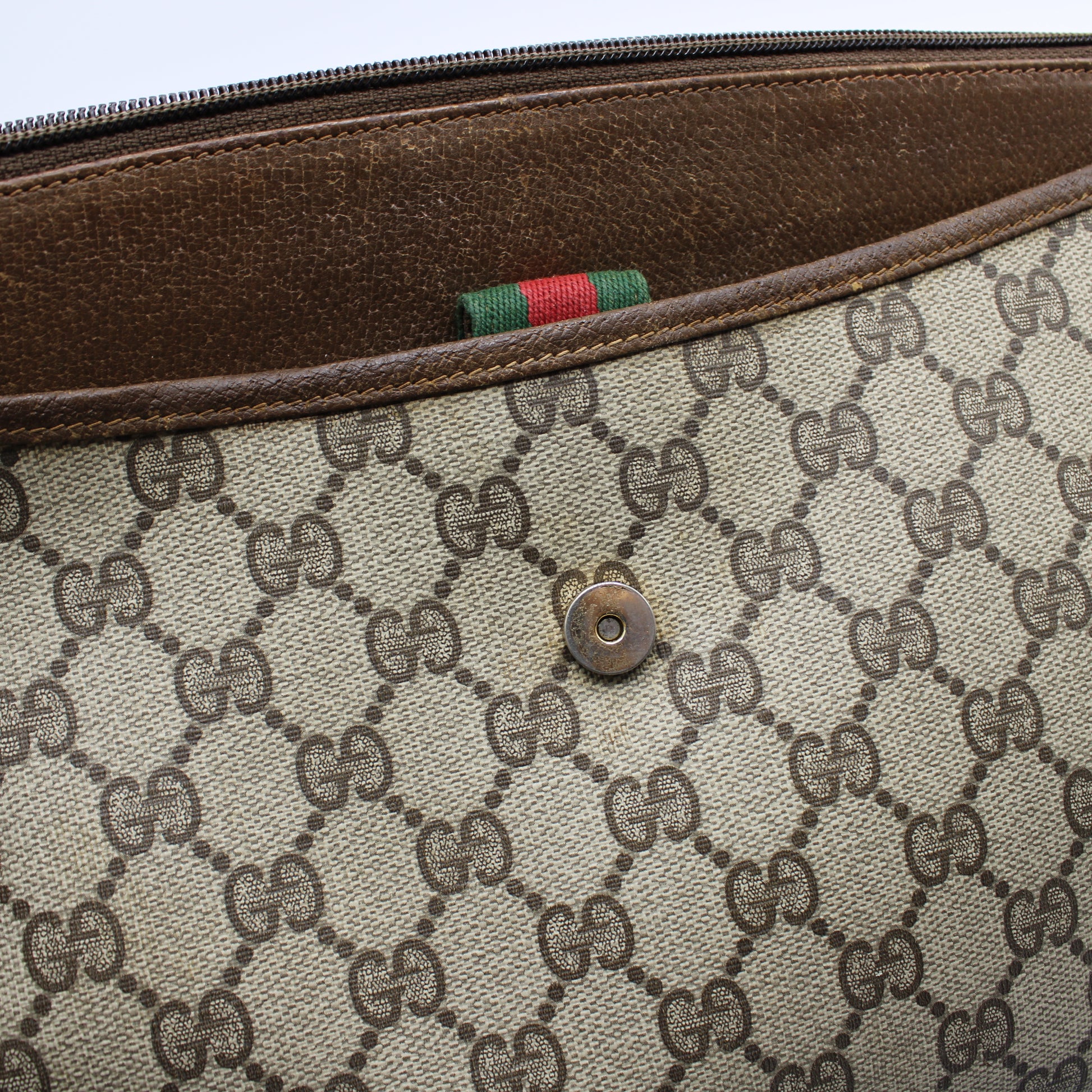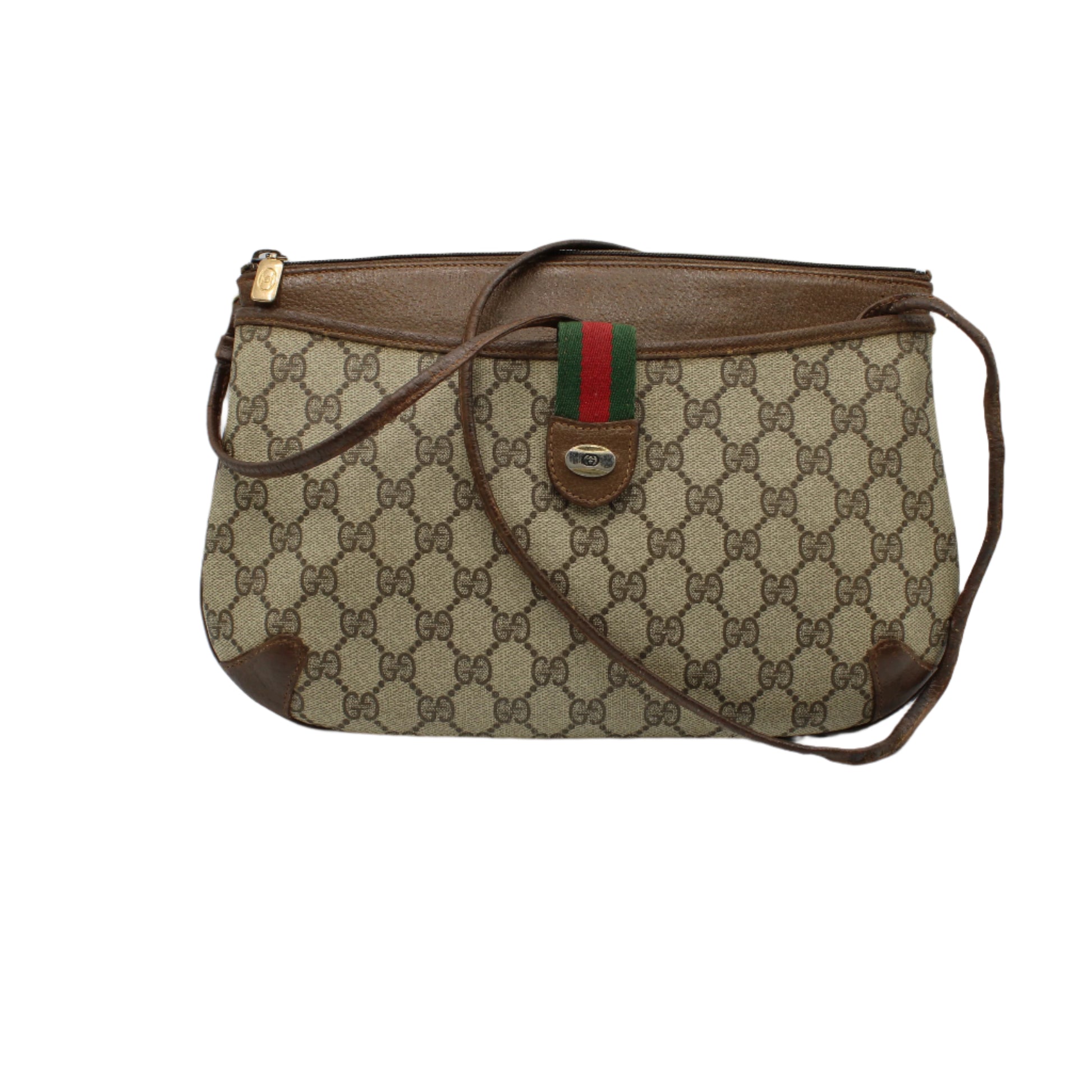 Stefany Bags Shoes and More is proud to offer this authentic vintage Gucci crossbody bag, crafted from iconic beige GG canvas and brown leather accents. Featuring Gucci's signature green and red web detail on the front snap closure, this bag is a testament to timeless luxury. With a zip-top opening, it provides secure storage across its three compartments, perfect for keeping your essentials organized. The adjustable and removable strap allows it to be styled as a crossbody or an elegant clutch, making it a versatile addition to your wardrobe.