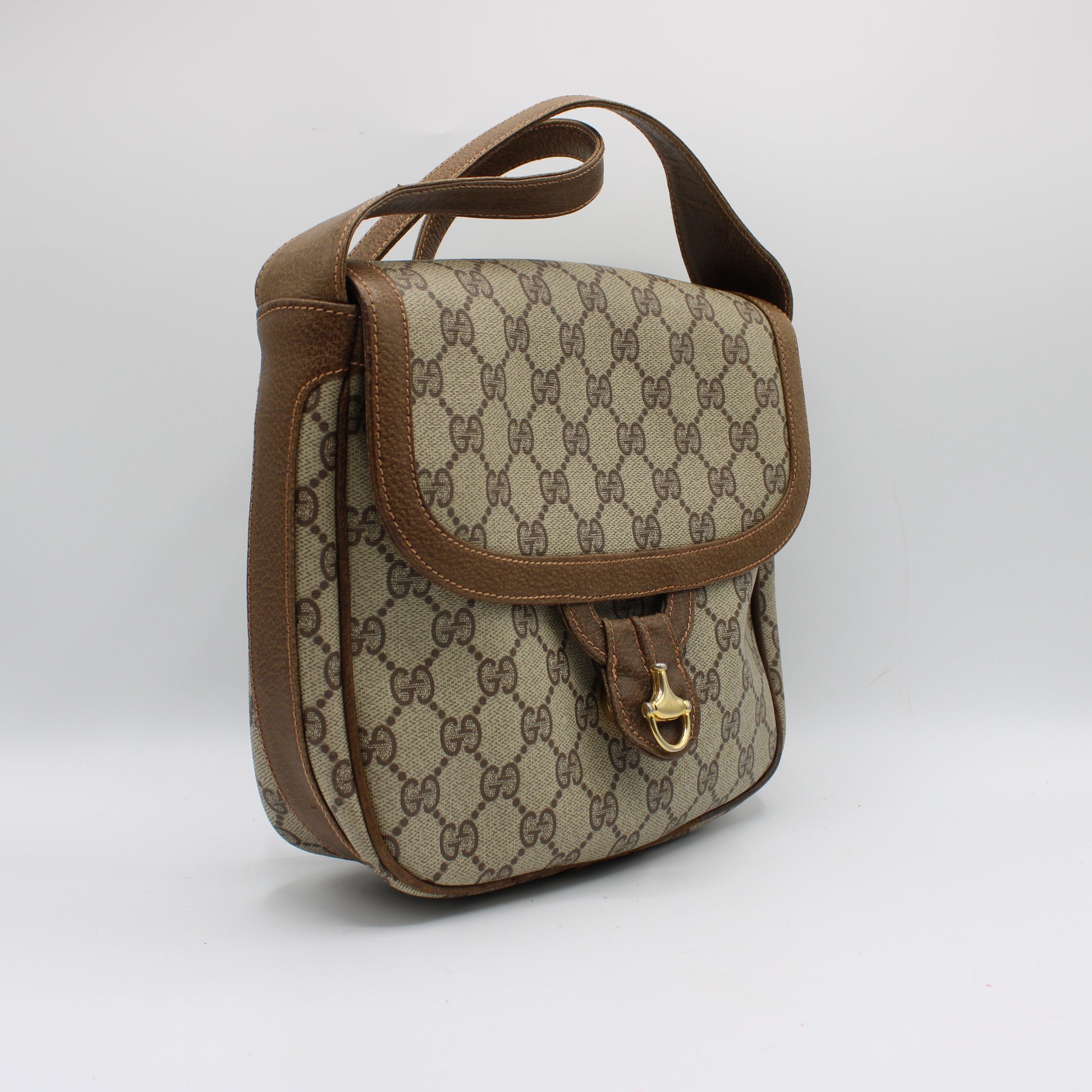 Stefany Bags Shoes And More proudly presents this authentic vintage Gucci flap shoulder bag, crafted in classic beige GG monogram canvas with rich brown leather trim and detailing. This timeless design features the iconic horsebit-inspired horseshoe logo hardware on the front flap, showcasing Gucci’s heritage aesthetic that remains highly sought after among collectors of authentic vintage Gucci bags. The structured silhouette and elegant proportions make this piece perfect for everyday wear, effortlessly transitioning from casual daytime styling to refined evening looks. A single adjustable leather shoulder strap allows comfortable shoulder or crossbody wear, making it a versatile staple for any luxury wardrobe. This style reflects enduring demand for heritage Gucci canvas bags, a trend continuing strongly into 2025. Available in Boston, this piece is ideal for shoppers seeking authentic vintage Gucci bags with lasting value.