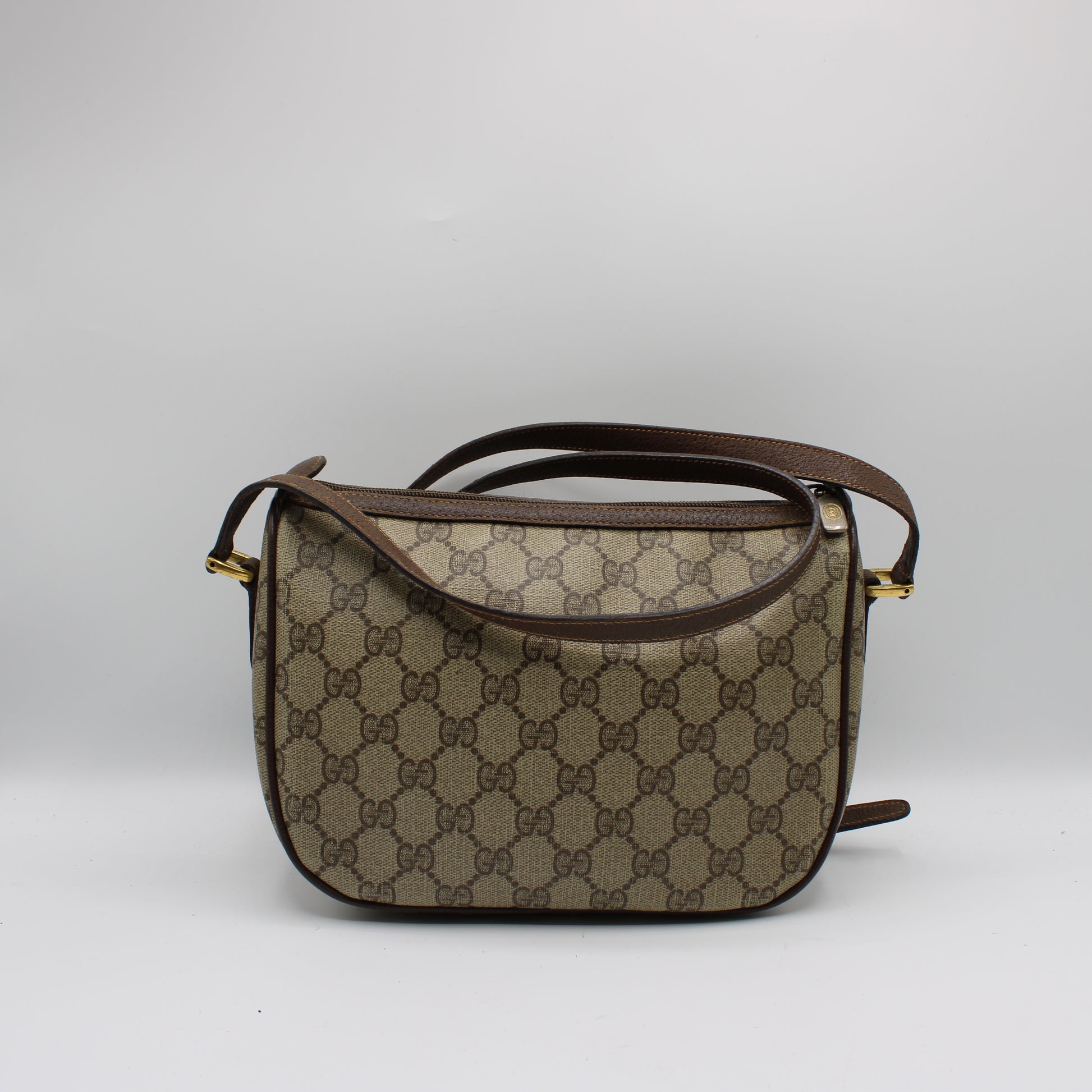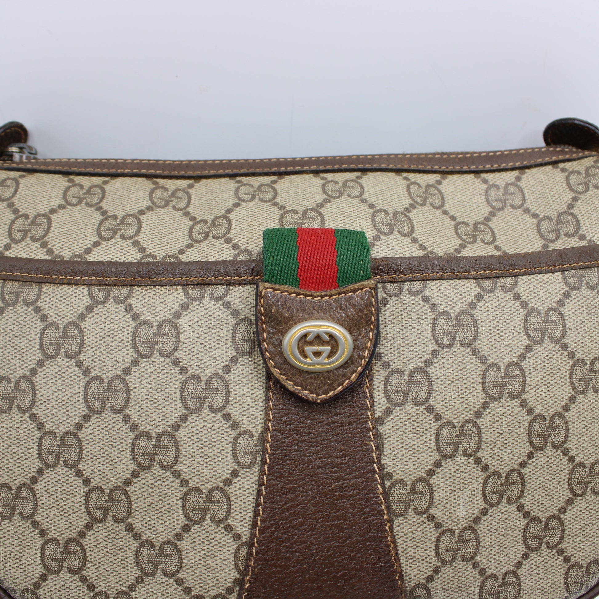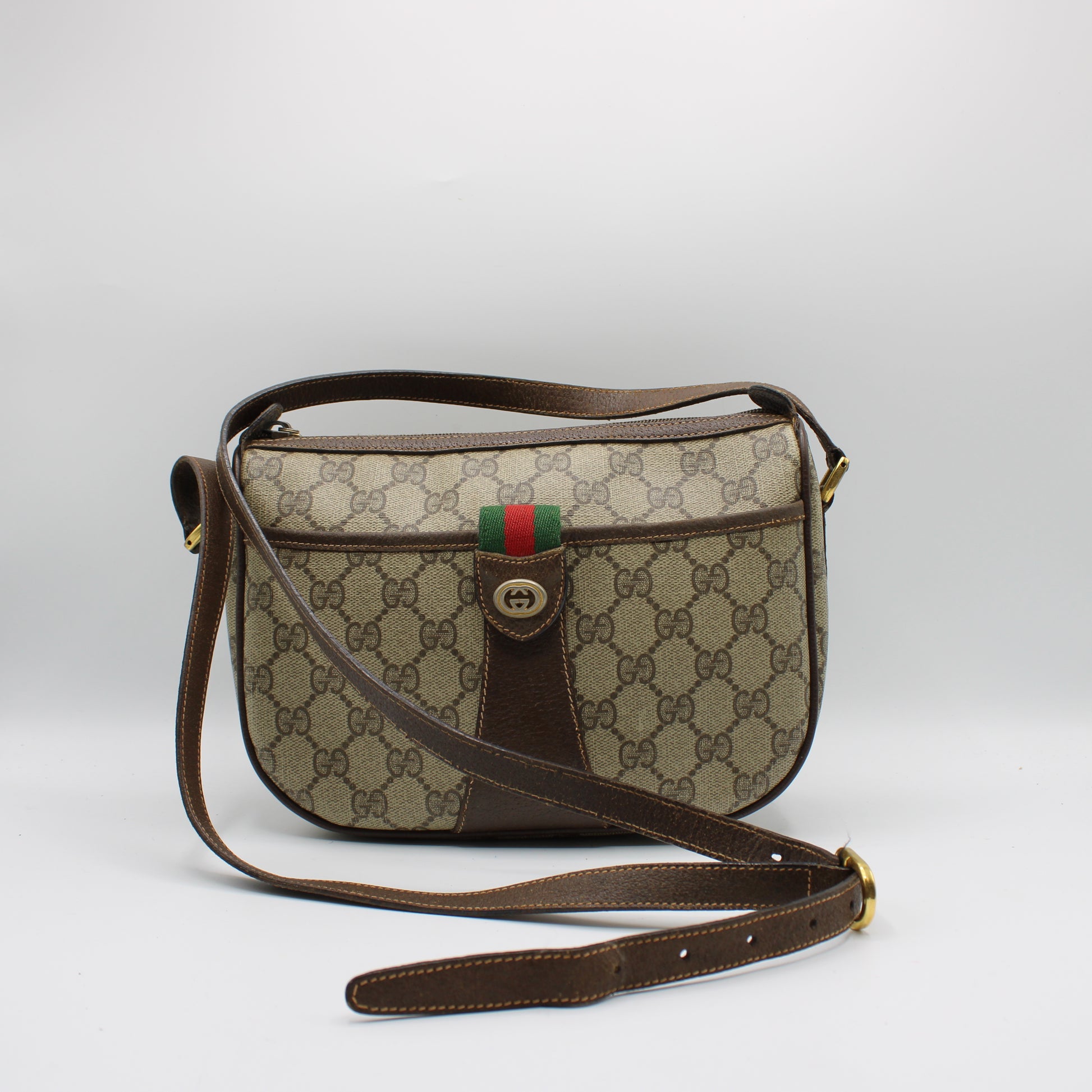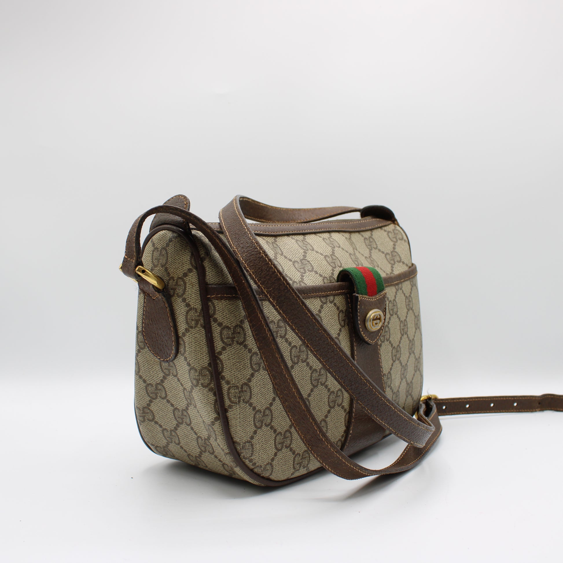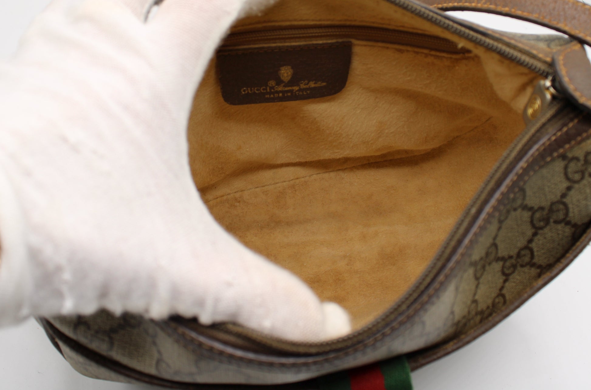 Stefany Bags Shoes and More presents this authentic vintage Gucci GG Supreme Ophidia crossbody bag, an exquisite piece for any luxury collector. Crafted in Gucci’s signature GG monogram canvas, this bag features elegant brown leather trim and an adjustable strap for versatile wear. The front showcases a leather-accented flap pocket secured with a gold-tone Gucci logo button closure, complete with the iconic green and red web stripe, adding a classic Gucci touch. The top zipper closure reveals a suede-like interior lining, maintaining the vintage charm of the bag.