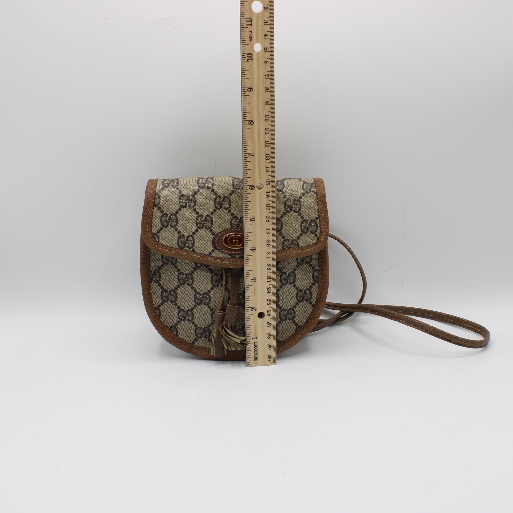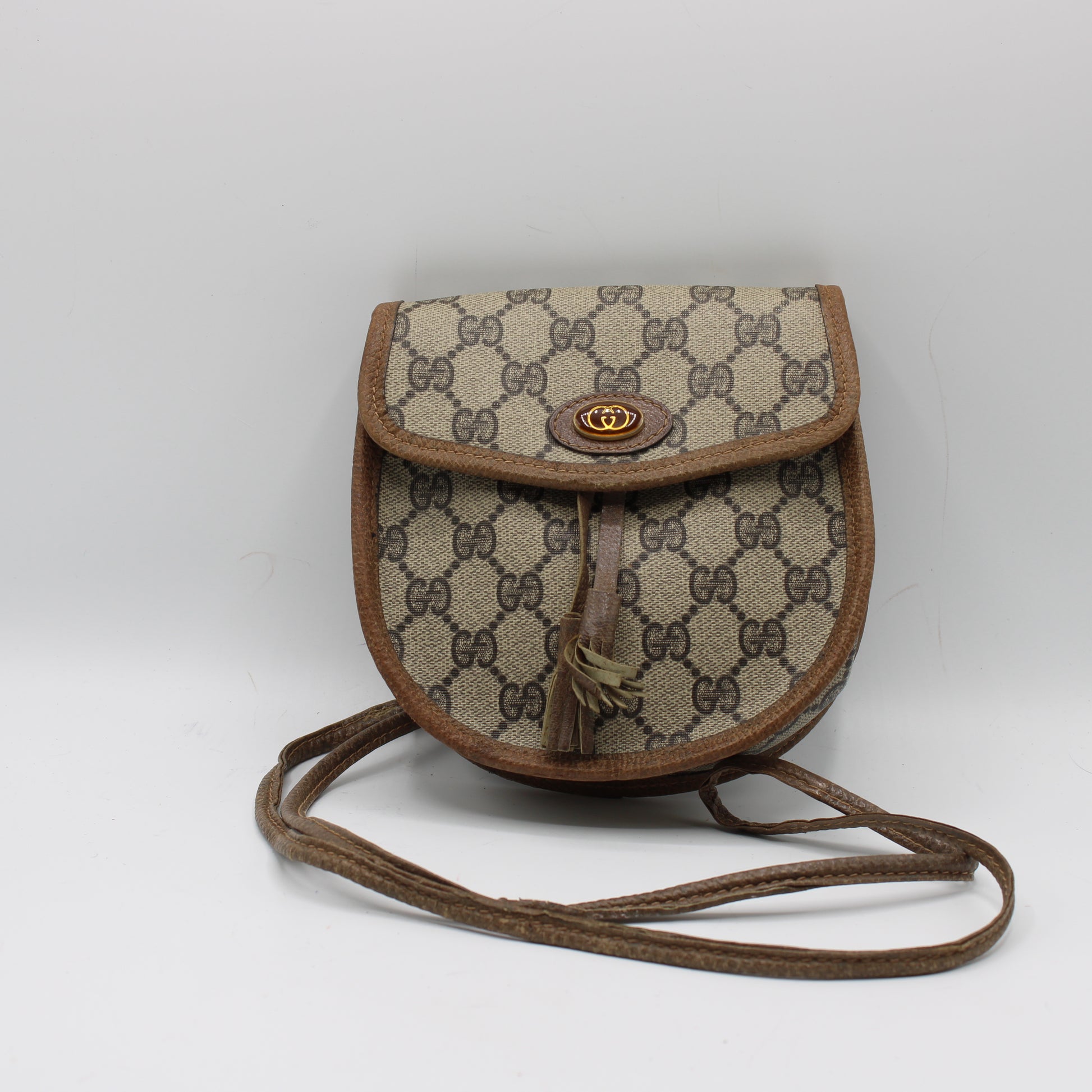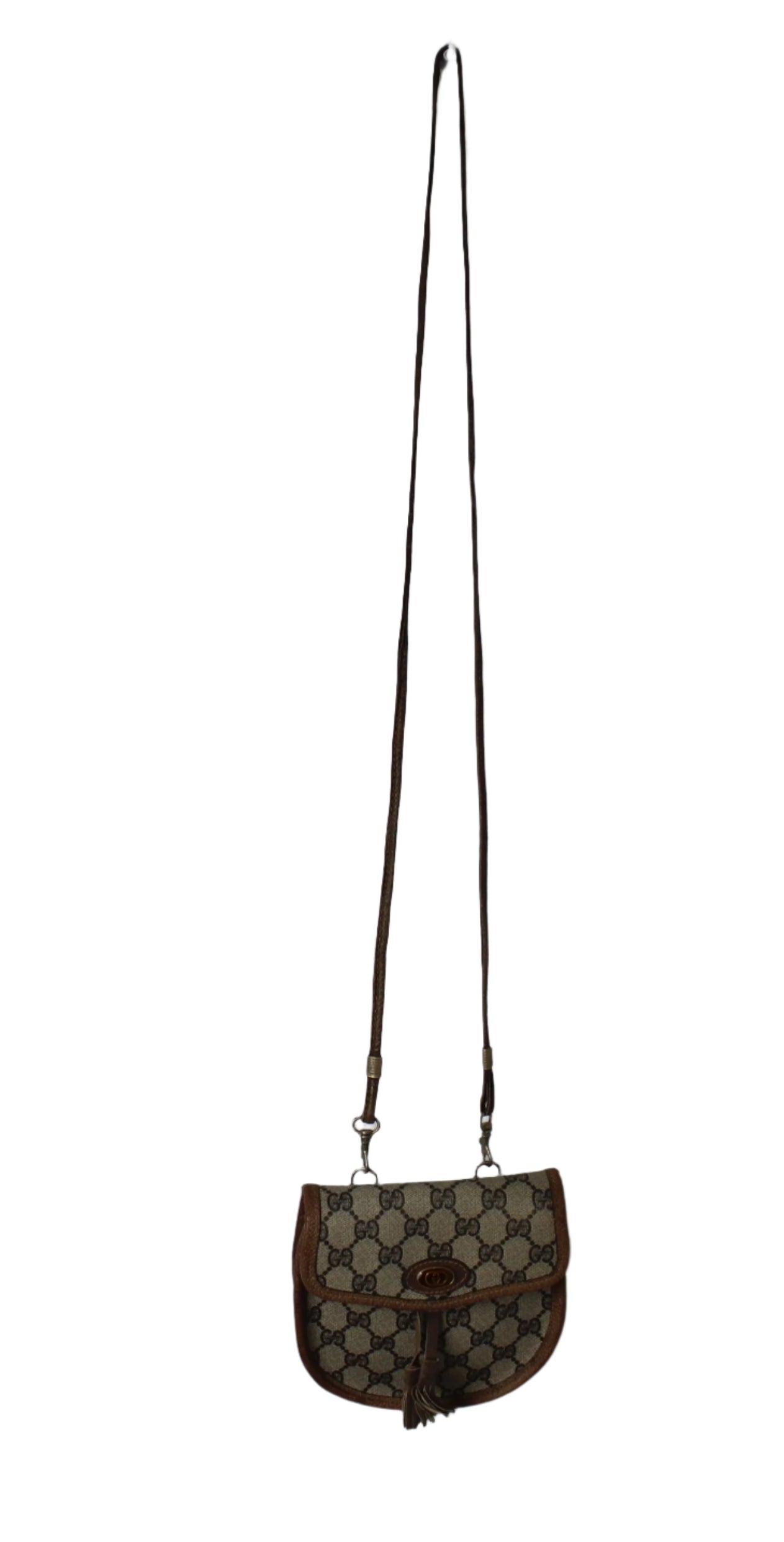 Stefany Bags Shoes and More presents this authentic vintage Gucci crossbody bag in a charming oval silhouette, crafted from the brand’s iconic beige GG monogram canvas and detailed with warm brown leather trim. A true 1980s-90s piece, it features a flap design with a beautiful 3D interlocking GG logo accent in gold-tone hardware, adding a touch of understated luxury. The bag is finished with a leather tassel detail that brings vintage flair, while the thin leather strap offers versatility — wear it crossbody, over the shoulder, or detach the strap to use it as a pouch for evenings out. Its compact size, approximately 6 x 6 inches, makes it ideal for just the essentials, combining practicality with timeless Gucci elegance.