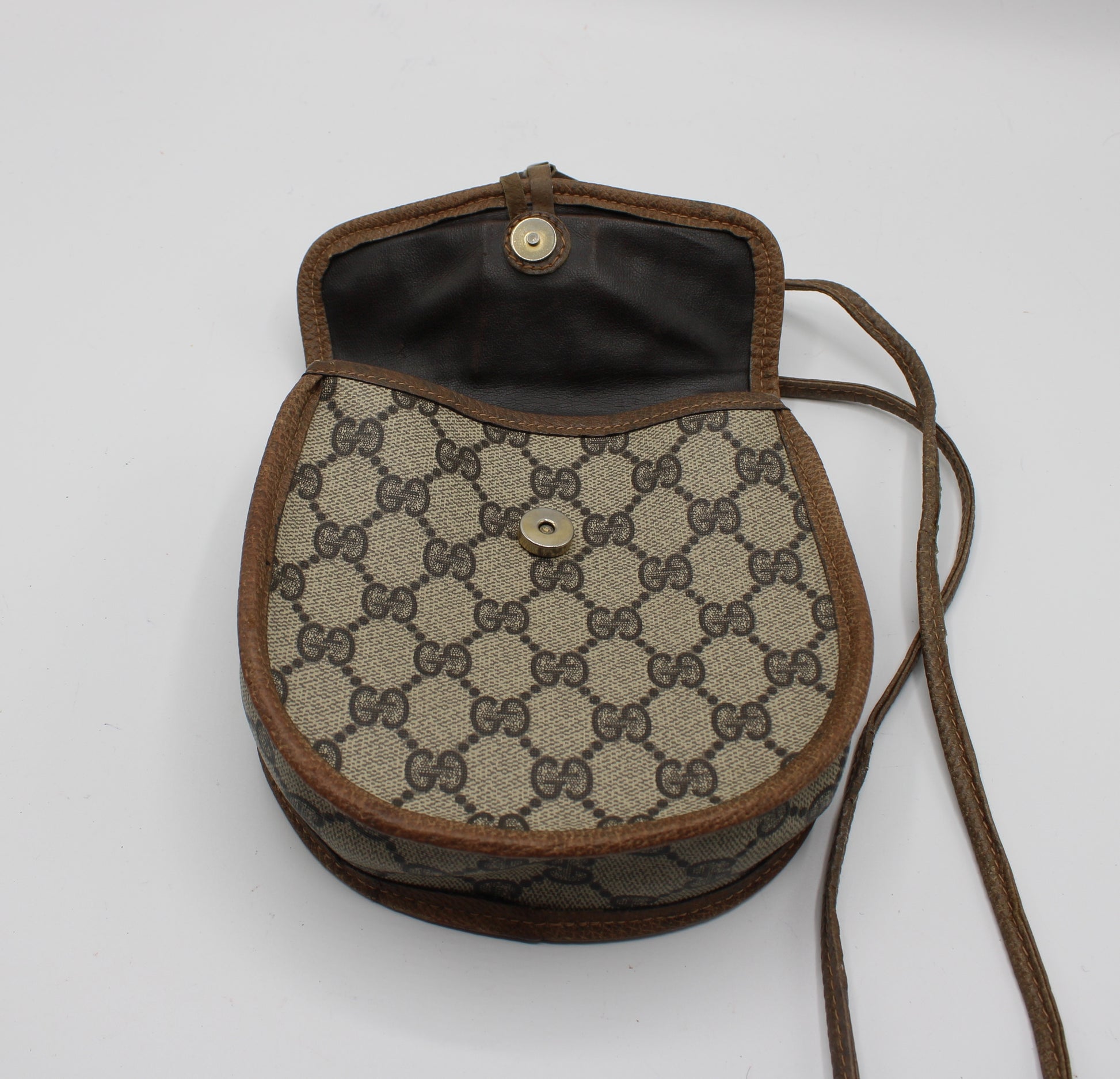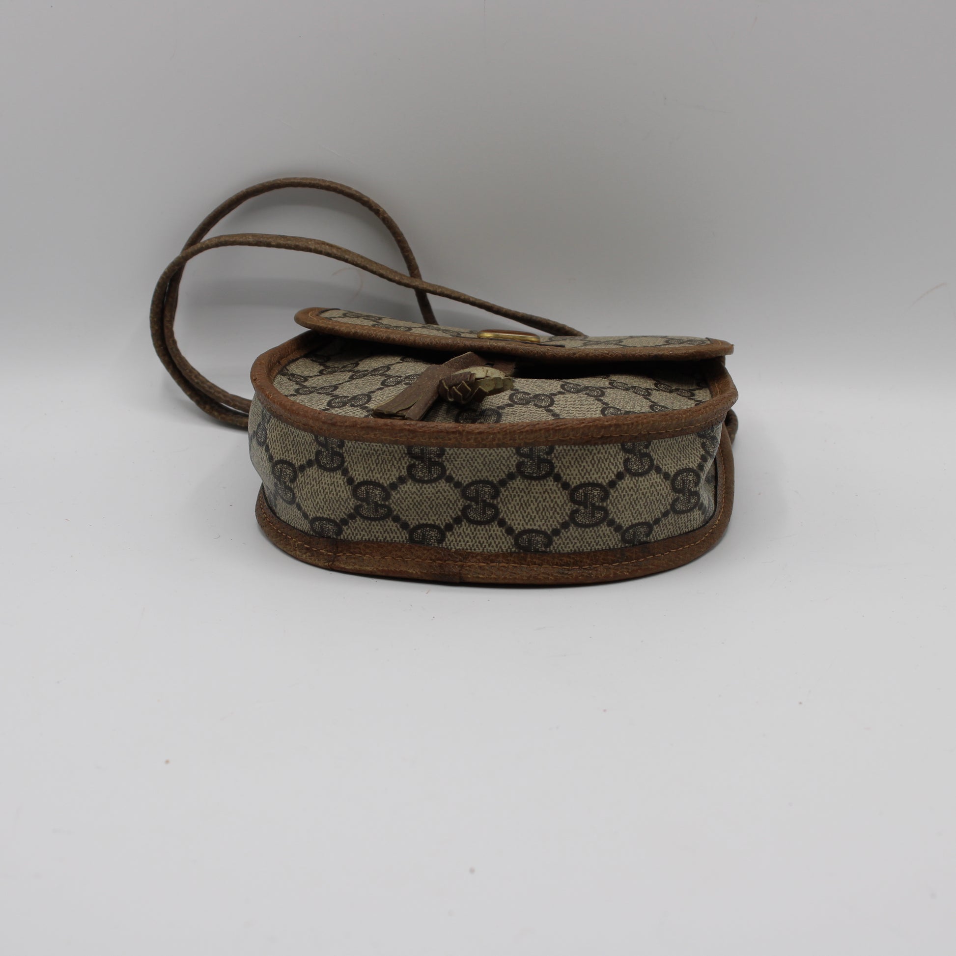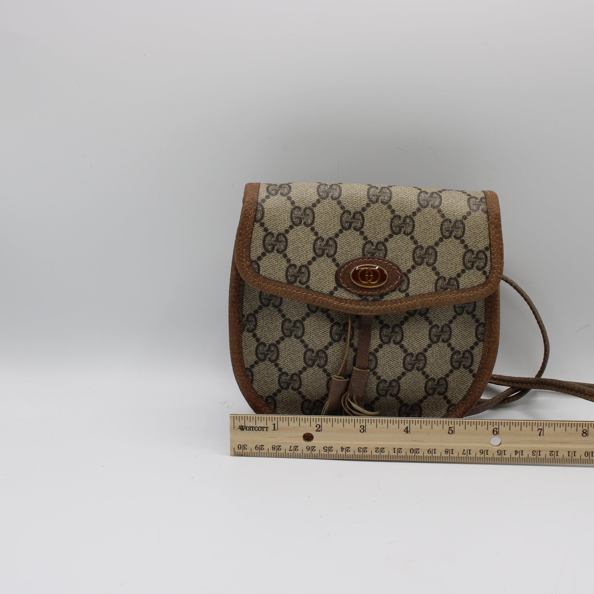 Stefany Bags Shoes and More presents this authentic vintage Gucci crossbody bag in a charming oval silhouette, crafted from the brand’s iconic beige GG monogram canvas and detailed with warm brown leather trim. A true 1980s-90s piece, it features a flap design with a beautiful 3D interlocking GG logo accent in gold-tone hardware, adding a touch of understated luxury. The bag is finished with a leather tassel detail that brings vintage flair, while the thin leather strap offers versatility — wear it crossbody, over the shoulder, or detach the strap to use it as a pouch for evenings out. Its compact size, approximately 6 x 6 inches, makes it ideal for just the essentials, combining practicality with timeless Gucci elegance.
