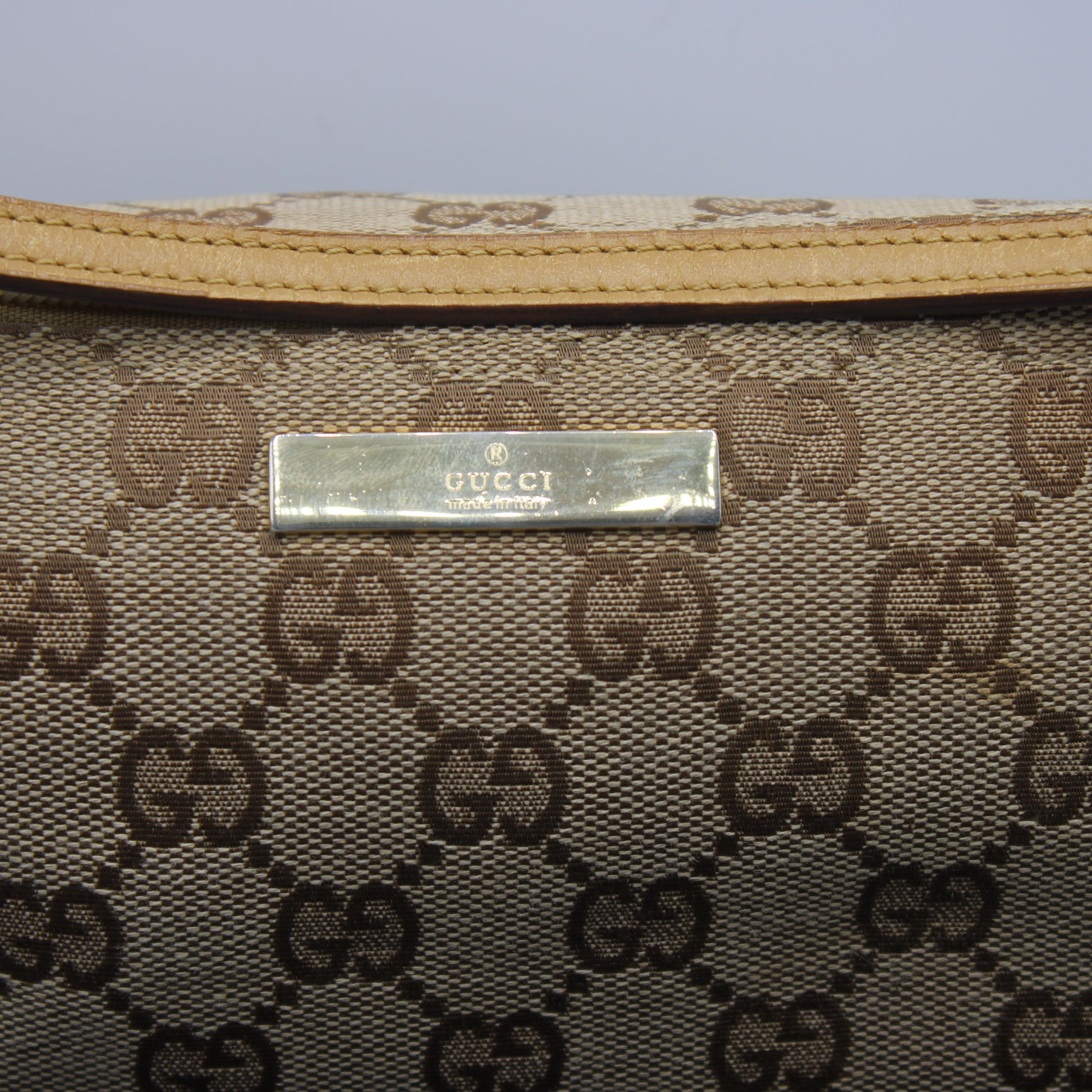 Stefany Bags Shoes and More presents this authentic Gucci small handbag crafted in signature beige GG canvas with luxurious camel leather trim and gold-tone hardware. With its minimalist boat silhouette and slim profile, this piece is a rare and versatile addition to any vintage collection. The zip top opens to reveal a clean dark textile-lined interior, featuring the embossed Gucci leather tag and serial number (G89 4103 / 3903), confirming its authenticity and Italian craftsmanship.