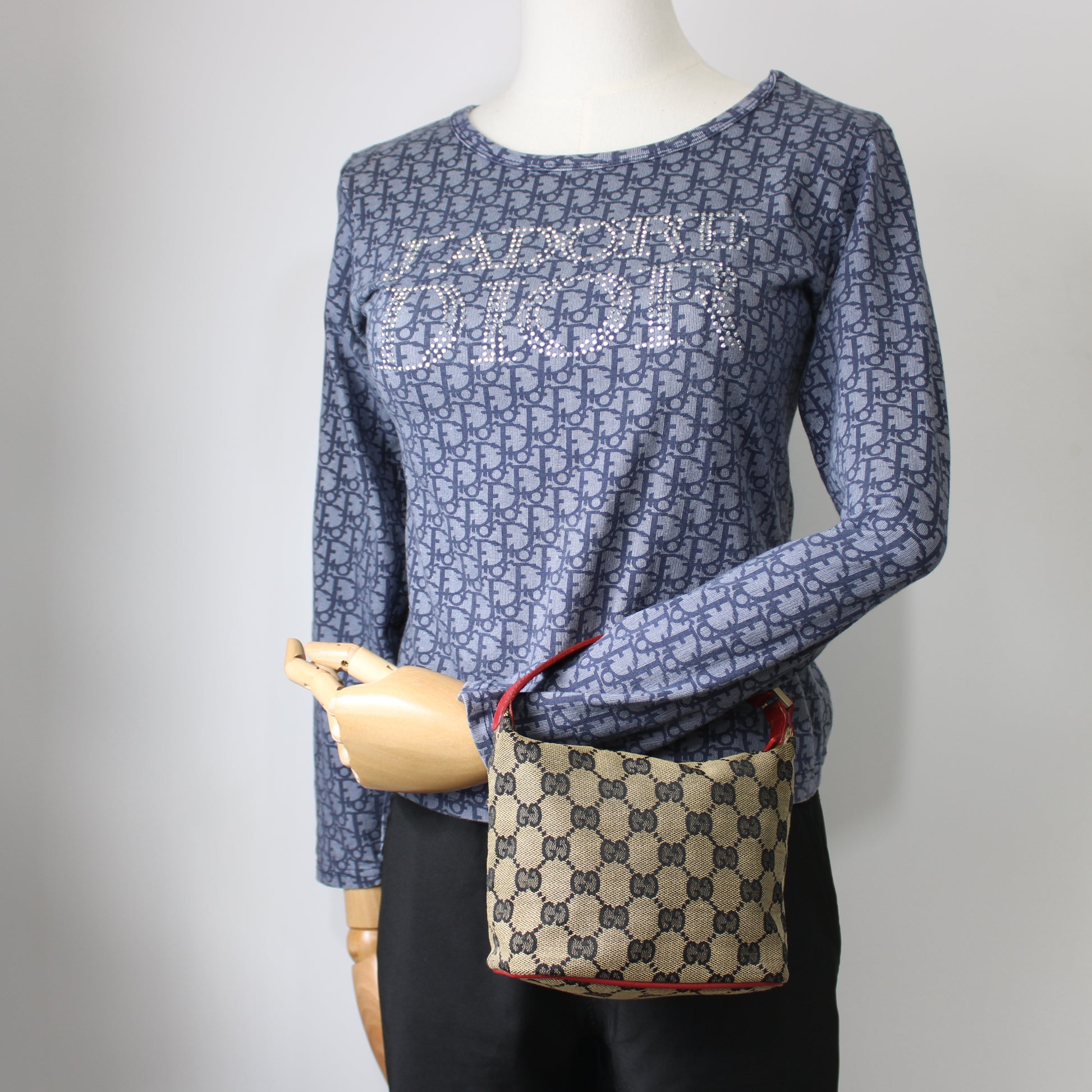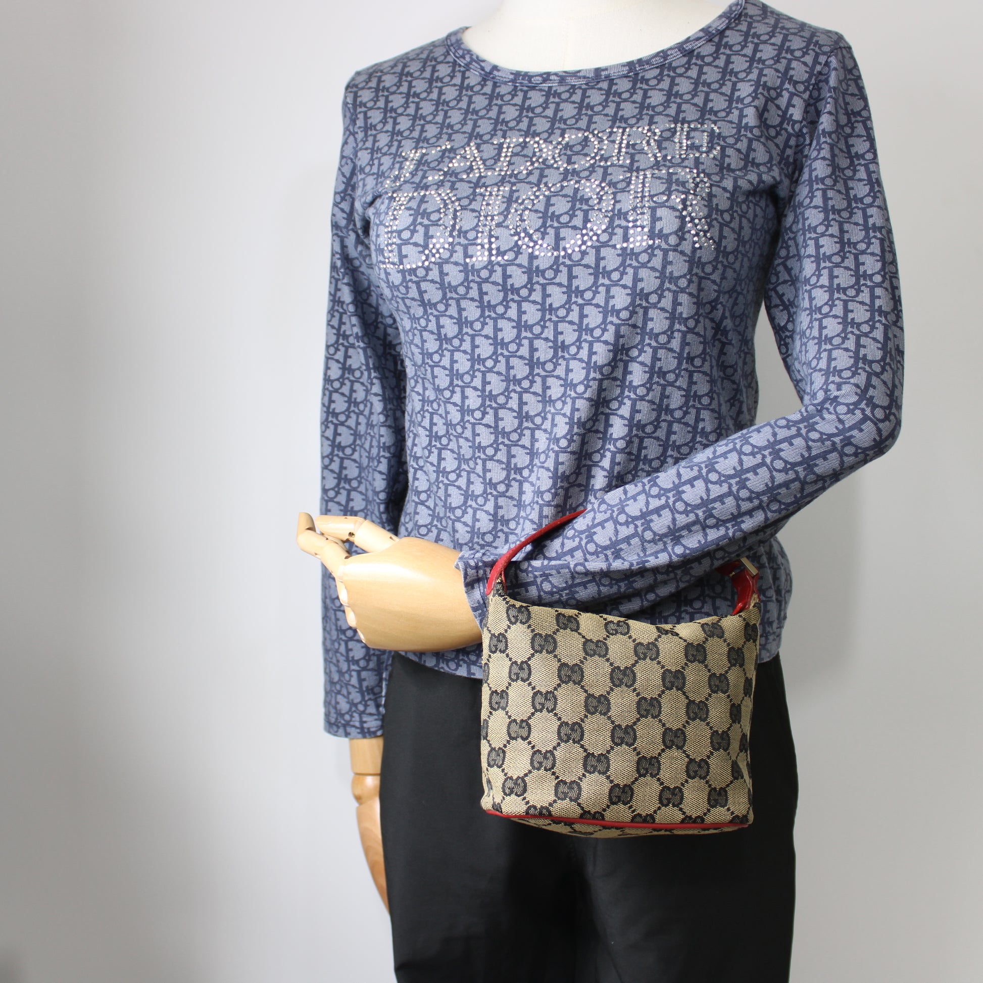 Stefany Bags Shoes and More presents this authentic Gucci mini handbag, a timeless vintage piece showcasing the brand’s iconic beige GG monogram canvas, elegantly accented with bold red leather trim and handle. Crafted in Italy, this model 002.058 pouch embodies the early 2000s aesthetic with a structured rectangular silhouette and zip-top closure. Perfectly sized for daily essentials or evening outings, its practical 6 x 5 inches dimensions offer stylish functionality. Inside, a black textile lining with a red Gucci leather tag confirms its authenticity, while the compact structure complements any chic outfit. This sought-after vintage Gucci mini bag is ideal for collectors and fashion lovers searching for authentic vintage Gucci bags in Boston or online.