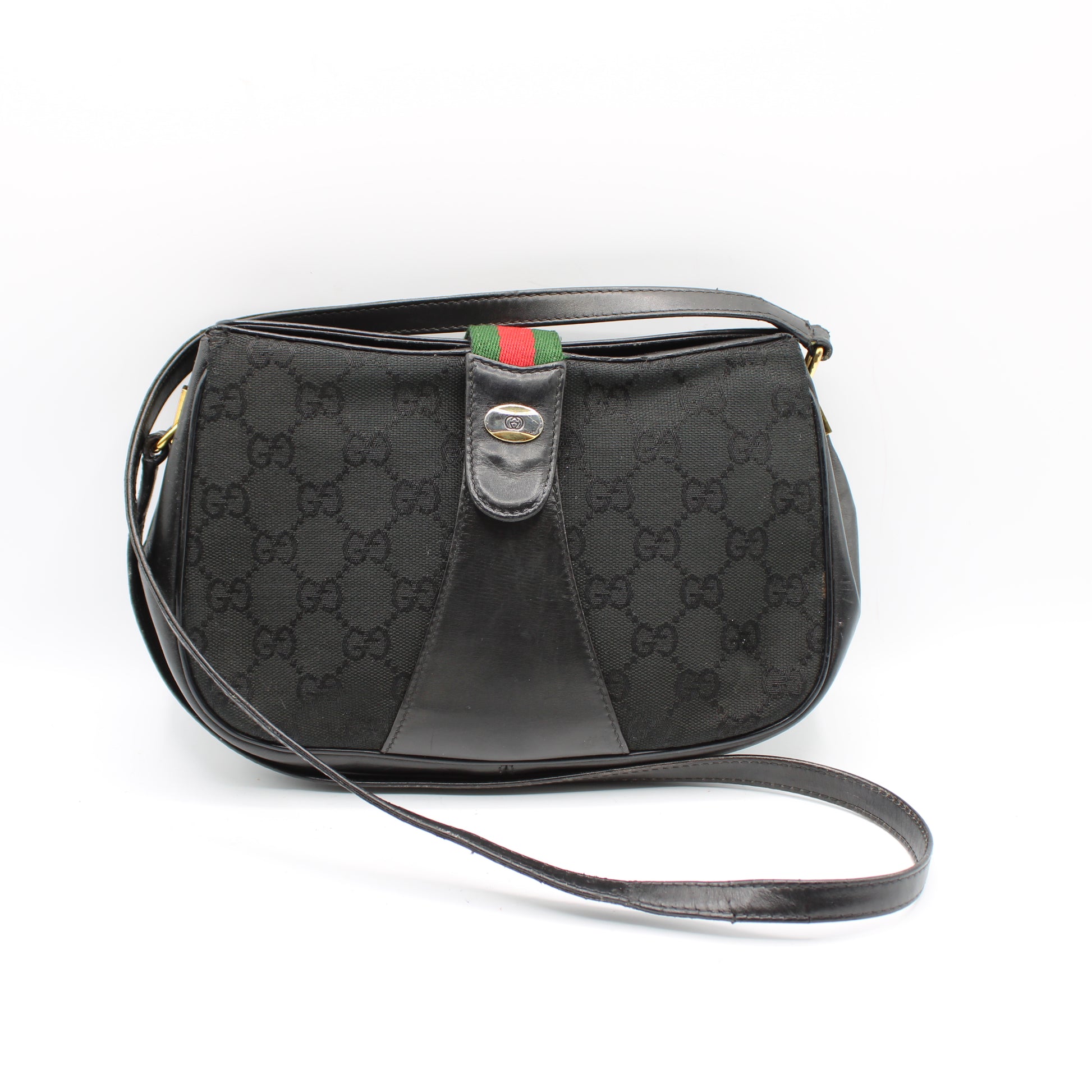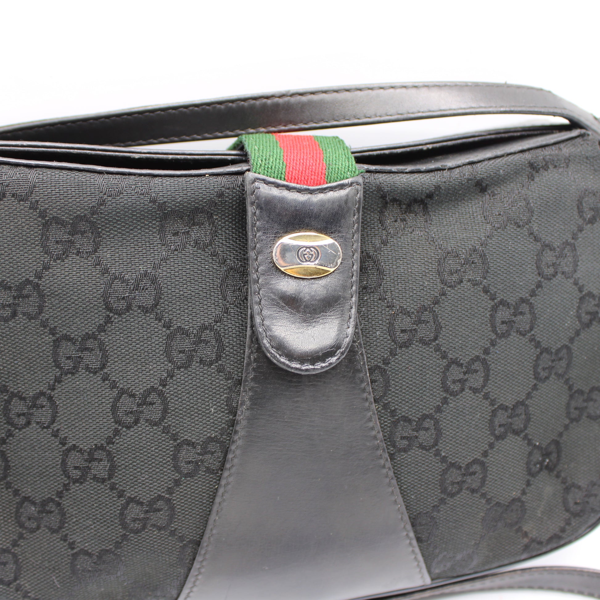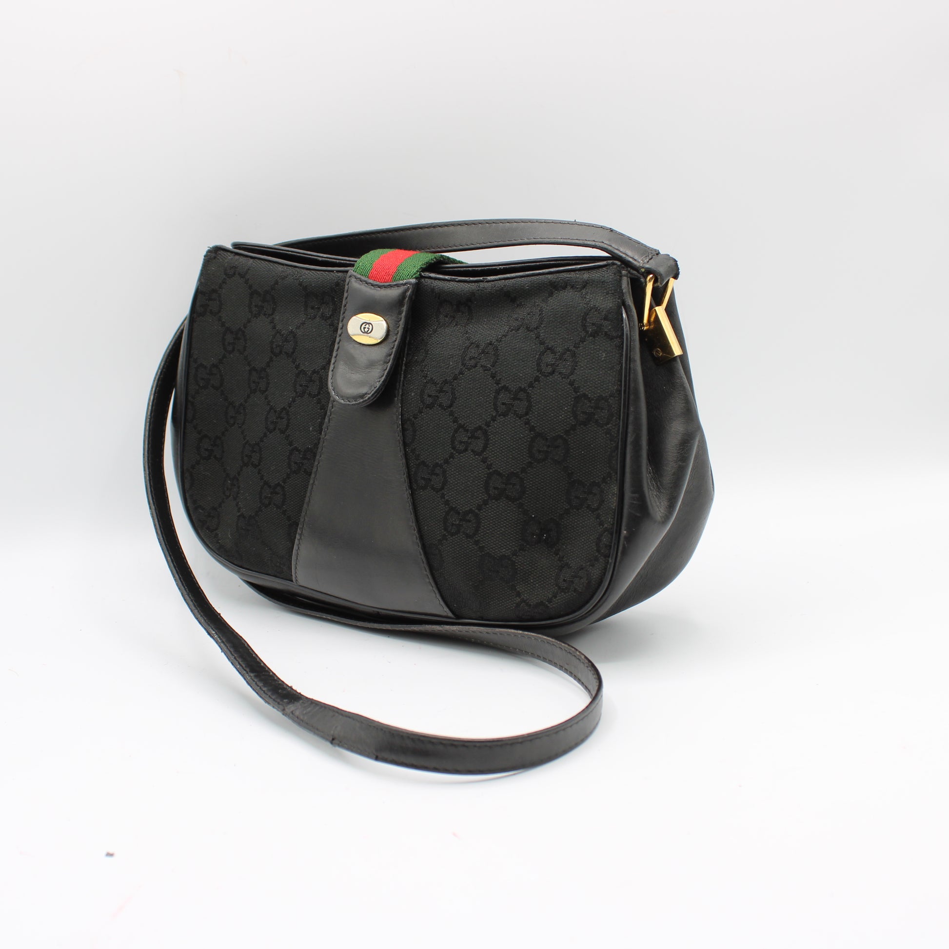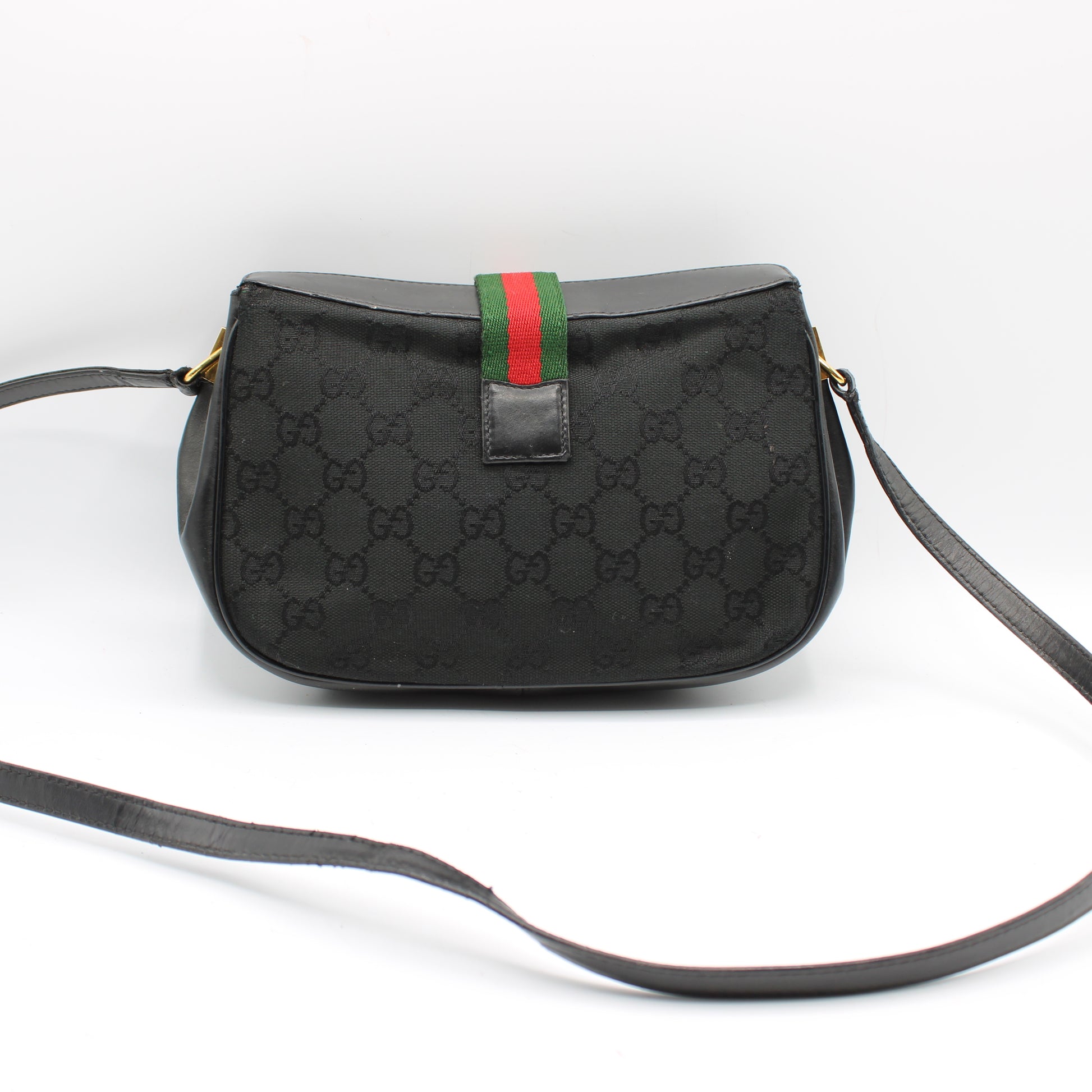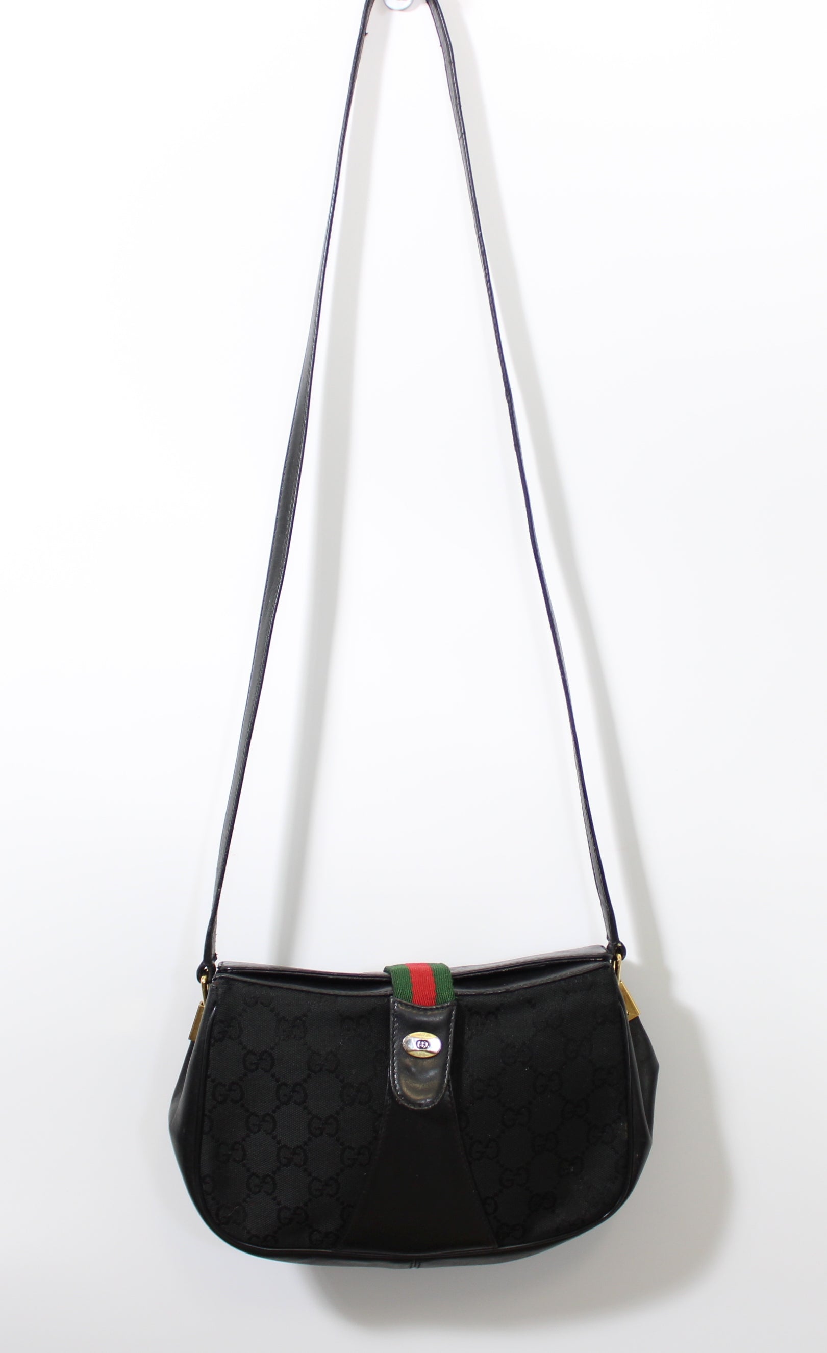 Stefany Bags Shoes and More proudly presents this authentic vintage Gucci Black GG Canvas Crossbody Bag, a timeless and iconic design crafted in Italy. This classic piece features Gucci’s signature black GG monogram canvas paired with smooth black leather trim, creating an effortlessly elegant silhouette that remains highly sought after among collectors of authentic vintage Gucci bags. The structured flap design is accented with a gold-tone snap closure and a subtle green and red web detail, reflecting Gucci’s heritage aesthetic. Designed for everyday wear, this crossbody bag offers a lightweight yet functional option that transitions seamlessly from day to evening, making it an excellent choice for anyone searching for authentic vintage Gucci crossbody bags available in Boston.