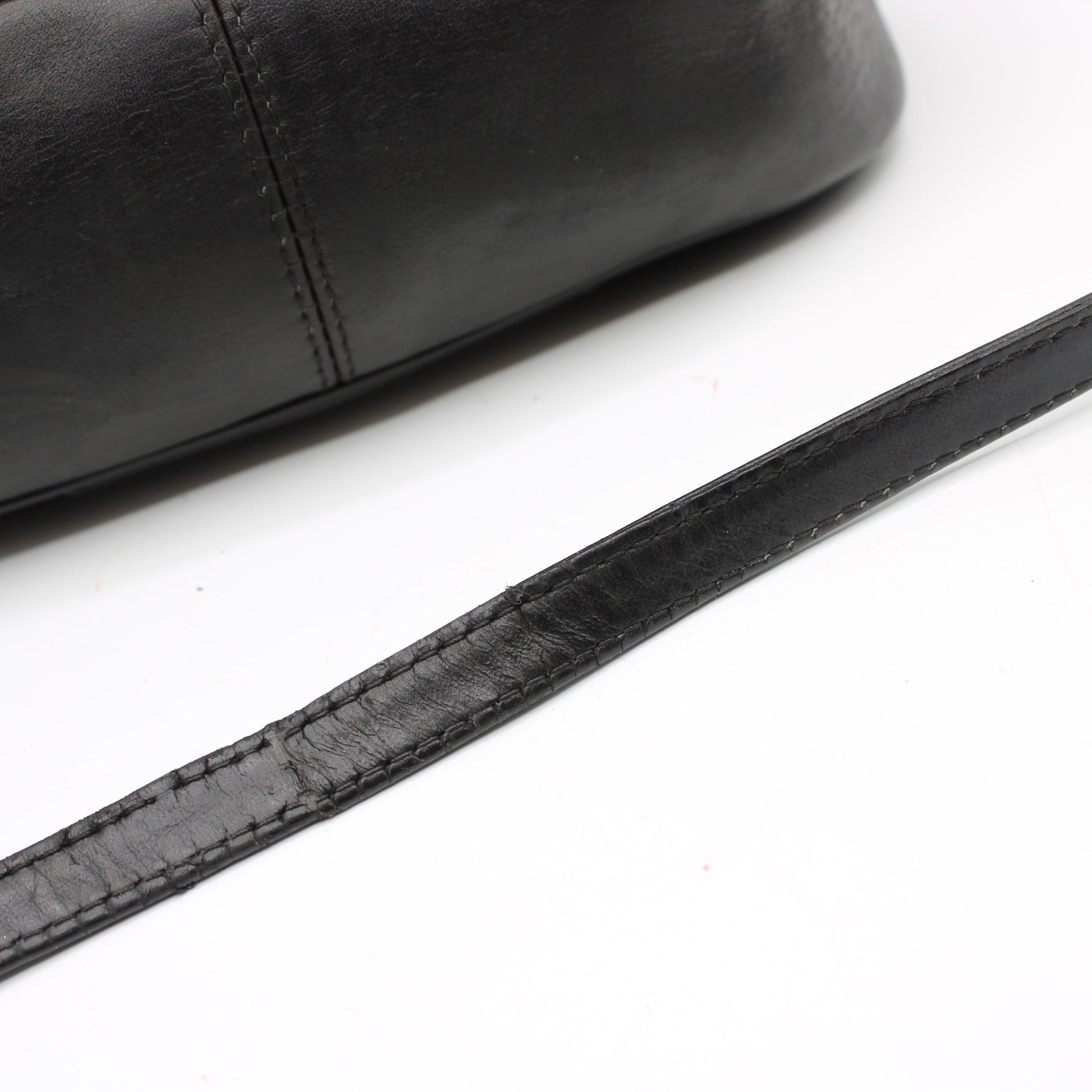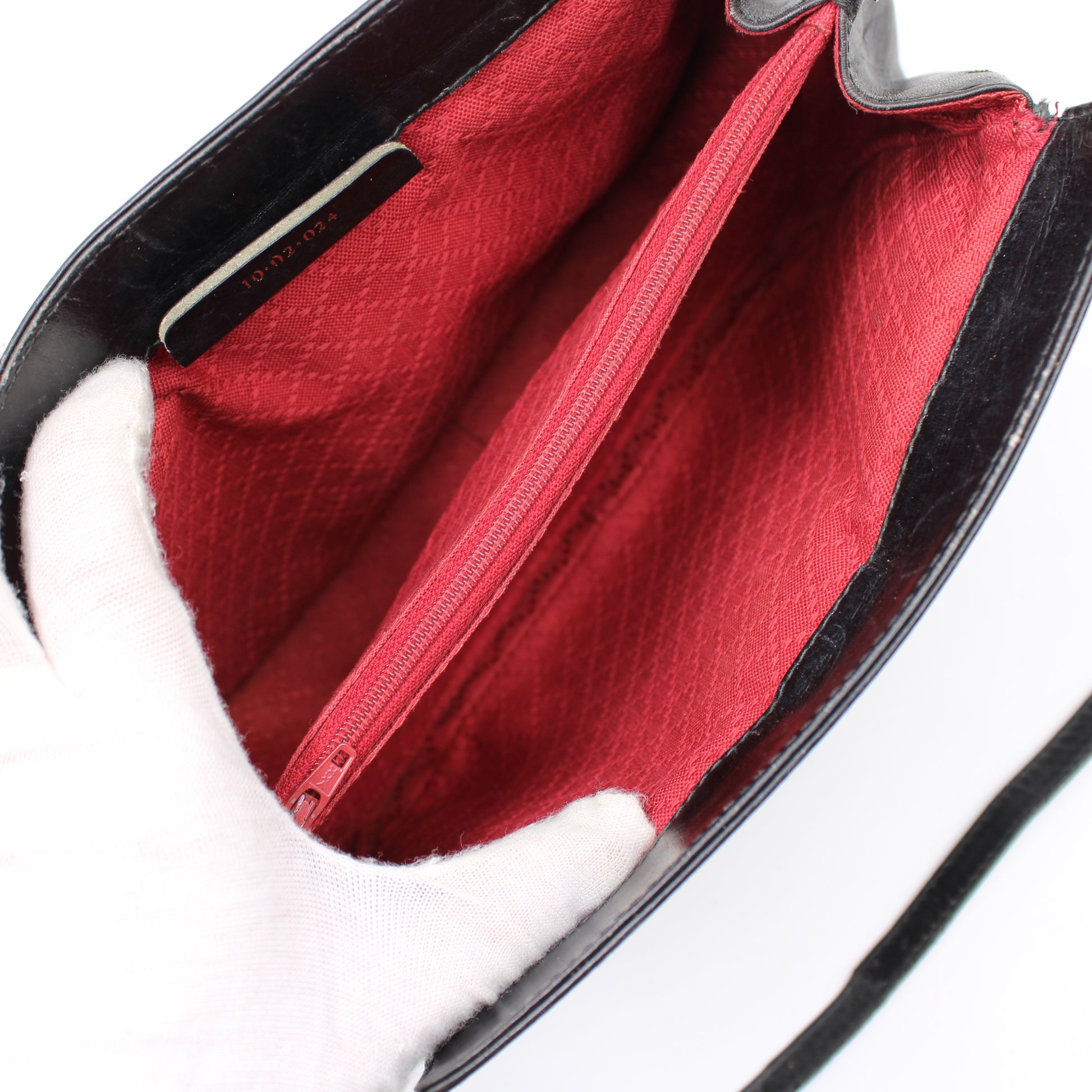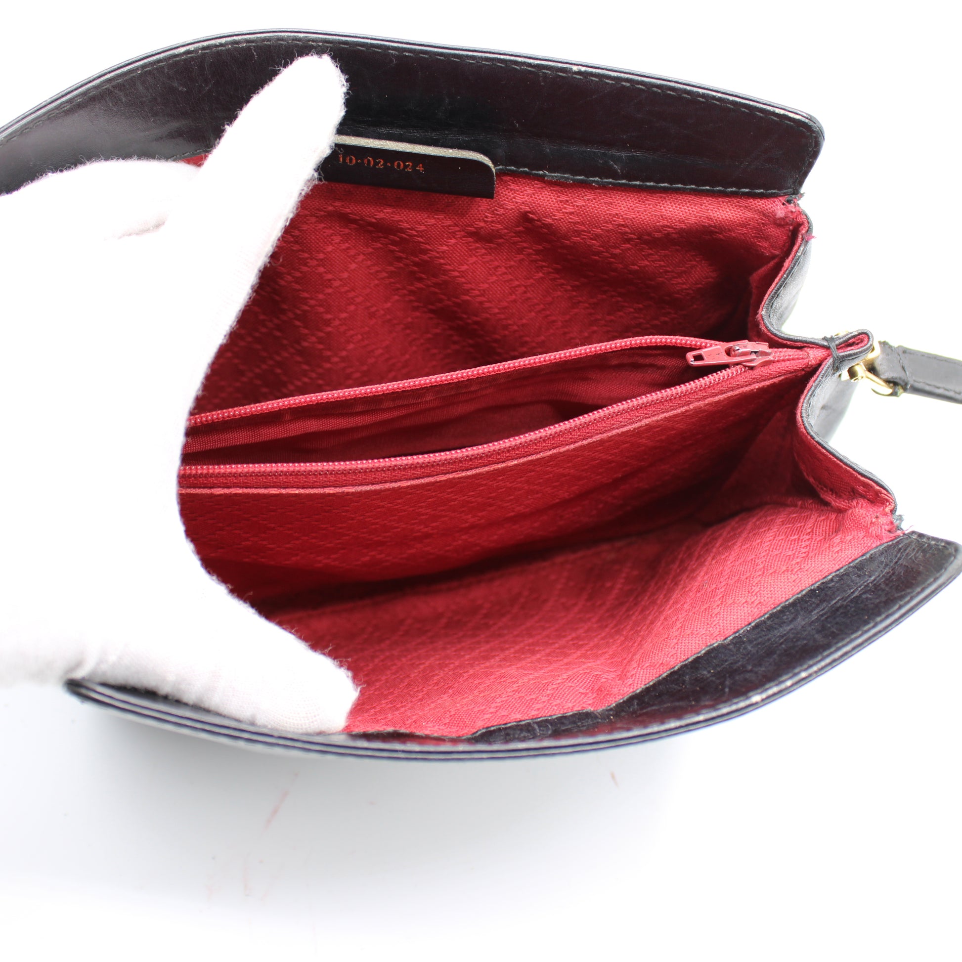 The interior is lined in rich red fabric and includes a zippered center compartment, providing organized storage for daily essentials. Measuring approximately 9 inches wide by 7 inches high, this bag offers a compact yet practical size ideal for hands-free wear. The adjustable leather strap allows comfortable crossbody styling while maintaining the bag’s sleek profile. This piece is in Good vintage condition, showing visible wear consistent with age, including wear on the leather strap and light signs of use throughout the exterior and interior. These signs of wear are typical for a vintage item and are not noticeable during daily wear. Please refer closely to the detailed photos provided for the most accurate representation of the bag’s condition.