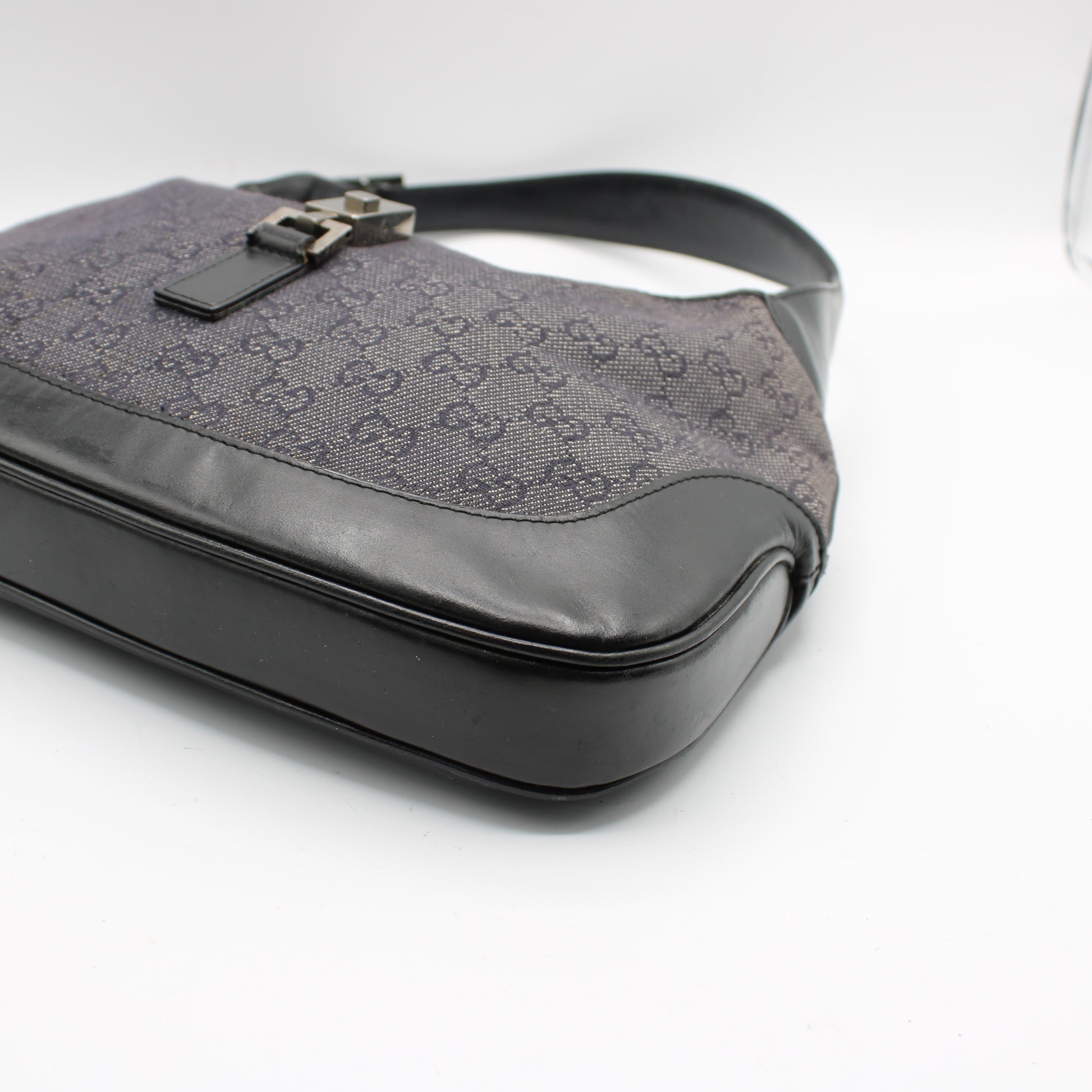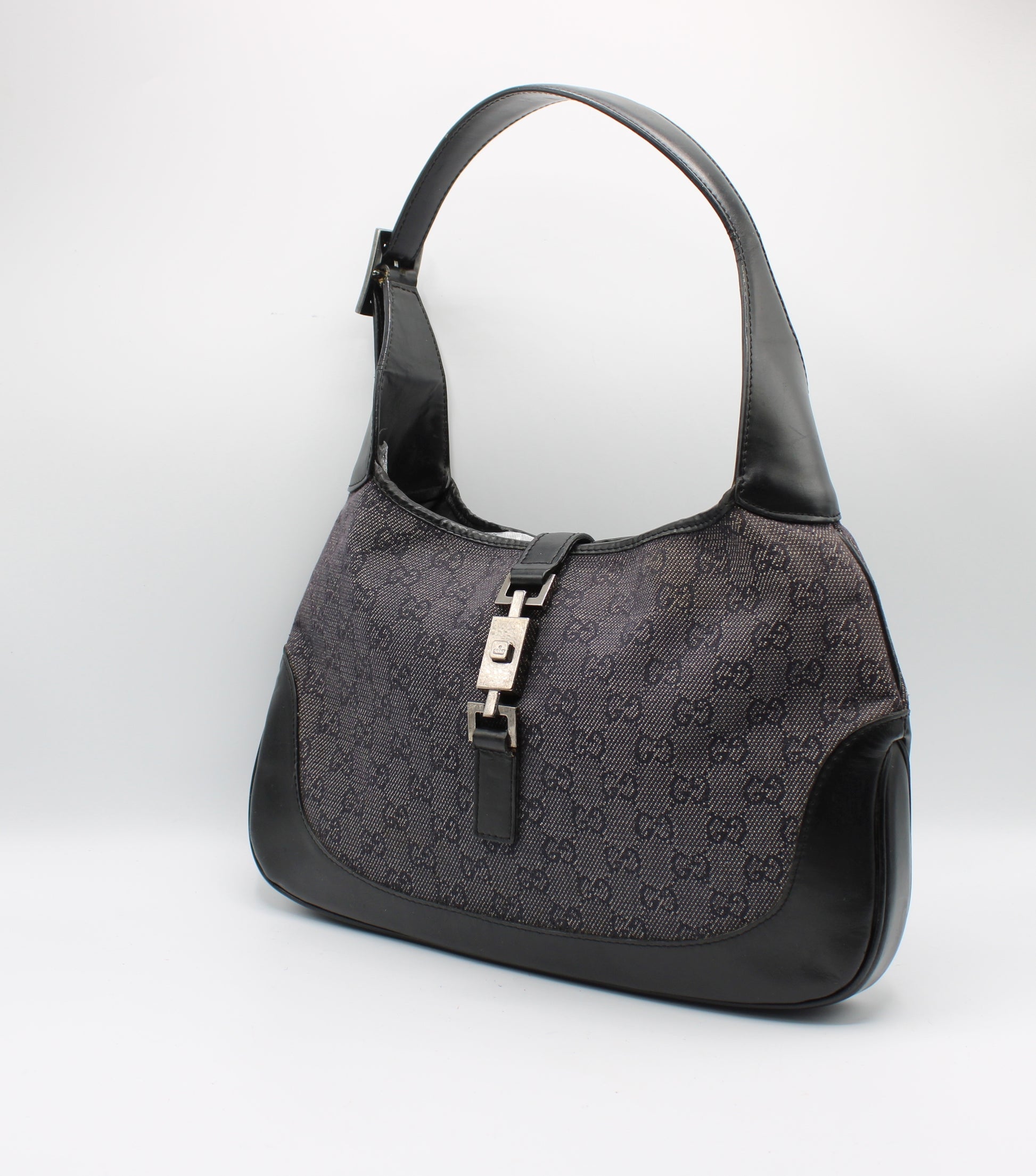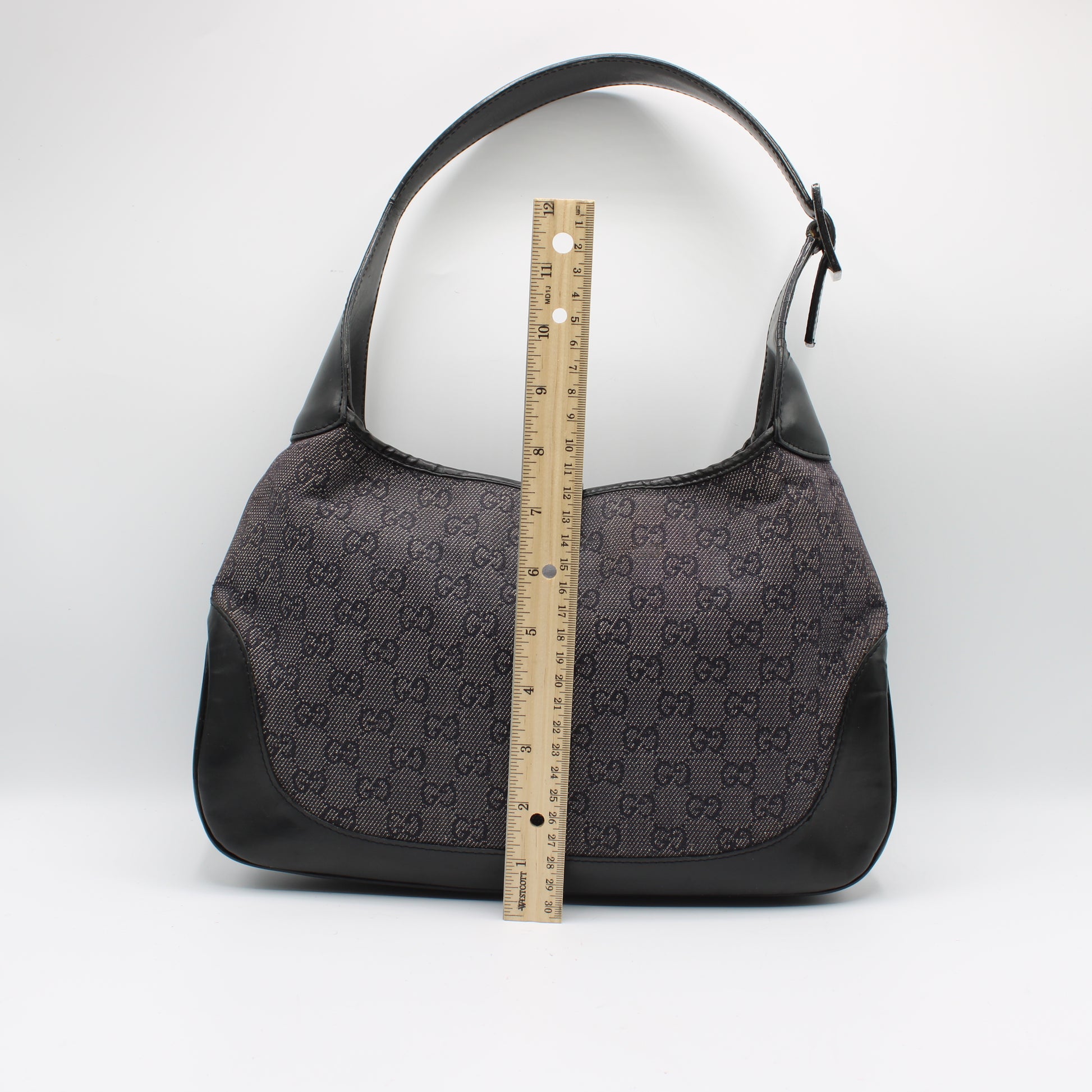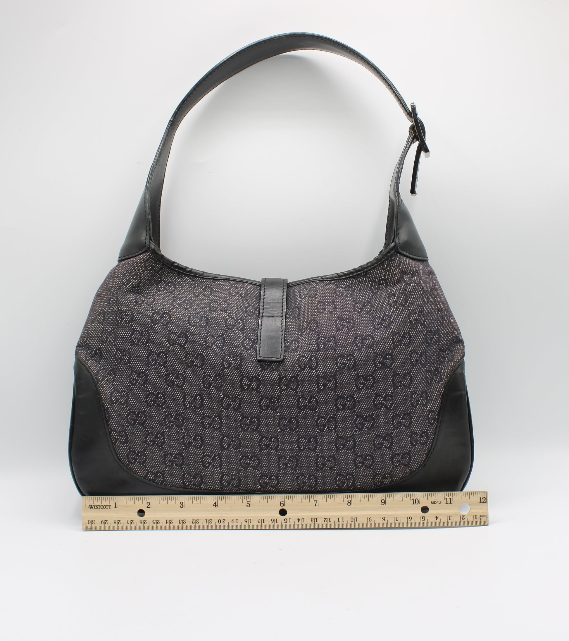 Stefany Bags Shoes and More proudly offers this authentic vintage Gucci Jackie shoulder handbag, crafted in signature black-on-charcoal GG denim canvas and framed by smooth black calfskin leather trim. The iconic piston-clasp tab cascades down the front, echoing the storied design Jackie Kennedy popularized, while an adjustable leather strap lets you swing it comfortably by hand or slip it beneath your arm. A black textile lining conceals a secure zip pocket and tidy slip compartment, keeping essentials organized. Measuring approximately 12" W × 8" H, this streamlined silhouette is compact yet capacious enough for phone, wallet, keys, and a petite makeup kit—perfect for everyday elevation or an elegant evening out.