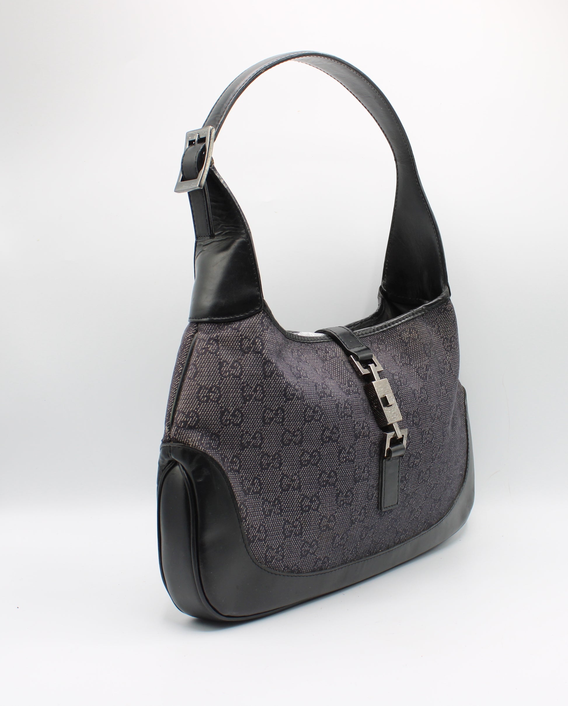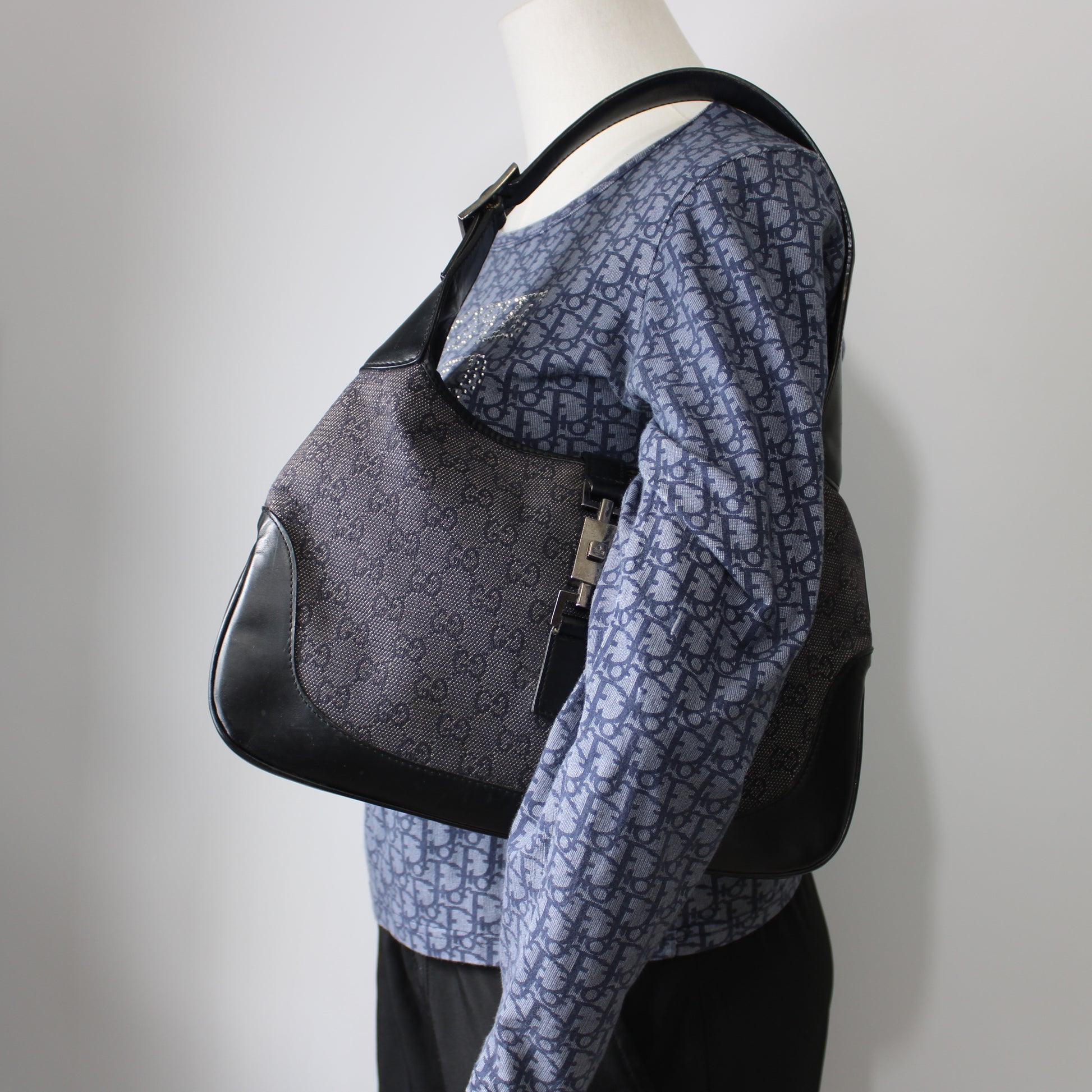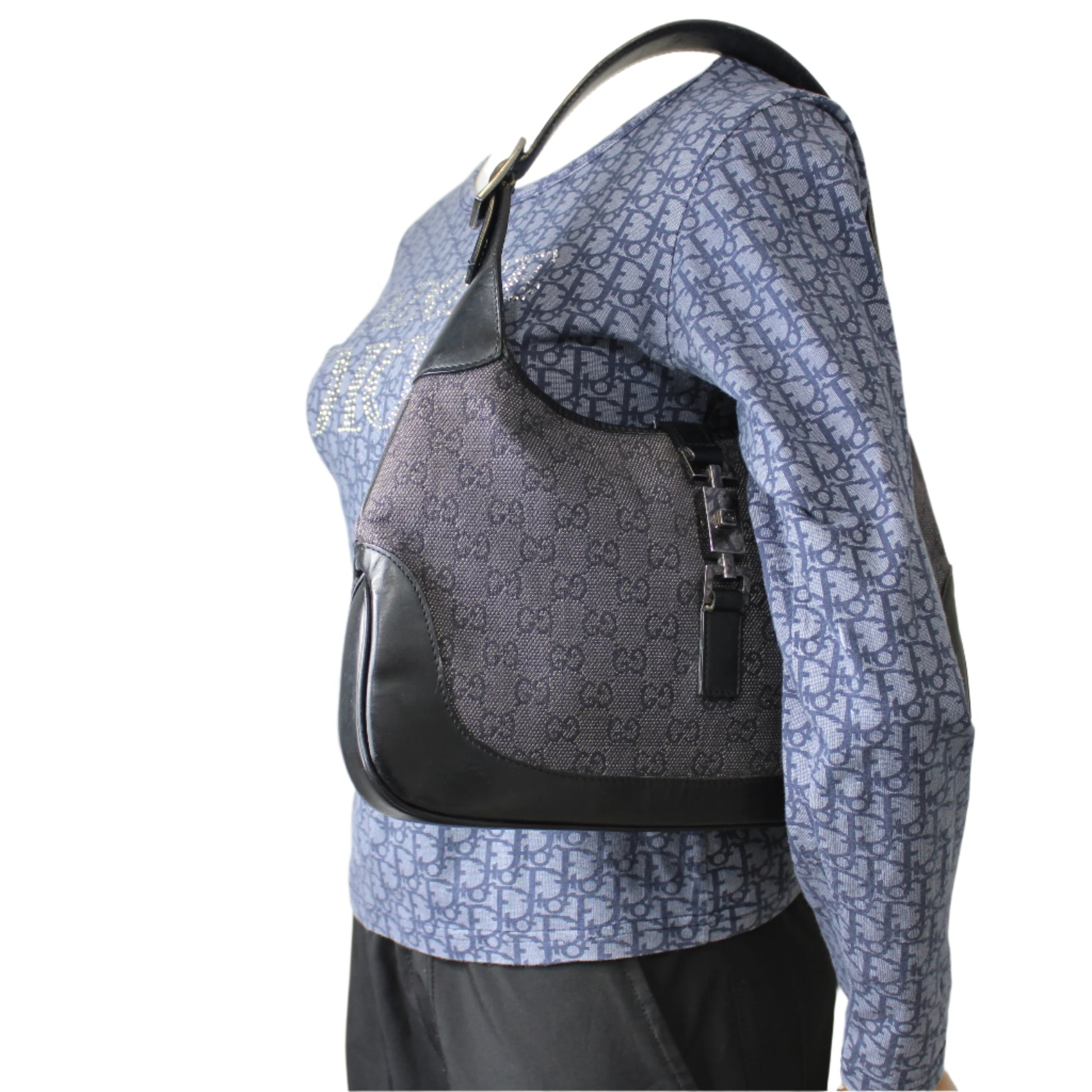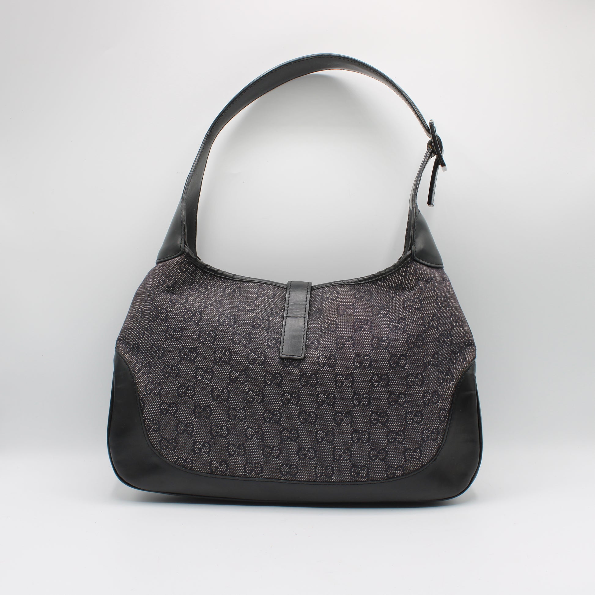 Stefany Bags Shoes and More proudly offers this authentic vintage Gucci Jackie shoulder handbag, crafted in signature black-on-charcoal GG denim canvas and framed by smooth black calfskin leather trim. The iconic piston-clasp tab cascades down the front, echoing the storied design Jackie Kennedy popularized, while an adjustable leather strap lets you swing it comfortably by hand or slip it beneath your arm. A black textile lining conceals a secure zip pocket and tidy slip compartment, keeping essentials organized. Measuring approximately 12" W × 8" H, this streamlined silhouette is compact yet capacious enough for phone, wallet, keys, and a petite makeup kit—perfect for everyday elevation or an elegant evening out.