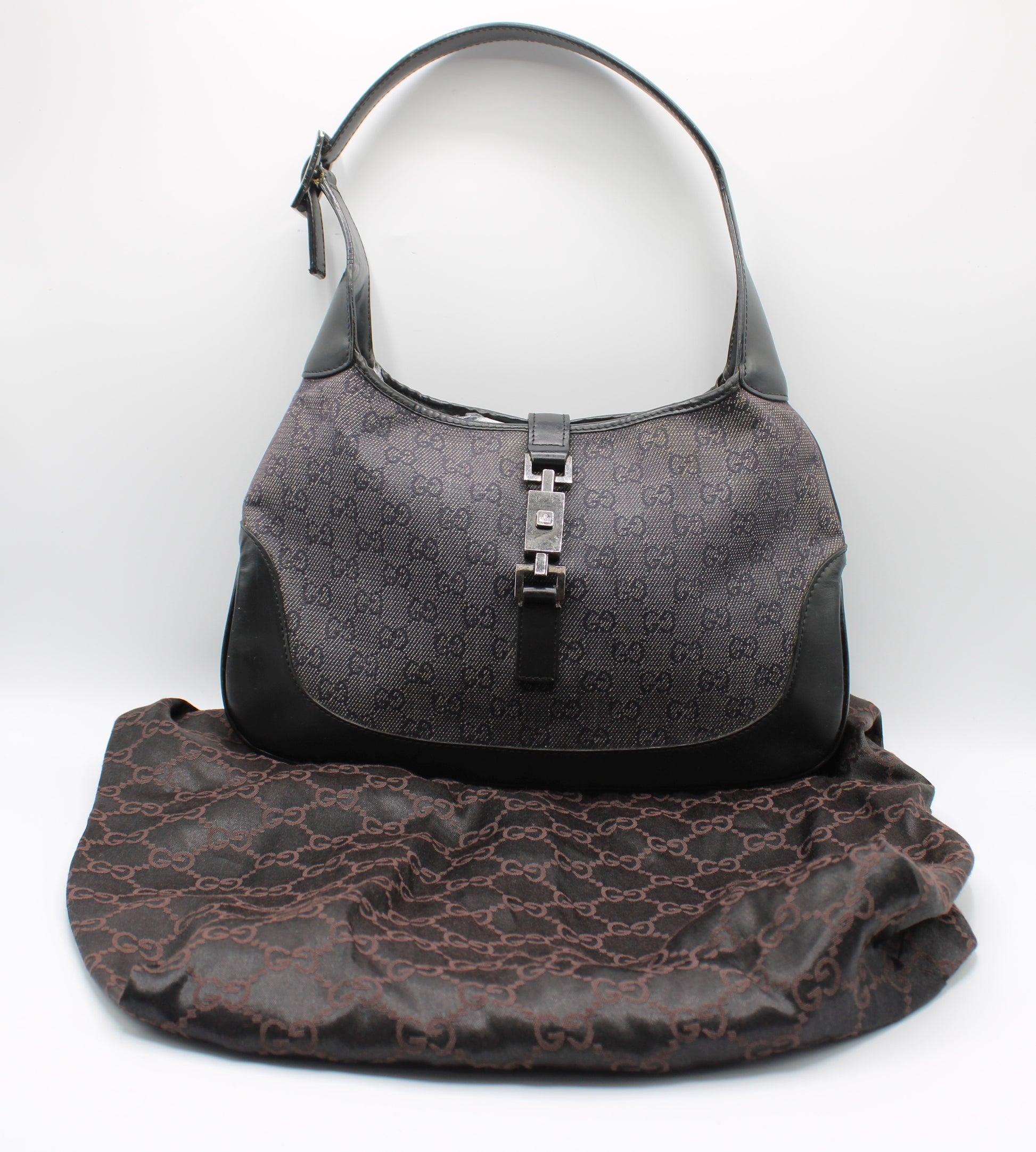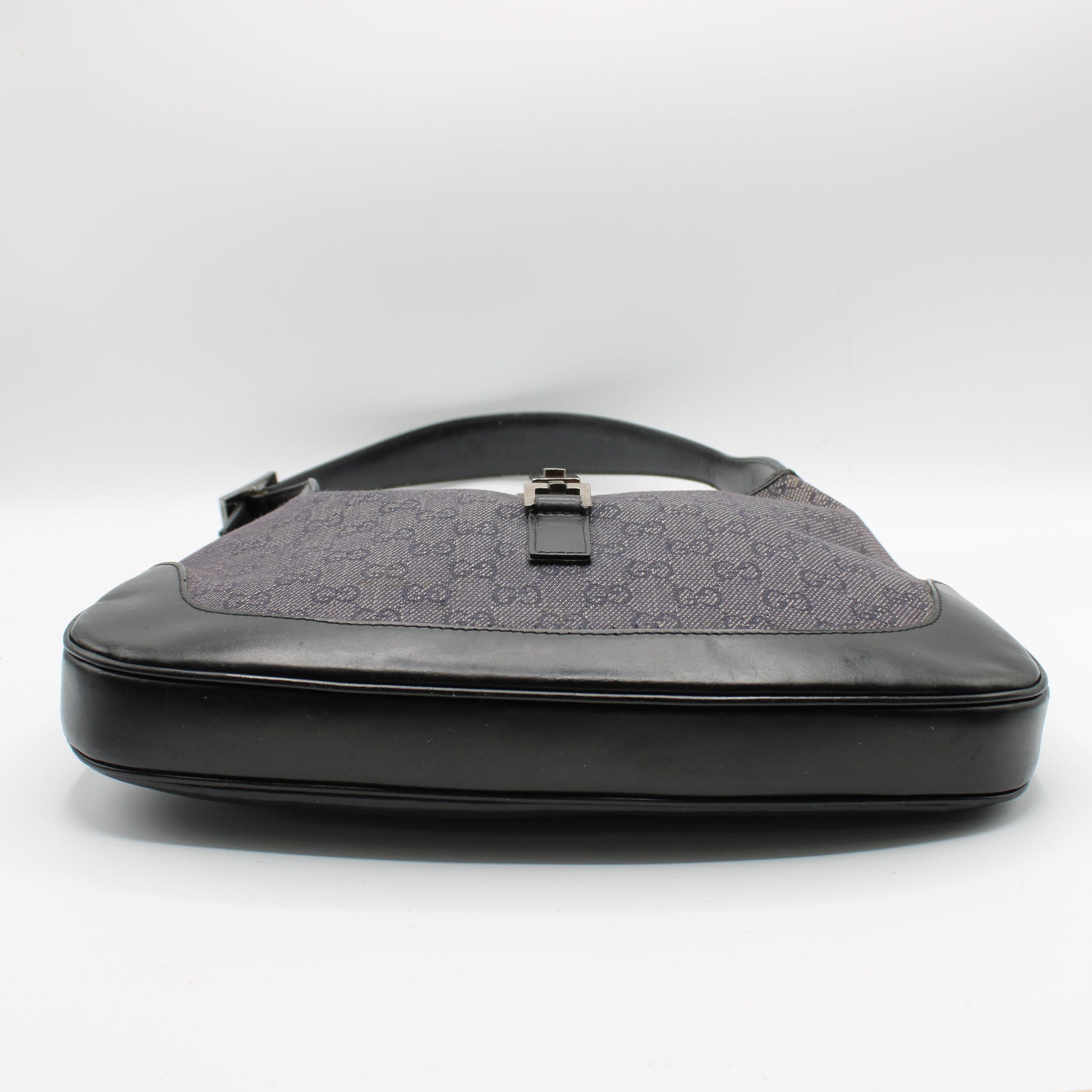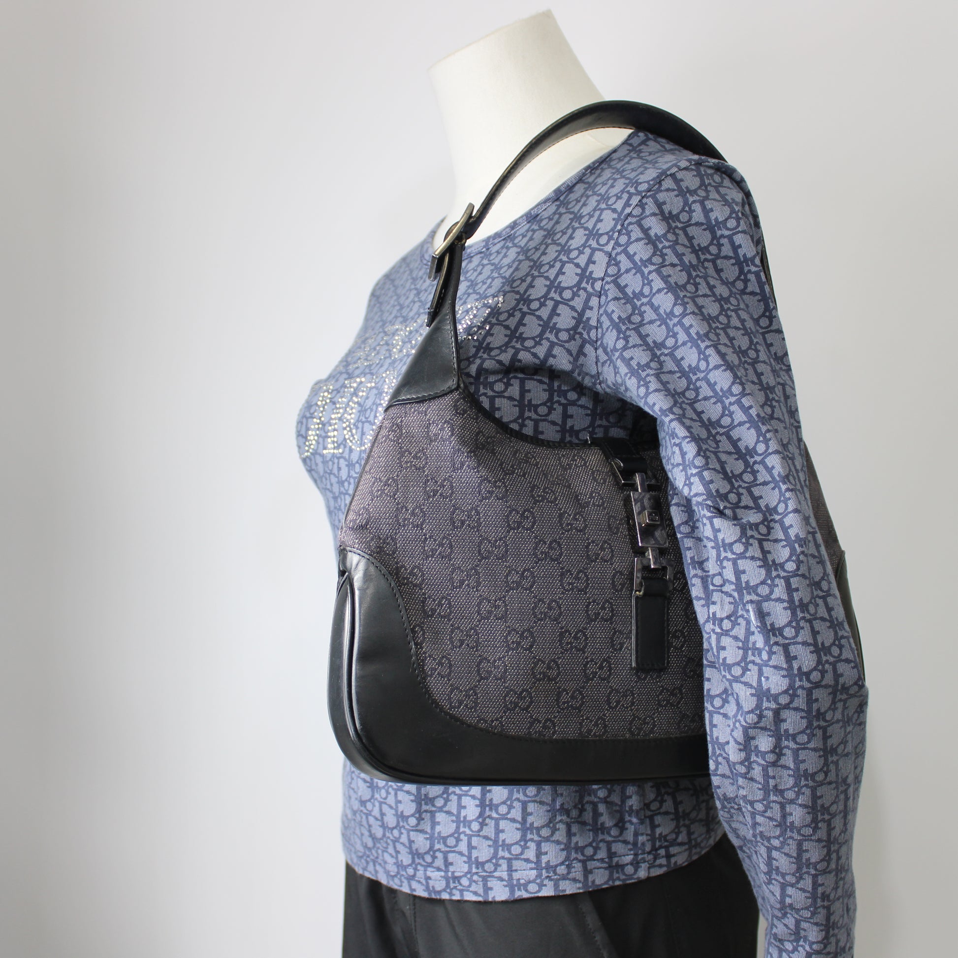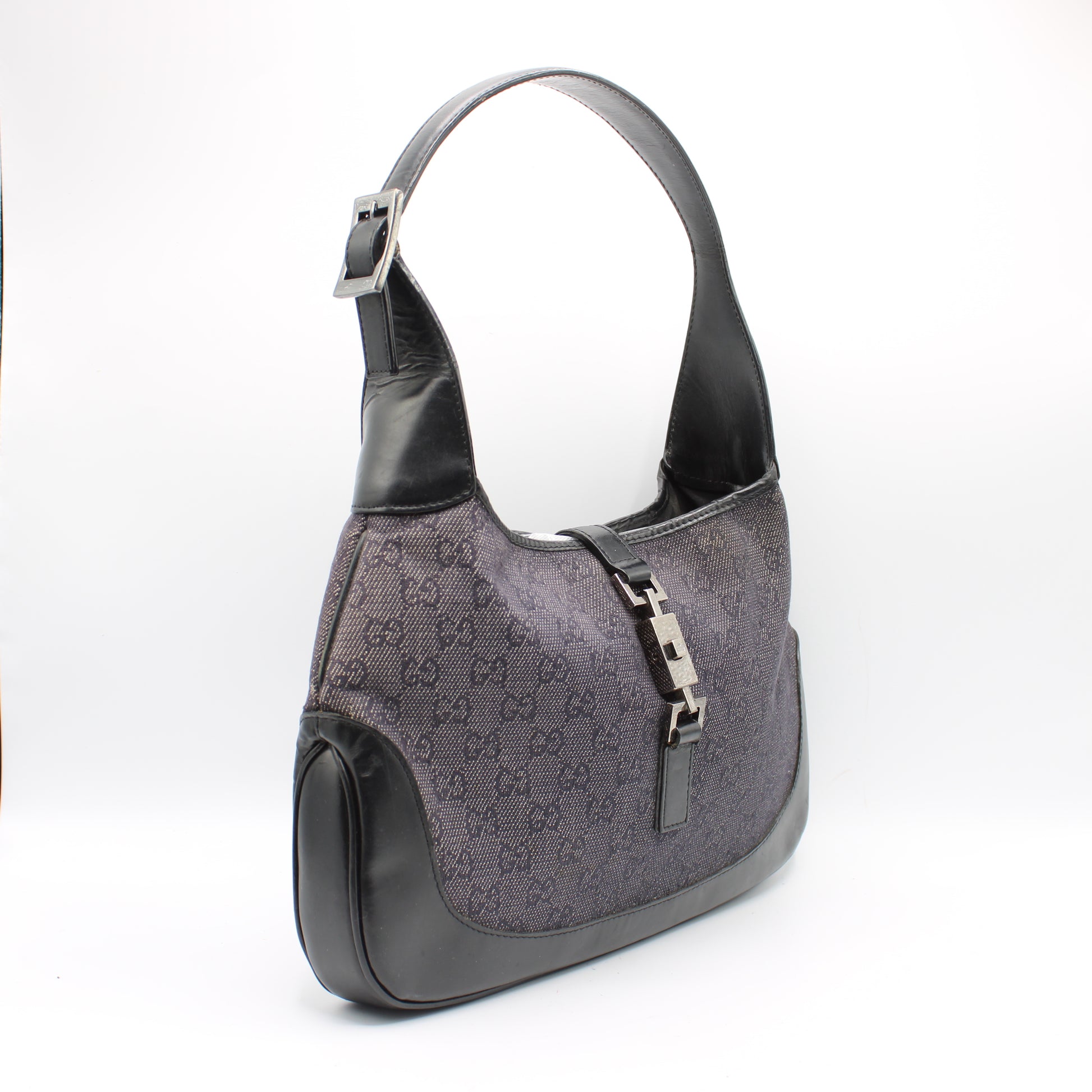 Stefany Bags Shoes and More proudly offers this authentic vintage Gucci Jackie shoulder handbag, crafted in signature black-on-charcoal GG denim canvas and framed by smooth black calfskin leather trim. The iconic piston-clasp tab cascades down the front, echoing the storied design Jackie Kennedy popularized, while an adjustable leather strap lets you swing it comfortably by hand or slip it beneath your arm. A black textile lining conceals a secure zip pocket and tidy slip compartment, keeping essentials organized. Measuring approximately 12" W × 8" H, this streamlined silhouette is compact yet capacious enough for phone, wallet, keys, and a petite makeup kit—perfect for everyday elevation or an elegant evening out.