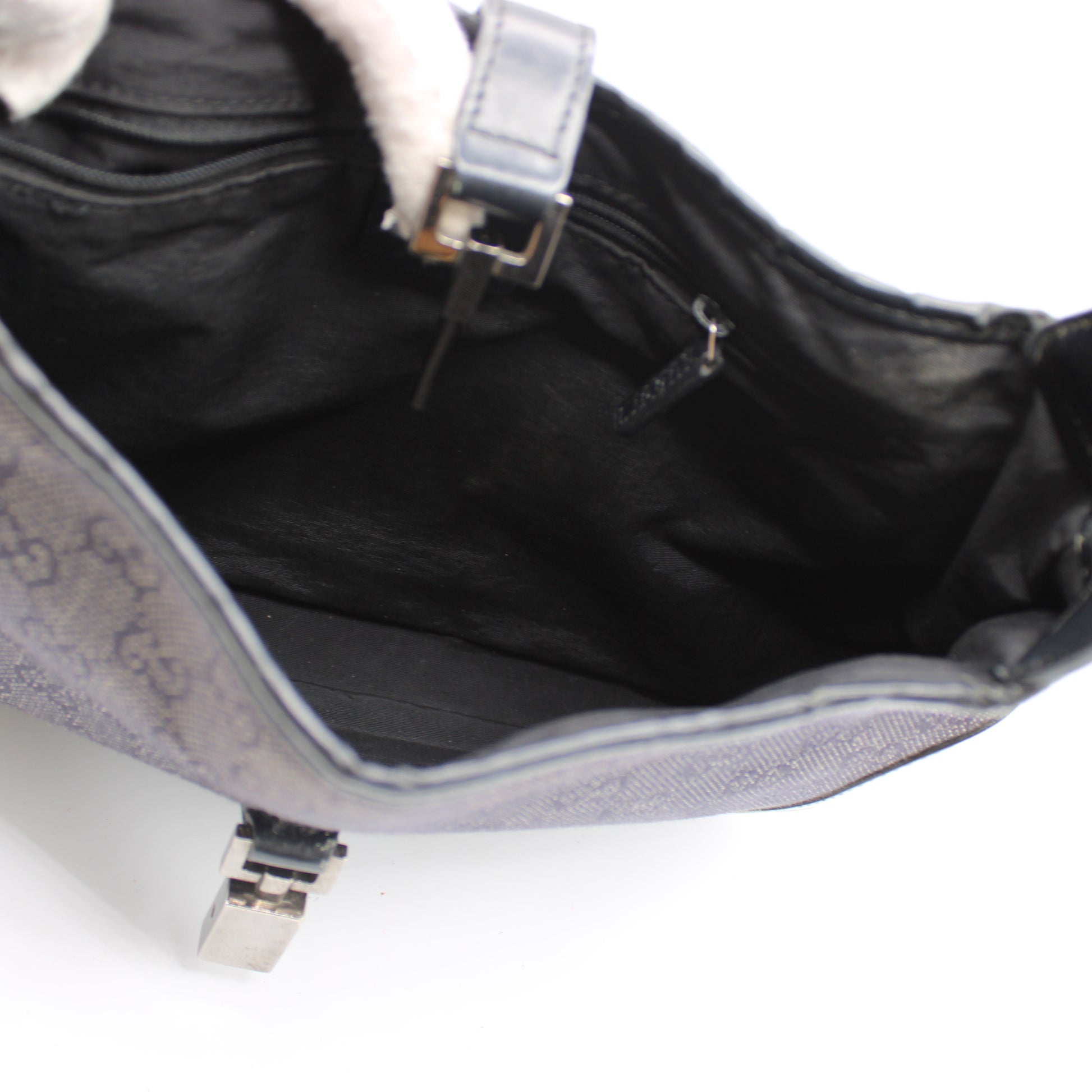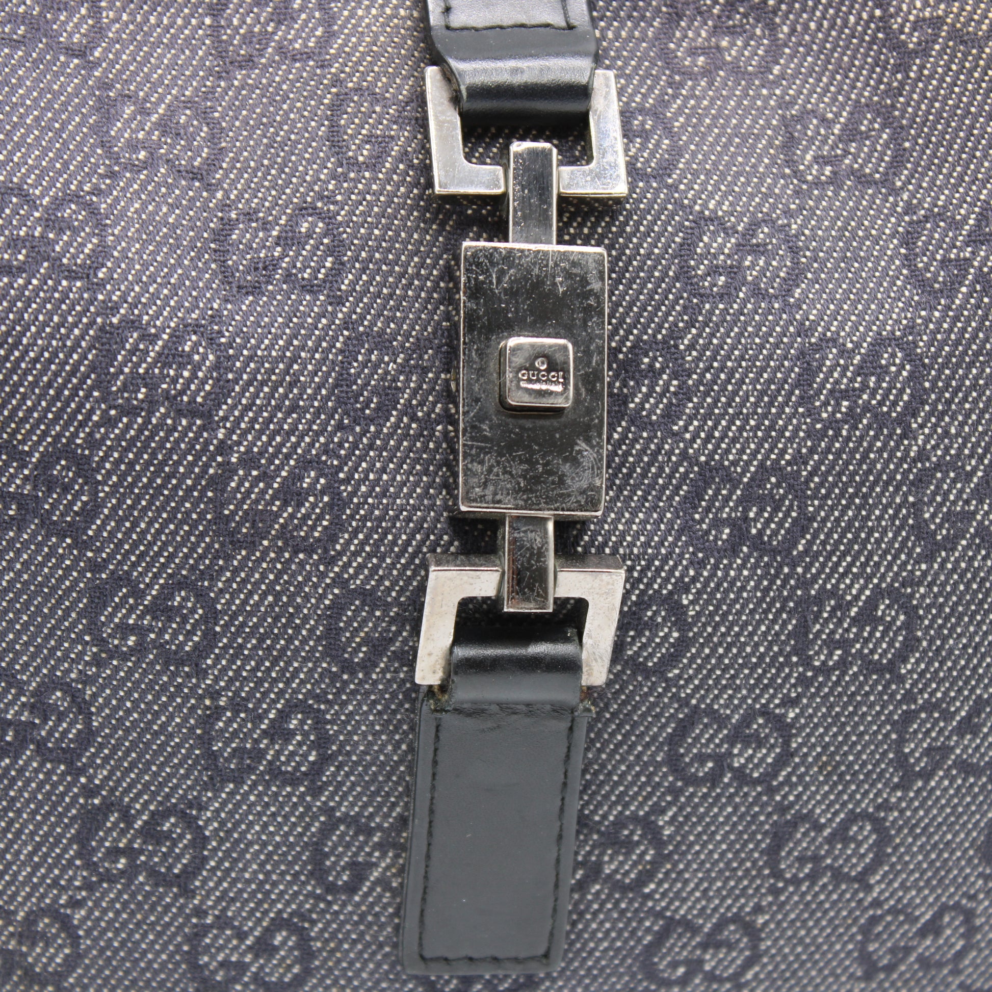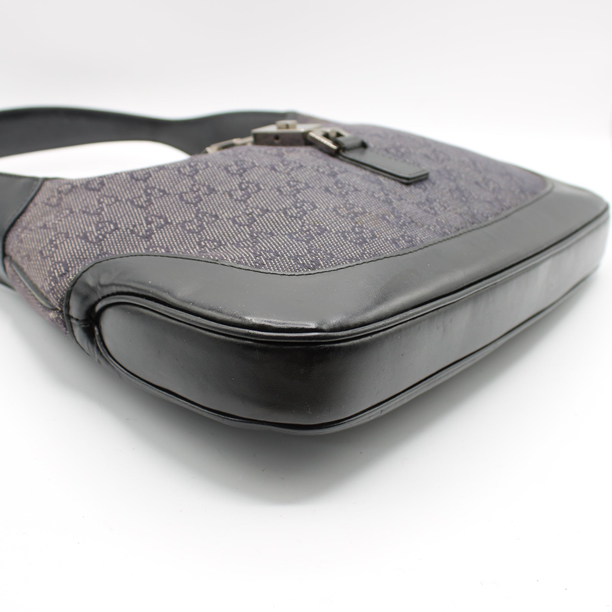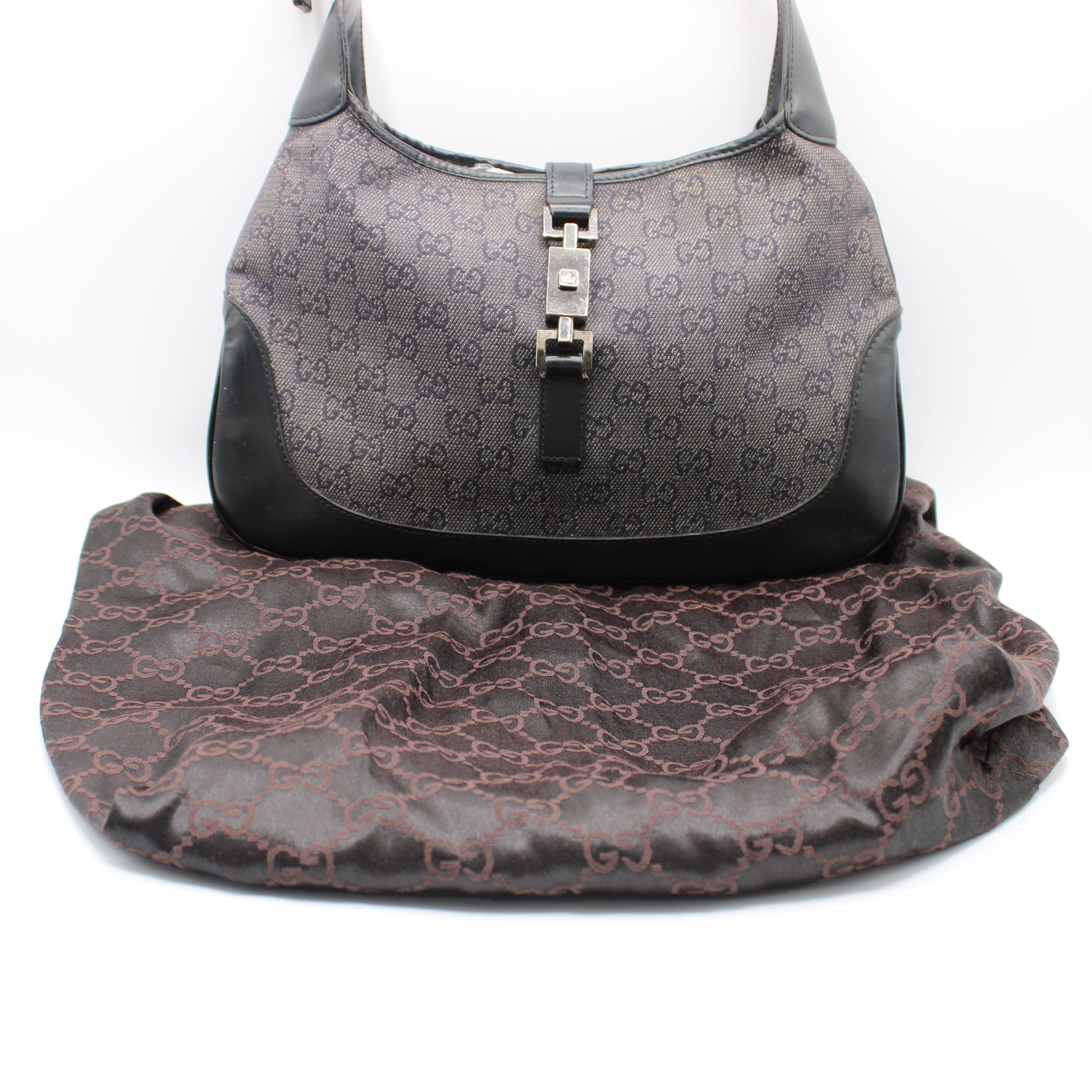 Stefany Bags Shoes and More proudly offers this authentic vintage Gucci Jackie shoulder handbag, crafted in signature black-on-charcoal GG denim canvas and framed by smooth black calfskin leather trim. The iconic piston-clasp tab cascades down the front, echoing the storied design Jackie Kennedy popularized, while an adjustable leather strap lets you swing it comfortably by hand or slip it beneath your arm. A black textile lining conceals a secure zip pocket and tidy slip compartment, keeping essentials organized. Measuring approximately 12" W × 8" H, this streamlined silhouette is compact yet capacious enough for phone, wallet, keys, and a petite makeup kit—perfect for everyday elevation or an elegant evening out.