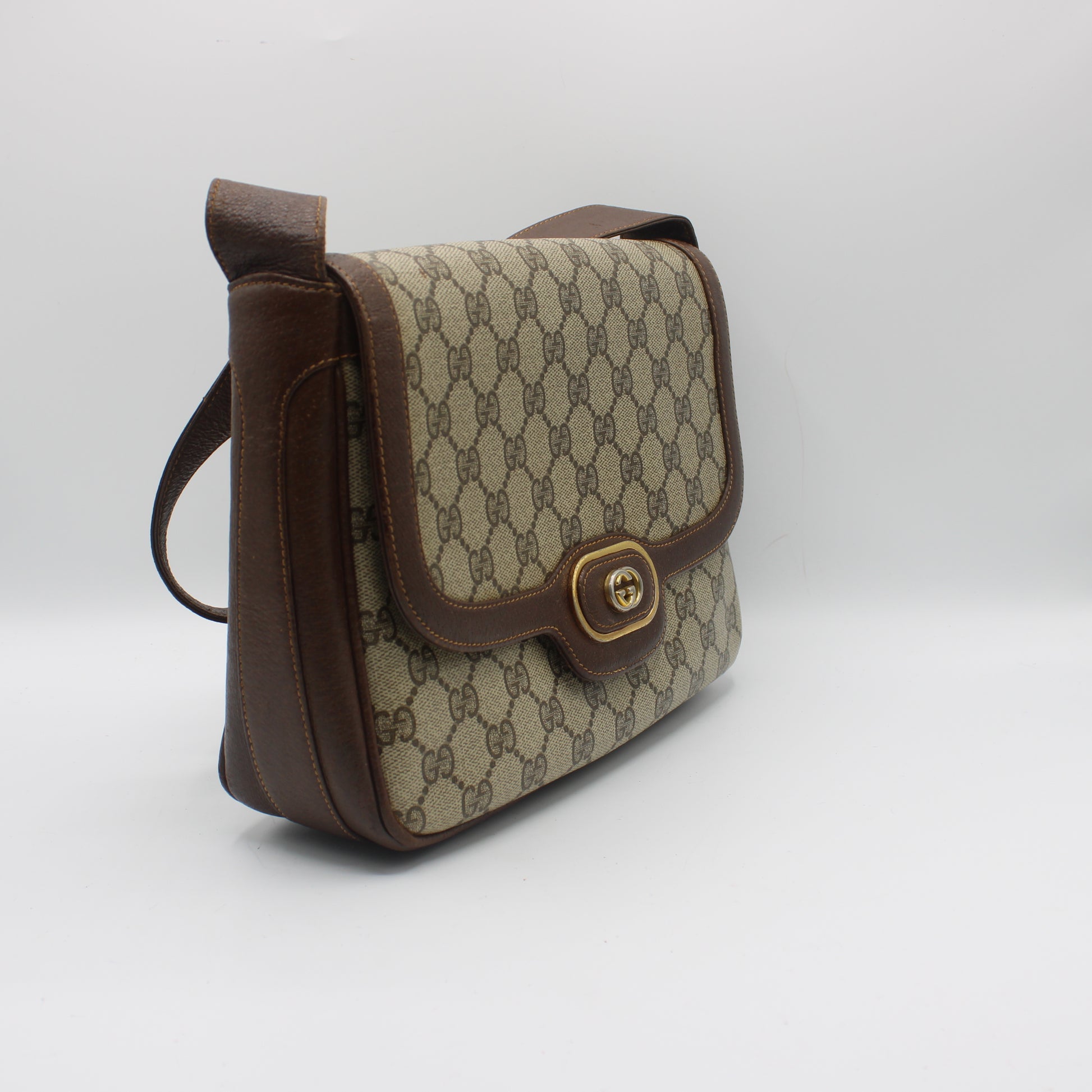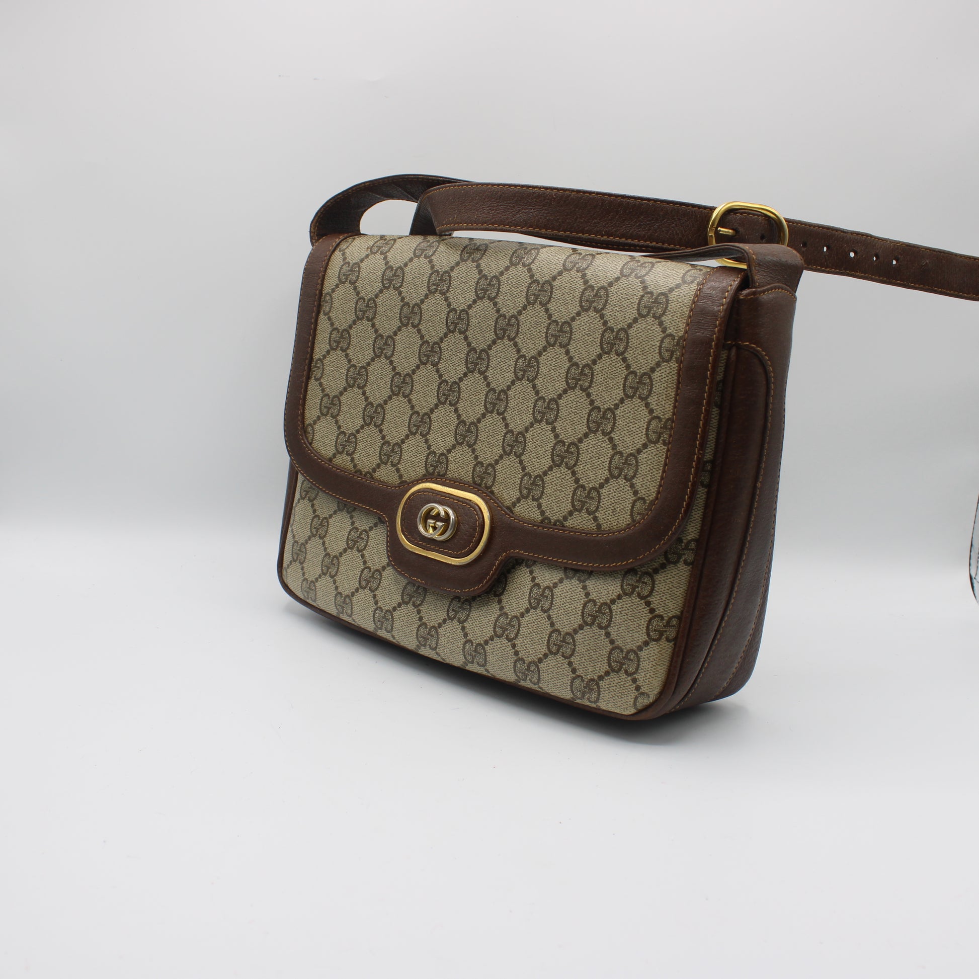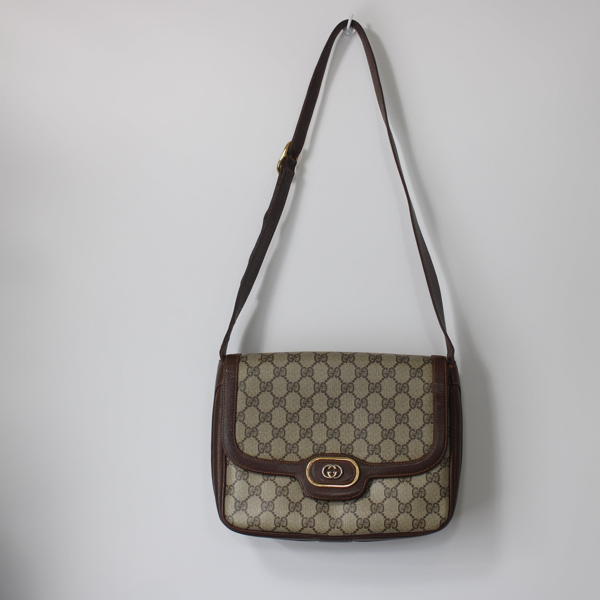 Stefany Bags Shoes and More presents this authentic Gucci coated GG canvas and leather shoulder bag, a timeless vintage piece that blends luxury and everyday functionality. Crafted in Italy, the exterior showcases Gucci’s signature beige and brown GG coated canvas framed by rich brown leather trim. The adjustable leather shoulder strap ensures comfortable crossbody or shoulder wear, while the front flap is adorned with a gold and silver-toned interlocking GG logo plaque for a refined touch. Measuring approximately 10 x 9 inches, it is perfectly sized for daily essentials, offering an elegant yet practical style that transitions seamlessly from day to evening.