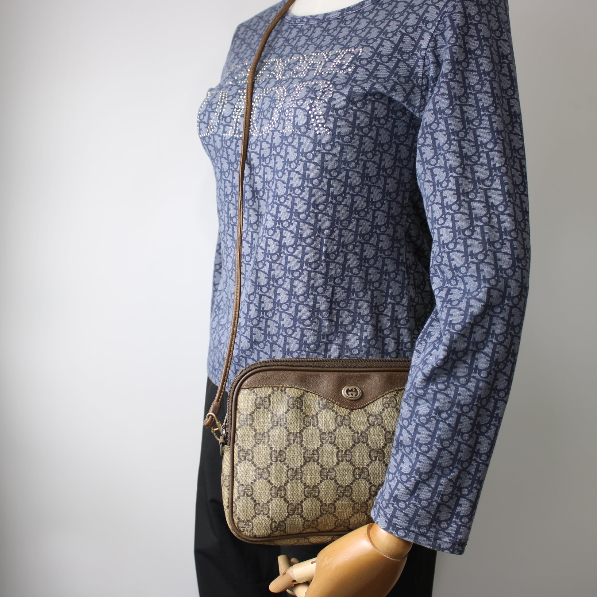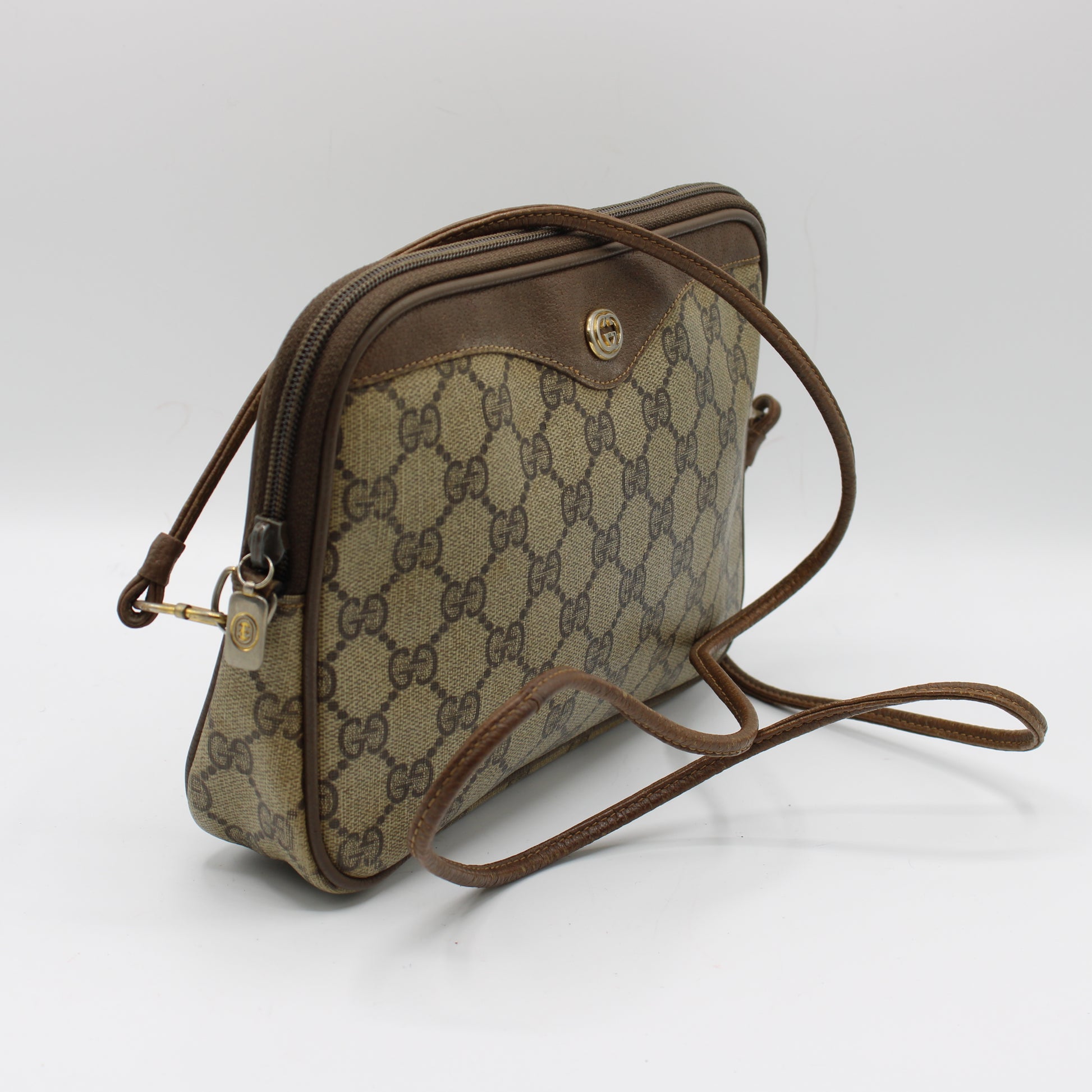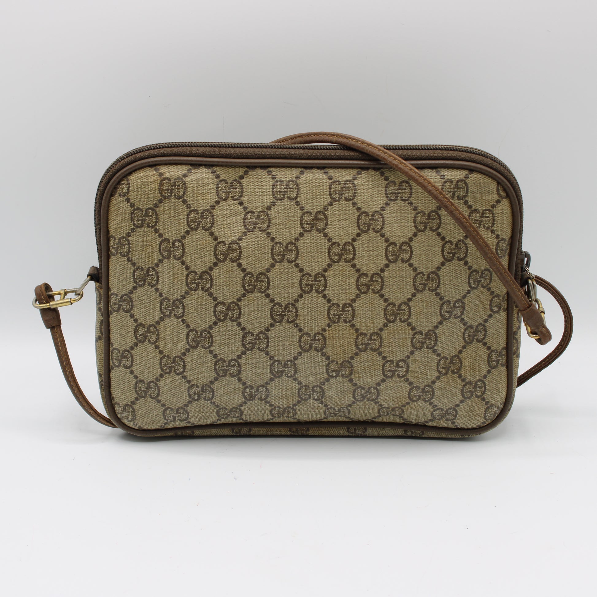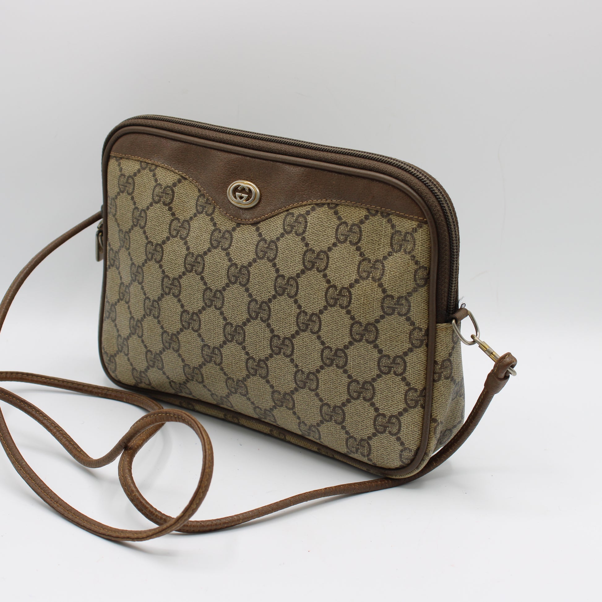 Stefany Bags Shoes and More presents this authentic vintage Gucci crossbody bag, crafted from the iconic GG monogram canvas with rich brown leather trim and a matching leather strap. A timeless piece from the Gucci Accessory Collection, this structured silhouette features the instantly recognizable interlocking GG pattern and a top zip closure adorned with vintage gold-tone hardware. The bag includes a removable leather shoulder strap for versatile styling—wear it as a shoulder bag or detach the strap for use as a clutch.