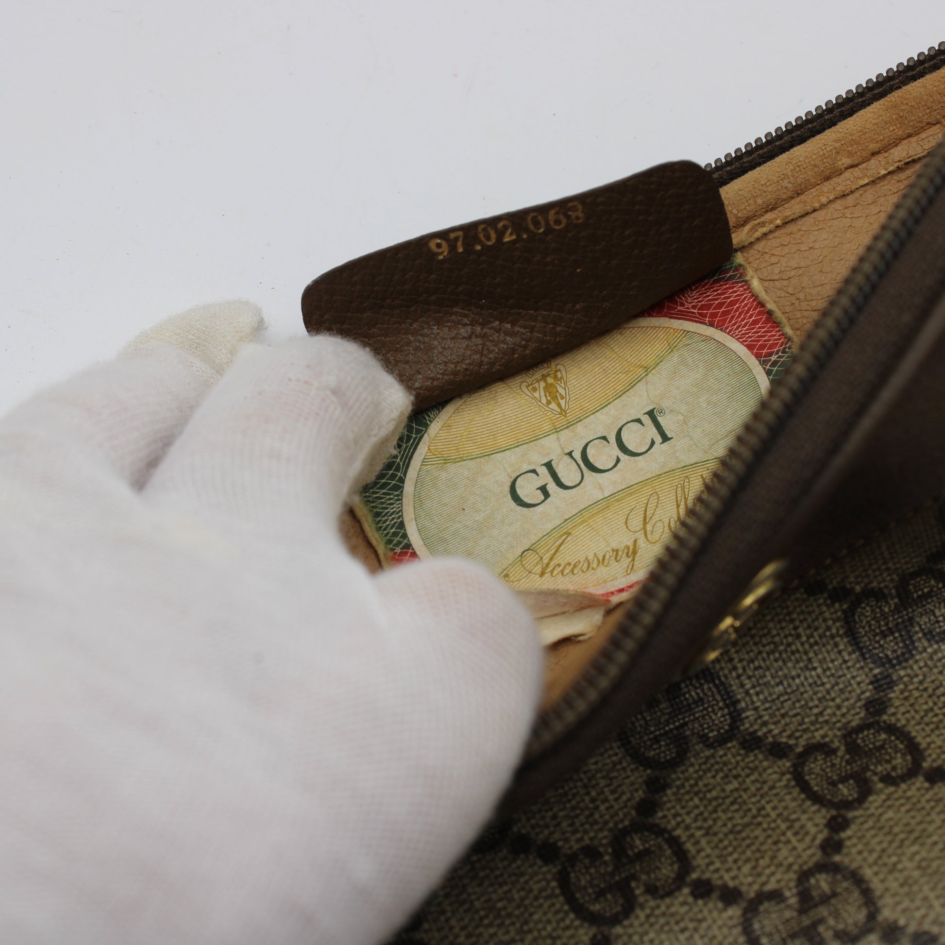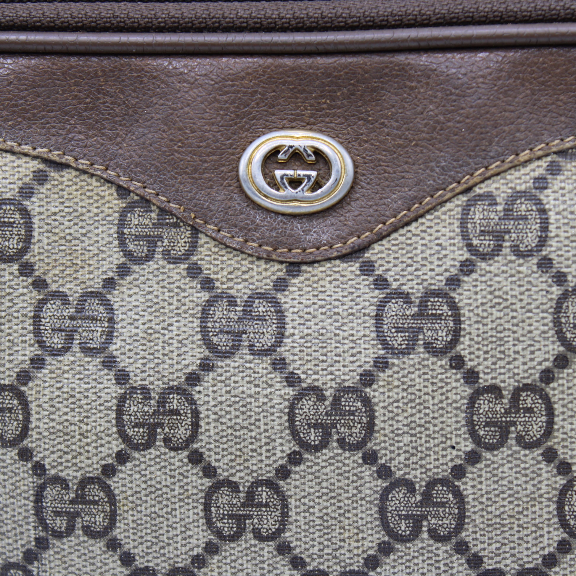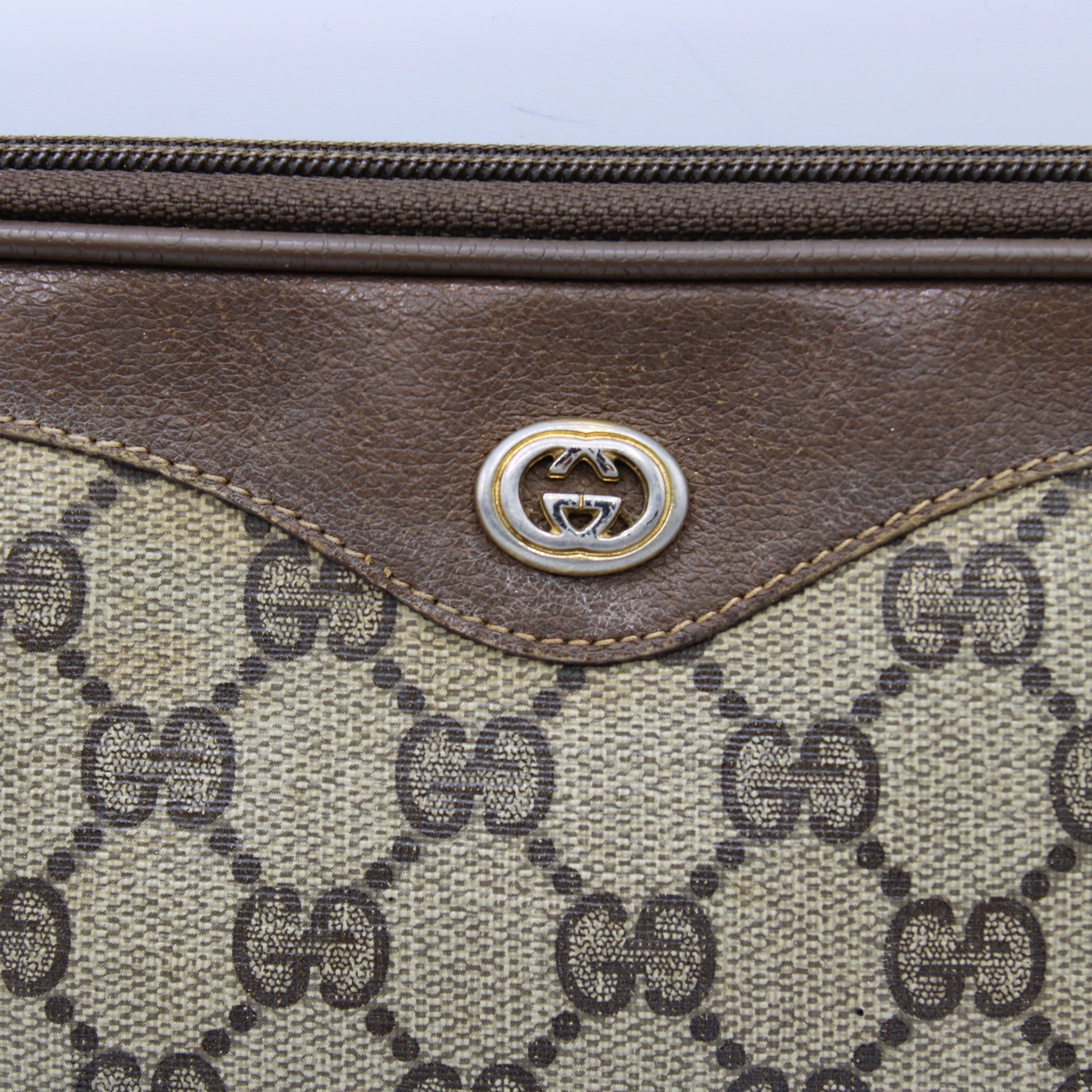 Stefany Bags Shoes and More presents this authentic vintage Gucci crossbody bag, crafted from the iconic GG monogram canvas with rich brown leather trim and a matching leather strap. A timeless piece from the Gucci Accessory Collection, this structured silhouette features the instantly recognizable interlocking GG pattern and a top zip closure adorned with vintage gold-tone hardware. The bag includes a removable leather shoulder strap for versatile styling—wear it as a shoulder bag or detach the strap for use as a clutch.