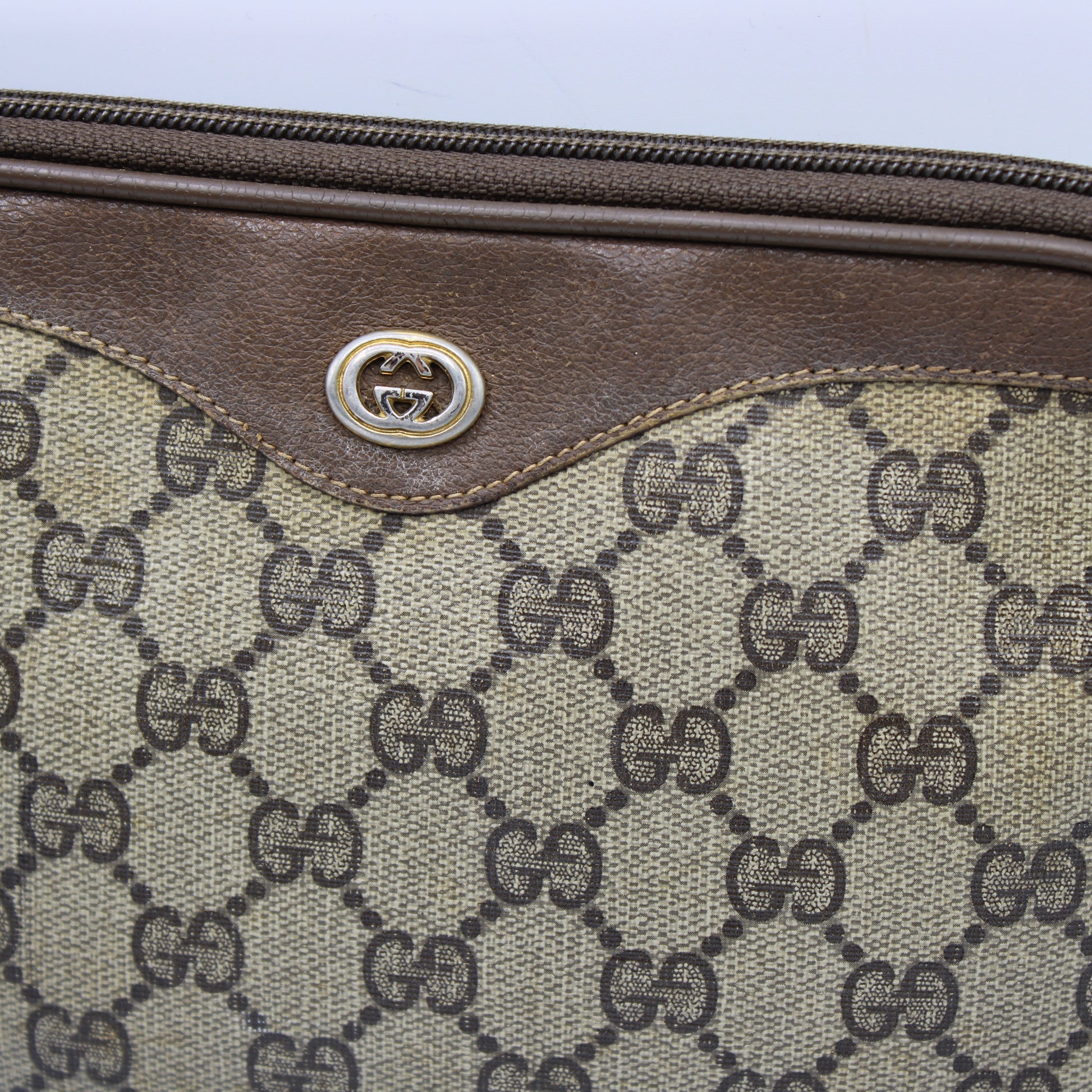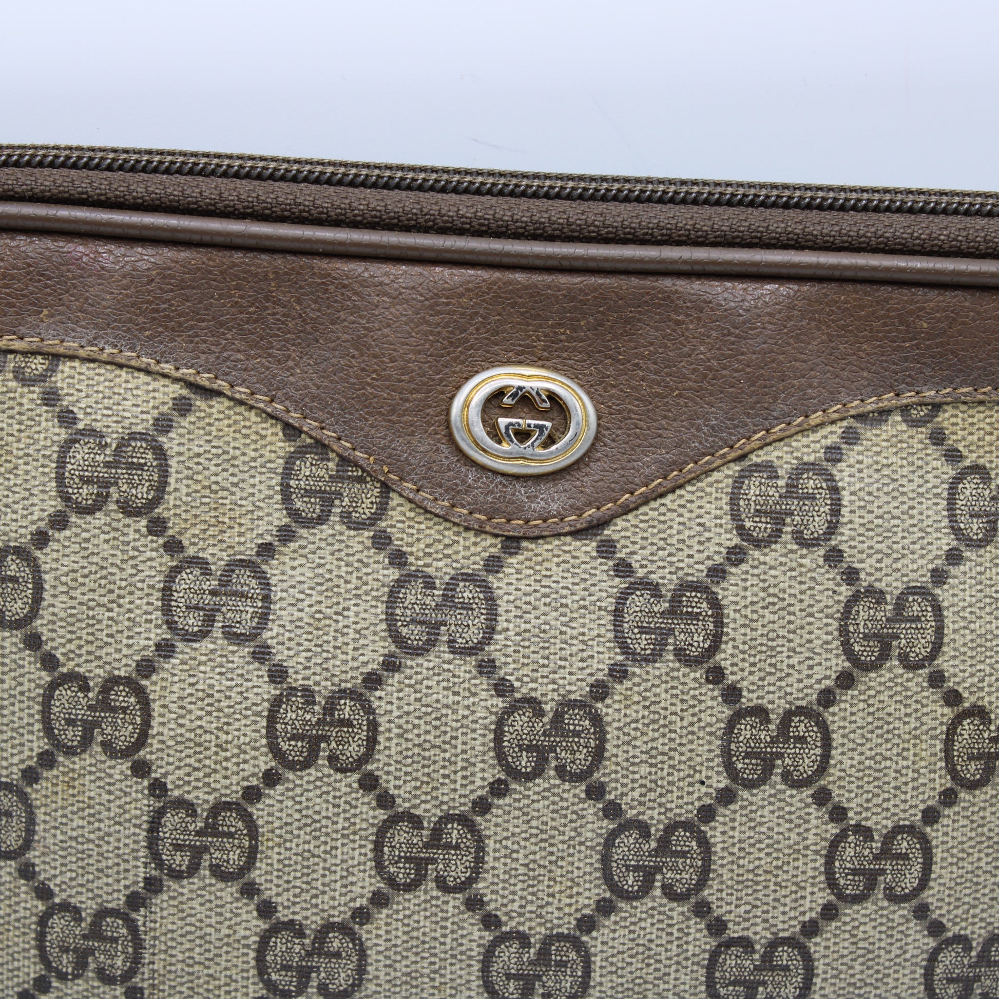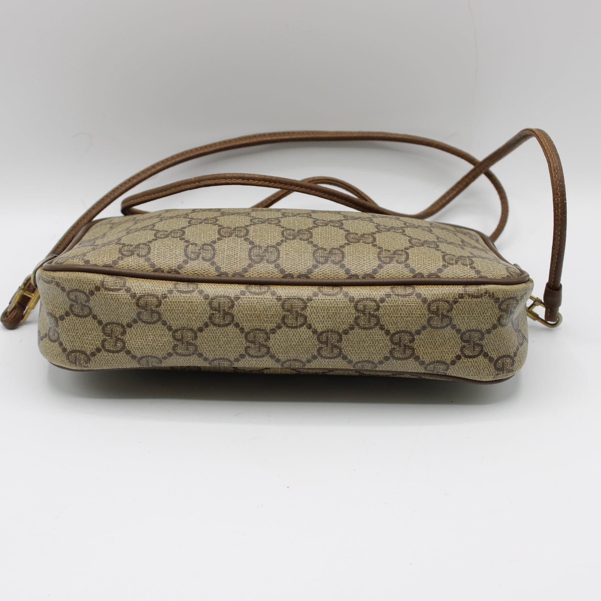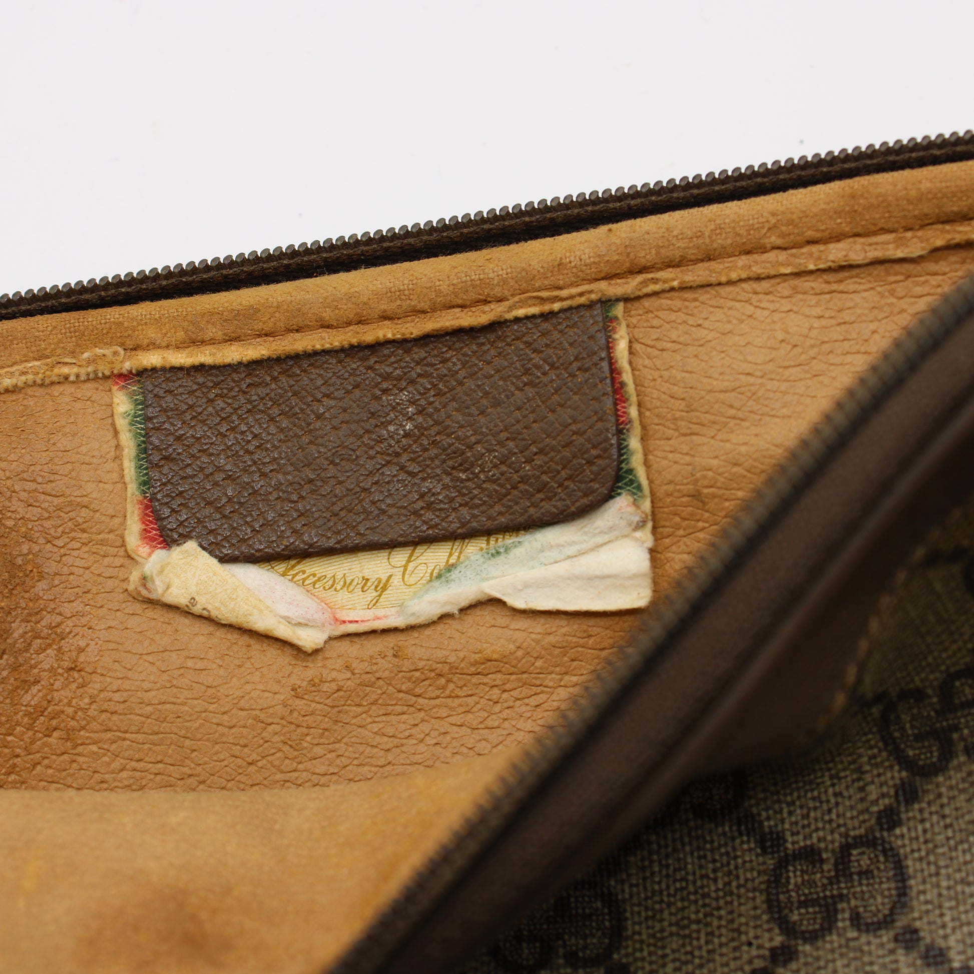 Stefany Bags Shoes and More presents this authentic vintage Gucci crossbody bag, crafted from the iconic GG monogram canvas with rich brown leather trim and a matching leather strap. A timeless piece from the Gucci Accessory Collection, this structured silhouette features the instantly recognizable interlocking GG pattern and a top zip closure adorned with vintage gold-tone hardware. The bag includes a removable leather shoulder strap for versatile styling—wear it as a shoulder bag or detach the strap for use as a clutch.