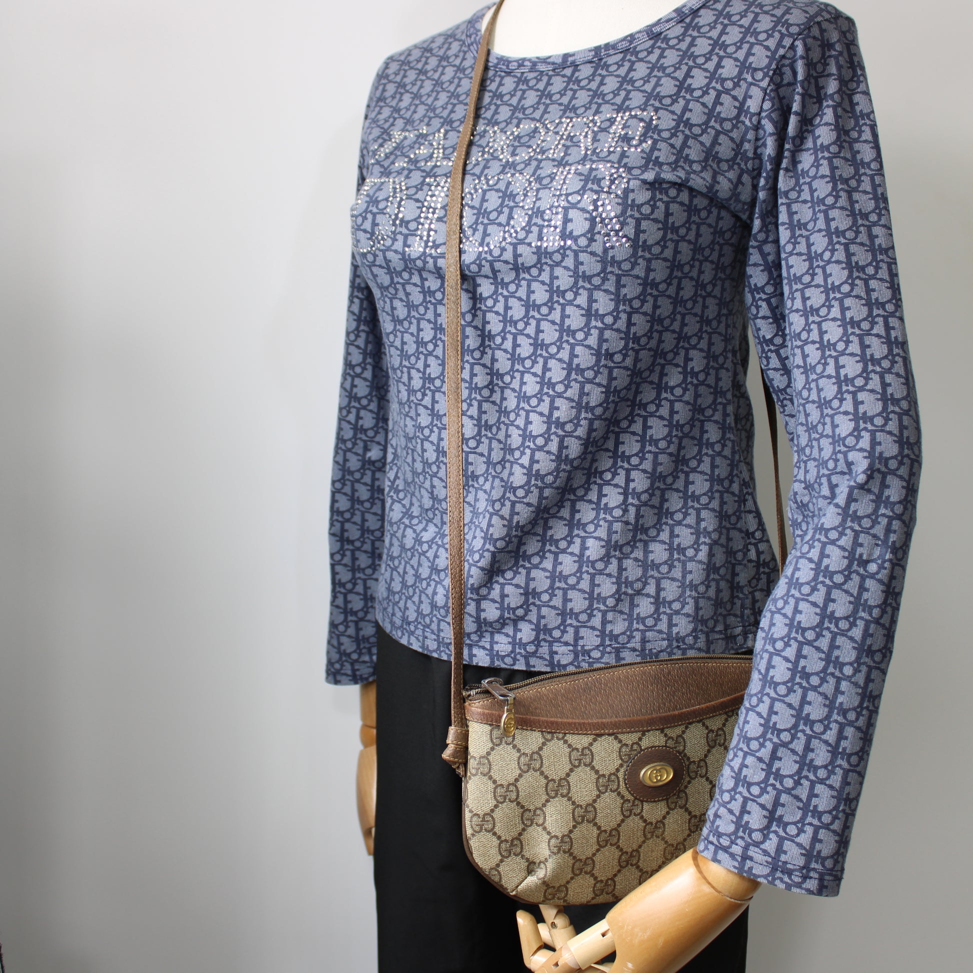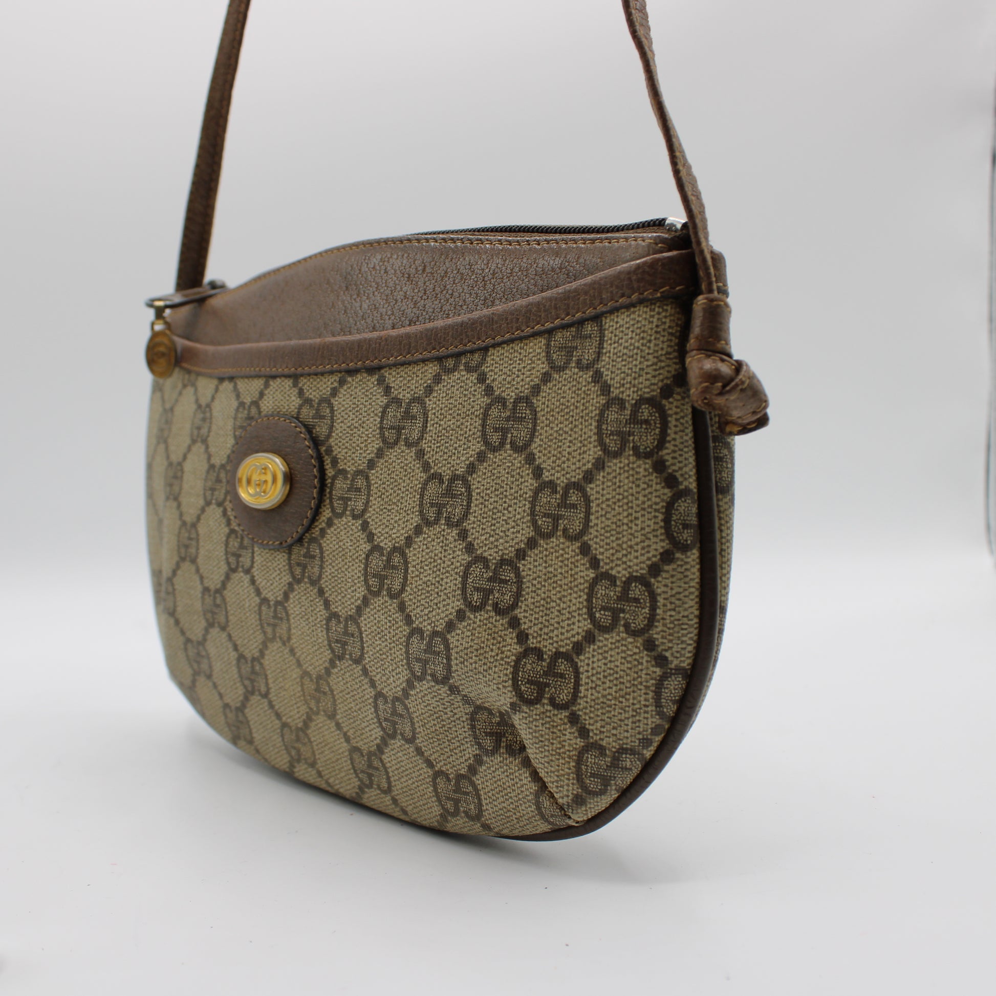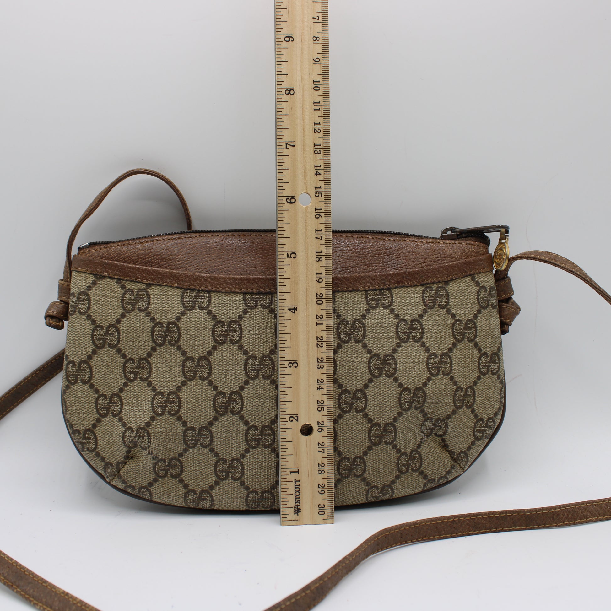Stefany Bags Shoes and More presents this authentic vintage Gucci mini crossbody bag from the iconic Gucci Accessory Collection, crafted in Italy from GG coated canvas and accented with rich brown leather trim. The timeless GG monogram canvas is complemented by a smooth leather top and strap, creating a practical yet luxurious everyday silhouette. Featuring both front and back slip pockets and a top zip closure, this compact bag is perfect for hands-free styling. A vintage gold-tone GG emblem and leather zipper pull with the original Gucci medallion enhance its heritage feel. Sized at approximately 9 x 5 inches, it's ideal for carrying essentials with ease and style.