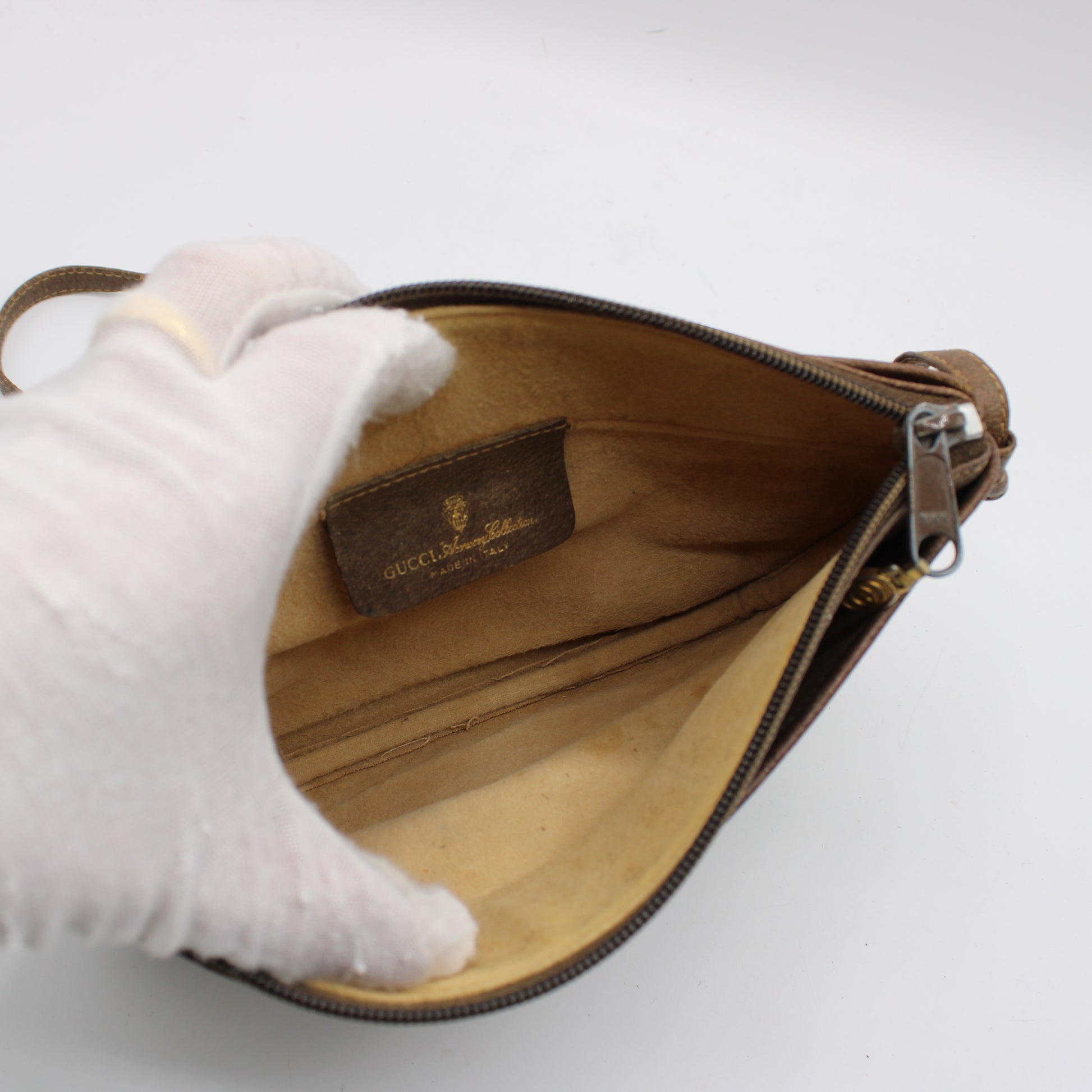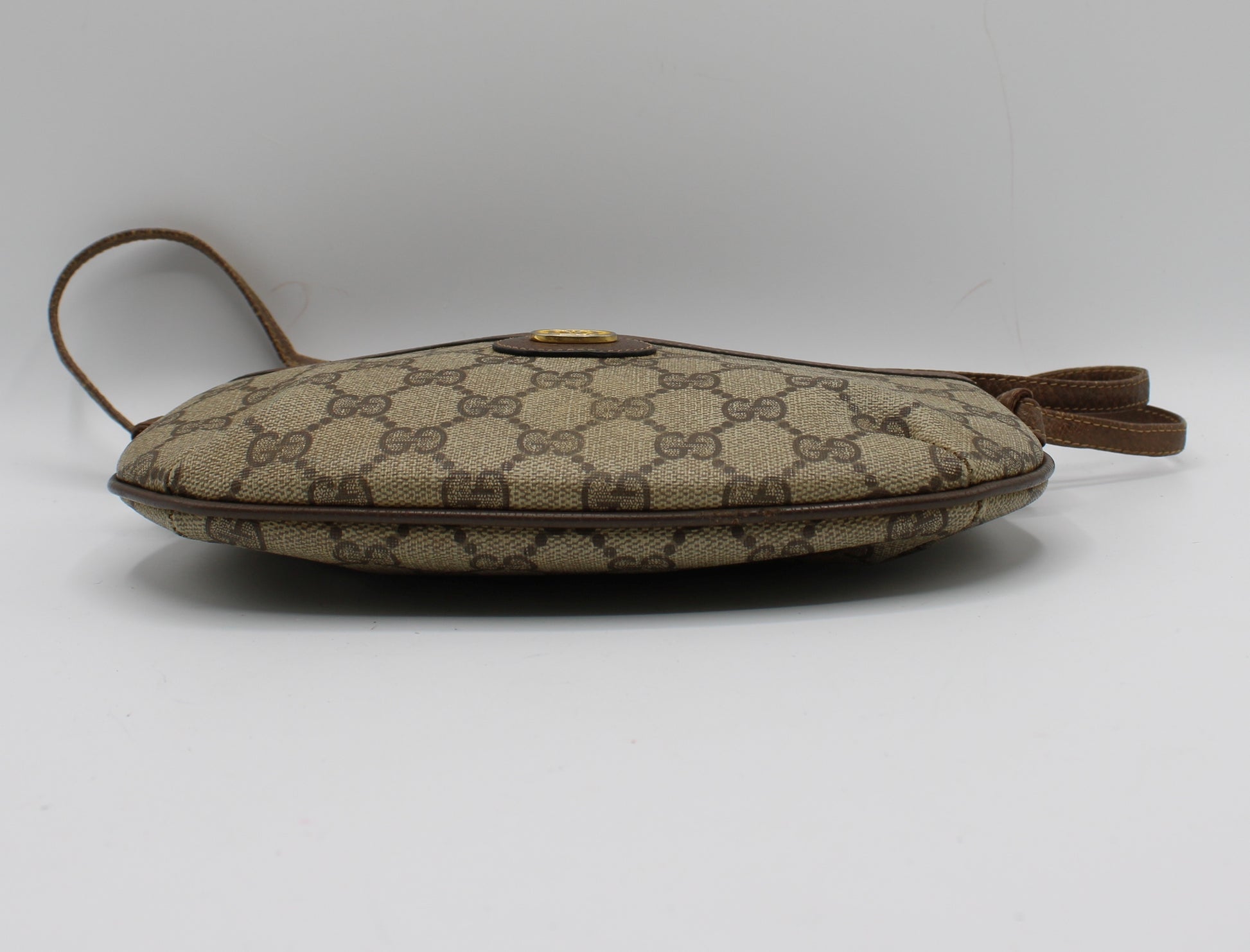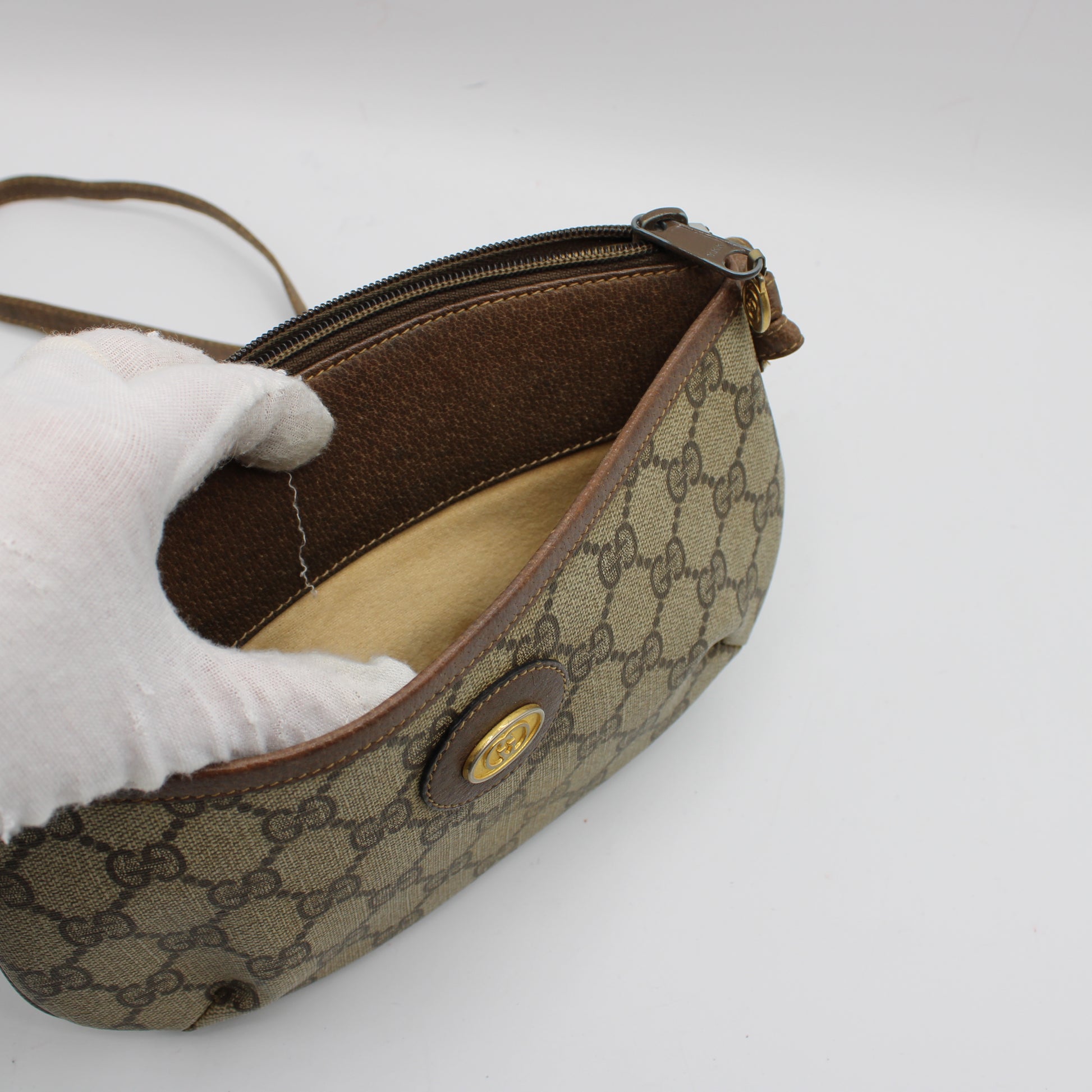 This vintage Gucci piece is in very good condition, showing only minor signs of wear consistent with age and use. There is light rubbing on the leather corners and light discoloration on the interior lining, but none of these affect its function or aesthetic when worn. The bag's structure remains intact, and the strap is still strong for daily wear. All details are well-preserved, and the monogram canvas remains vibrant and intact.
