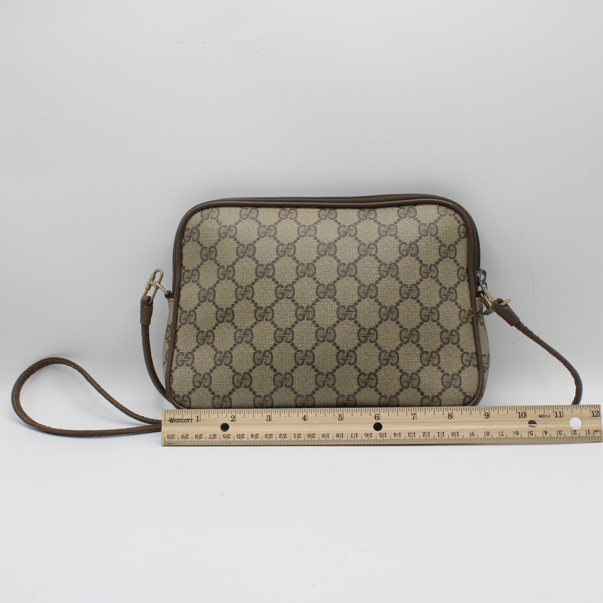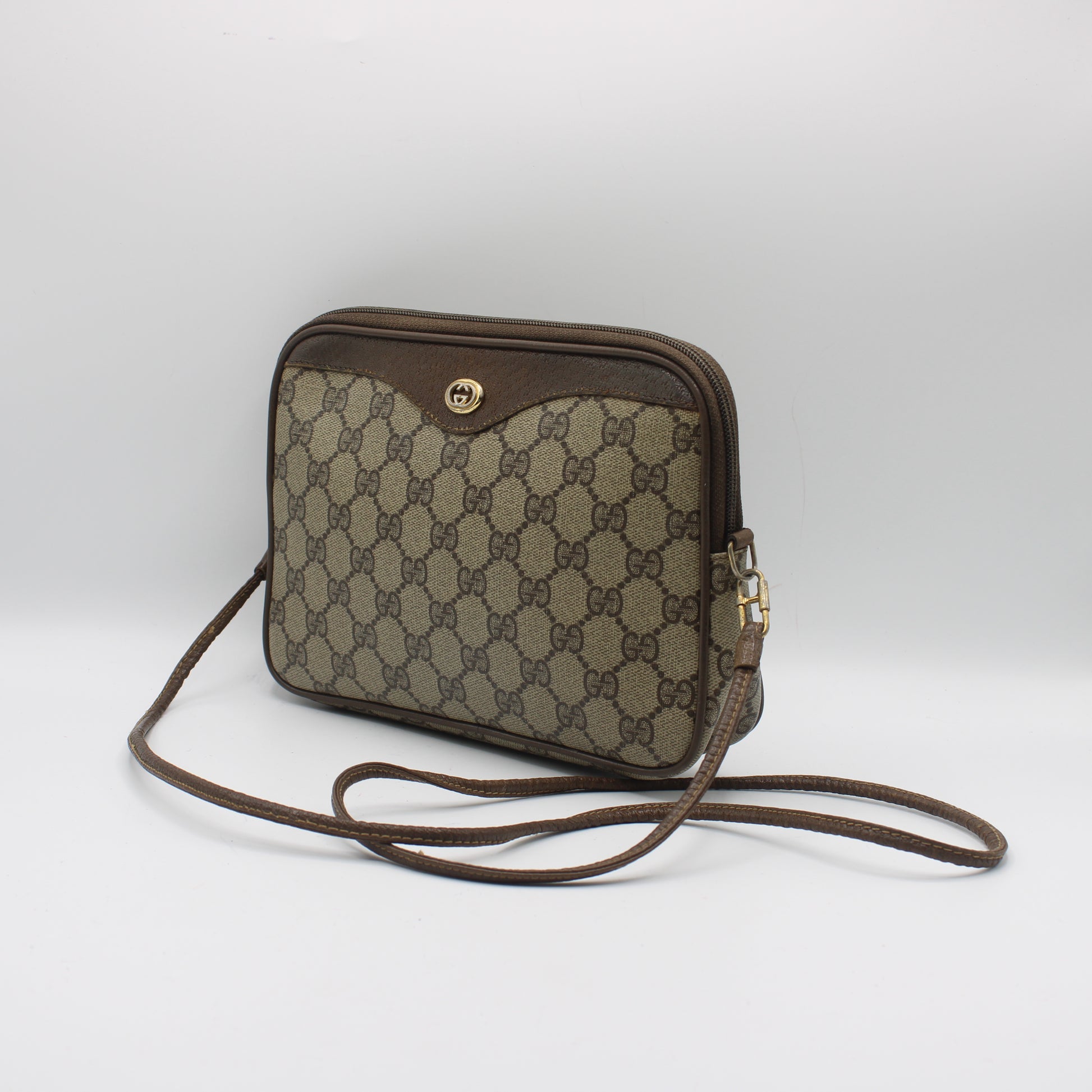 Stefany Bags Shoes and More presents this authentic vintage Gucci GG Supreme canvas bag, a timeless piece from the Gucci Accessory Collection. Crafted in Italy with the iconic beige GG coated canvas and finished with deep brown leather trim, this versatile bag features a sleek silhouette that seamlessly transitions from a crossbody to a clutch or pouch thanks to its removable leather strap. The classic oval gold GG emblem hardware at the front adds a signature touch of luxury to this elegant, minimalist design.