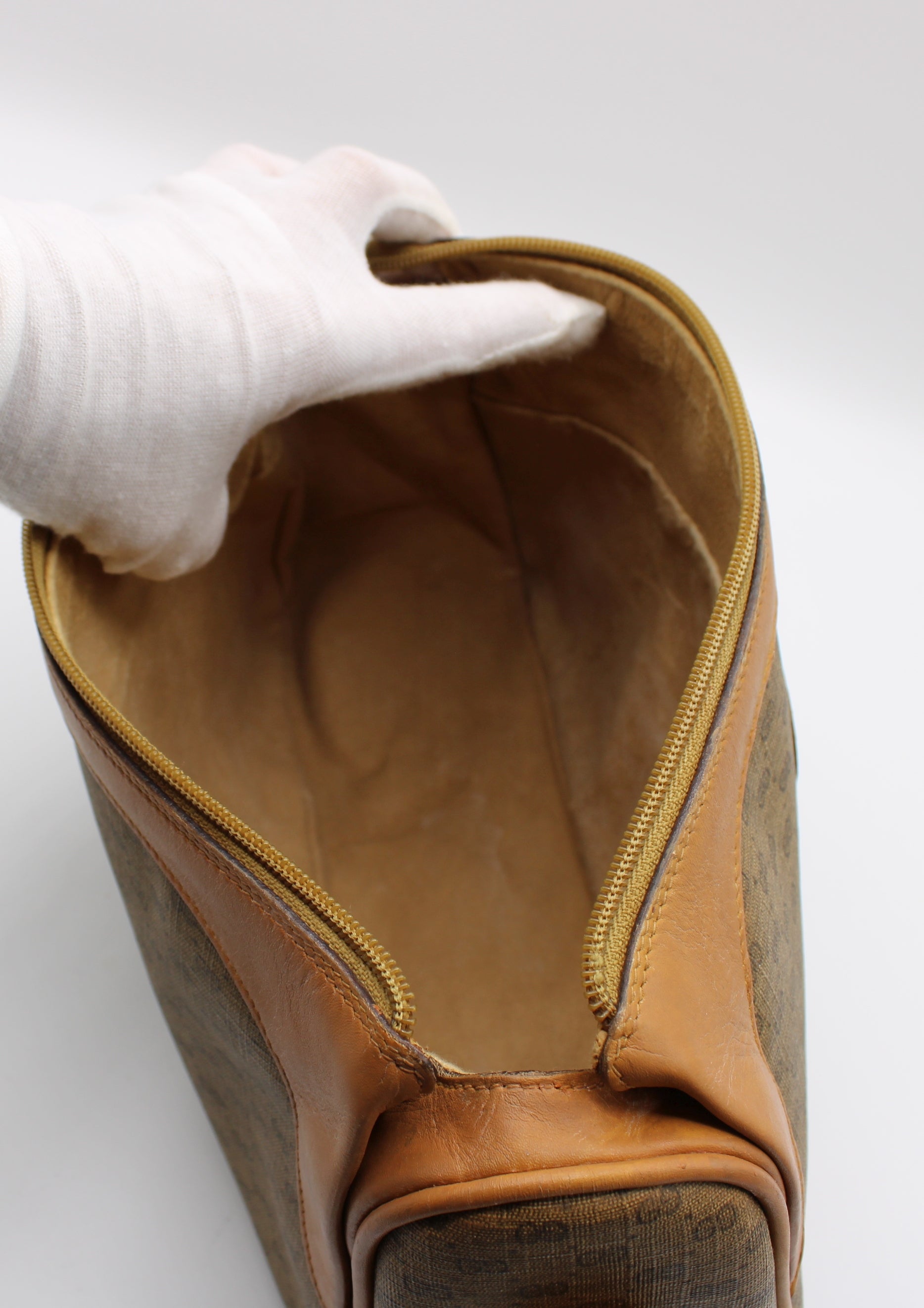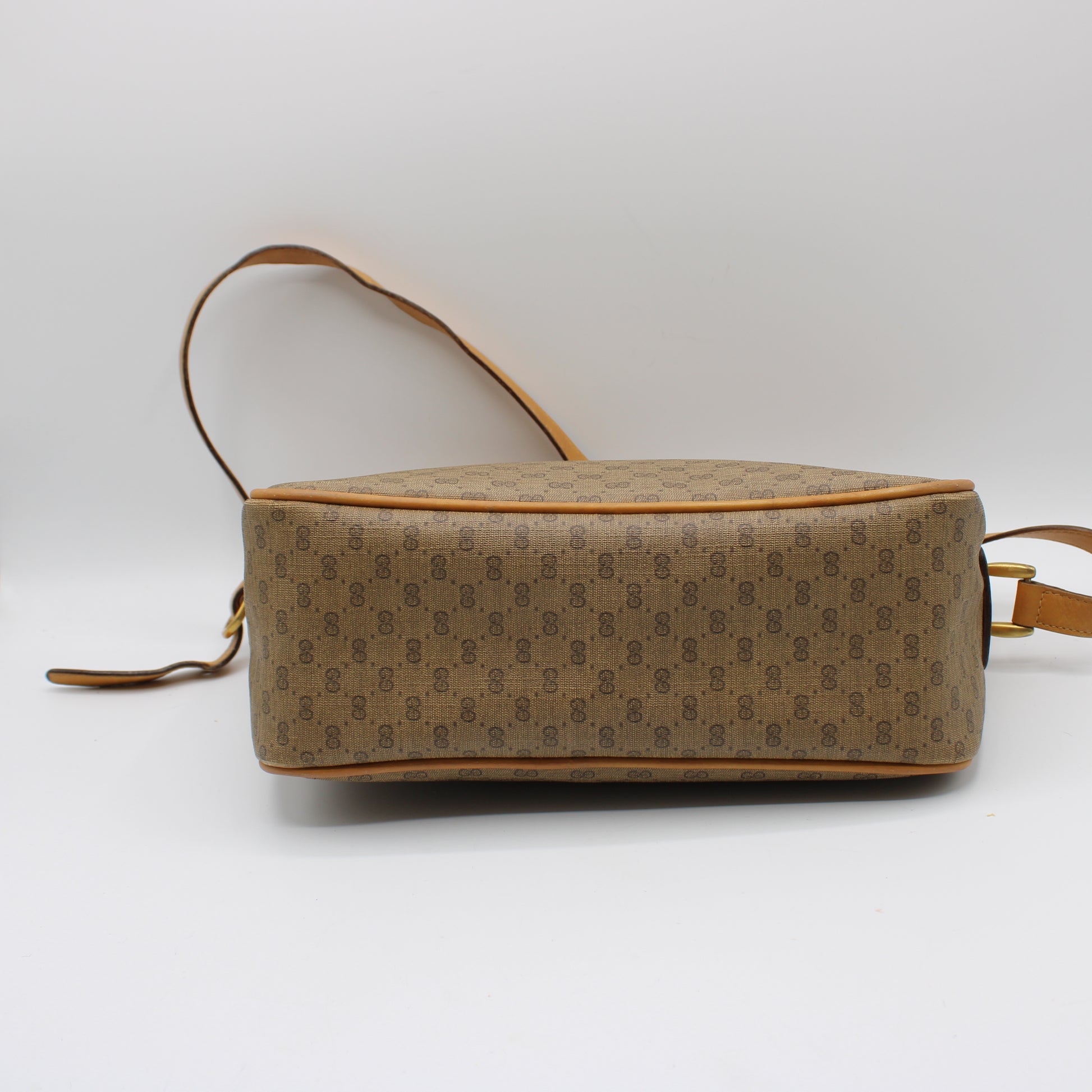 Stefany Bags Shoes and More is delighted to present this authentic Gucci Brown Monogram Canvas and Leather Crossbody Bag. This exquisite piece features Gucci's signature GG monogram pattern on durable canvas, complemented by luxurious tan leather trims and an adjustable leather strap. The front is adorned with a gold-tone Gucci logo plate, adding a touch of sophistication to this vintage treasure.