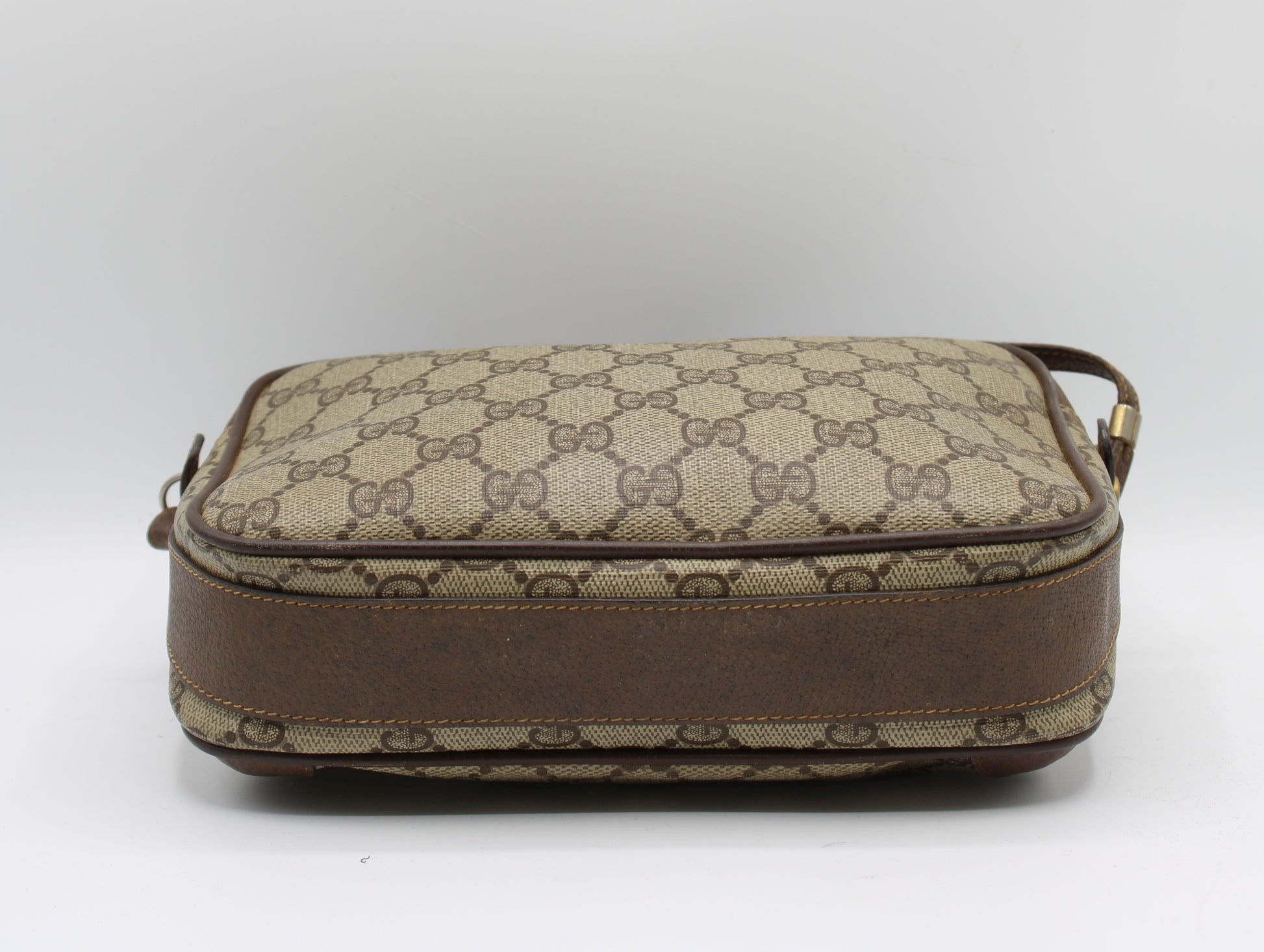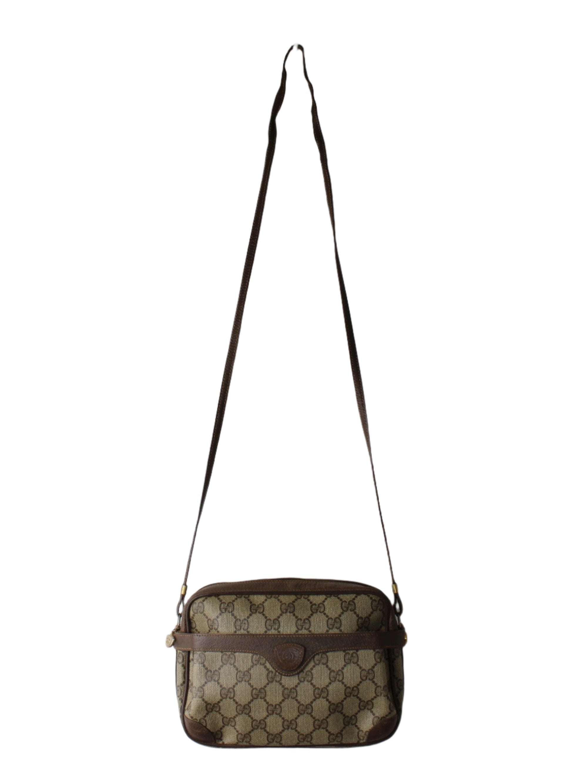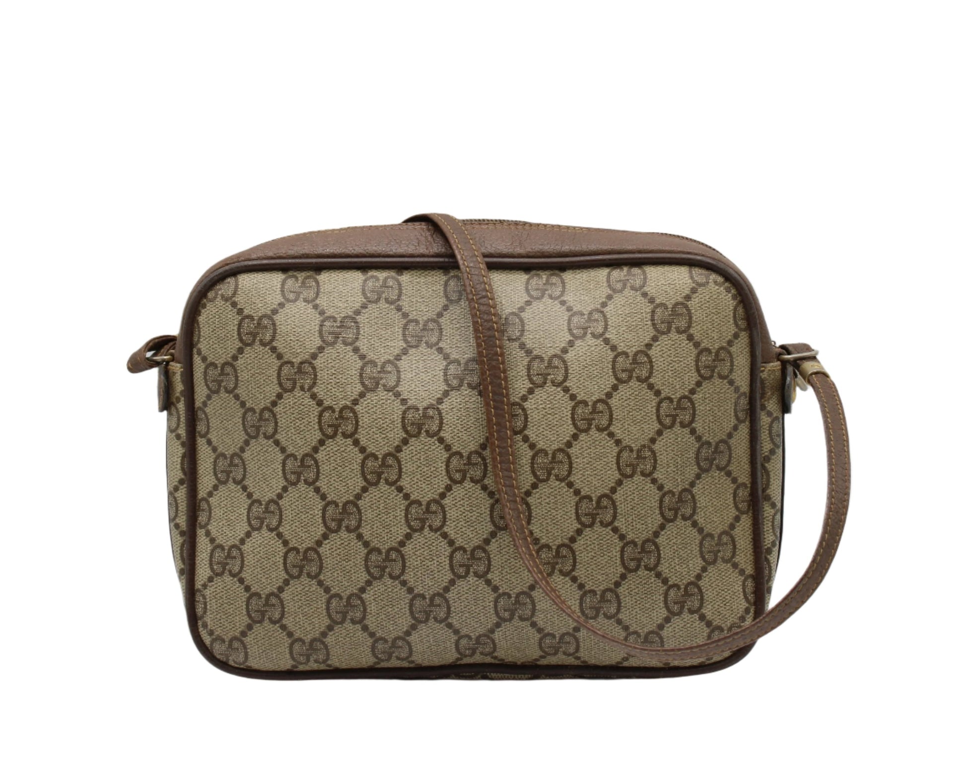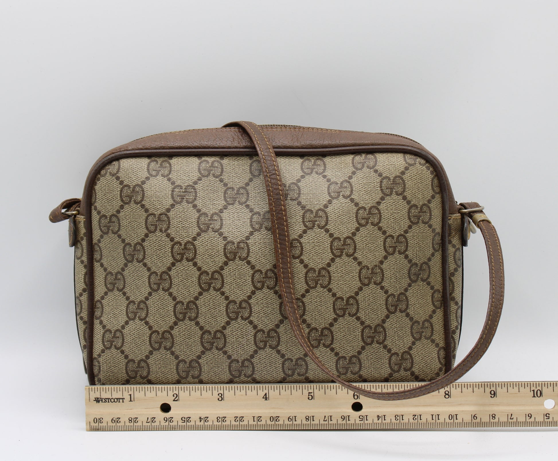 Stefany Bags Shoes and More offers this authentic vintage Gucci GG Canvas Crossbody Bag, featuring the signature GG monogram canvas paired with smooth brown leather trims. This timeless piece showcases Gucci's classic aesthetic with its embossed leather logo detail on the front pocket, adjustable leather strap, and gold-tone logo accents at the sides. Compact and versatile, the bag measures approximately 8 inches wide by 6 inches high, making it perfect for everyday use or casual outings.