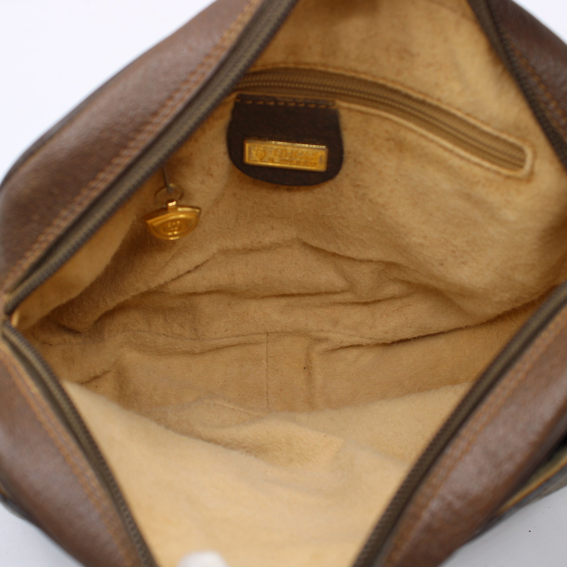 In very good condition, this vintage Gucci crossbody bag shows minimal signs of wear, with light scuffing on the leather trim and some wear visible on the interior lining. These imperfections are consistent with gentle use and do not detract from the bag’s beauty or functionality. Its suede-lined interior features a zip pocket for added convenience, offering both style and practicality.